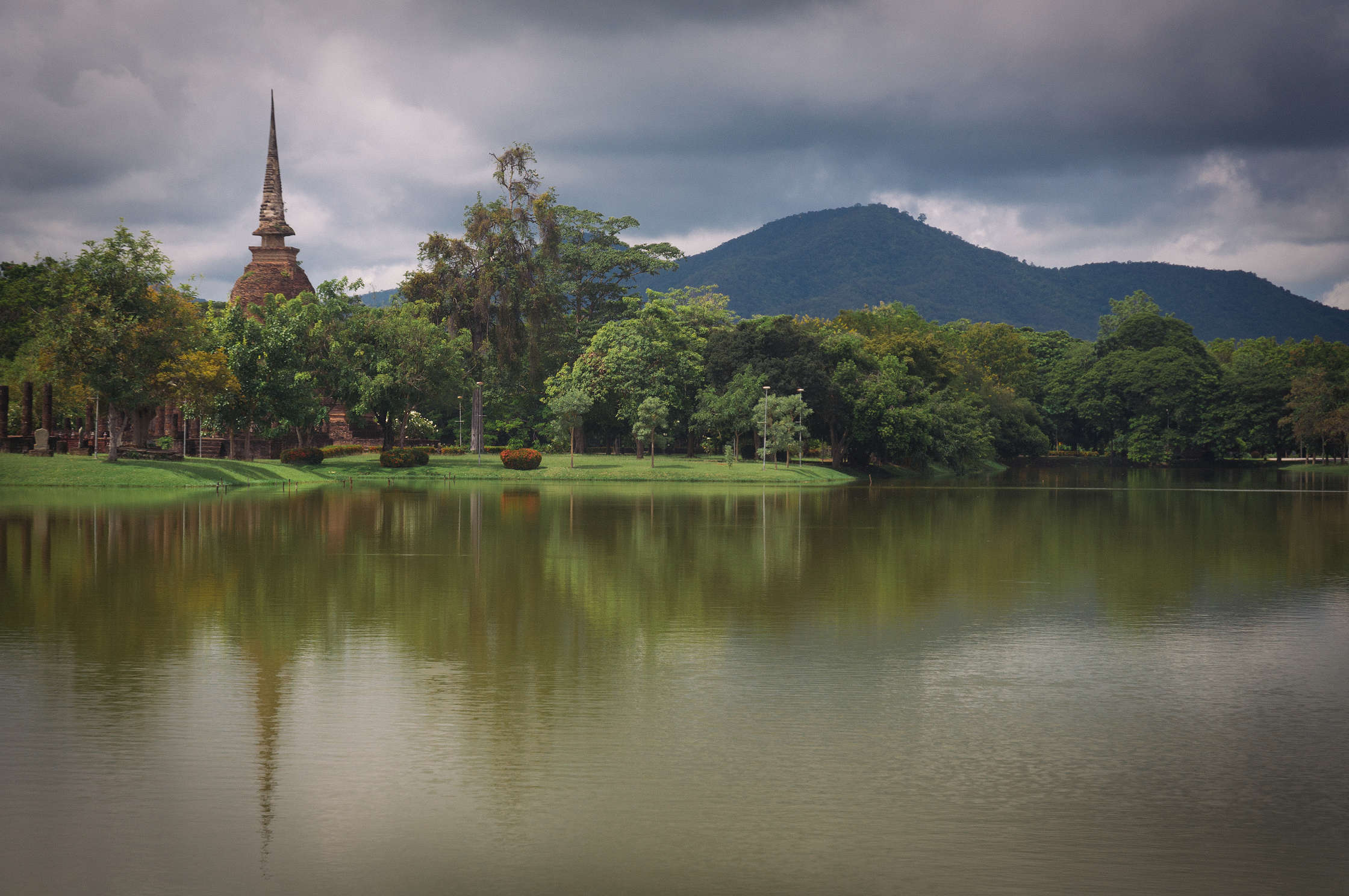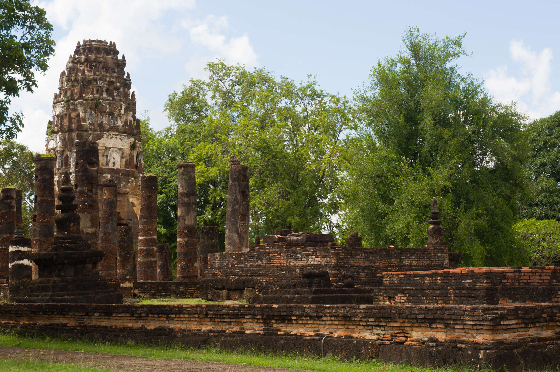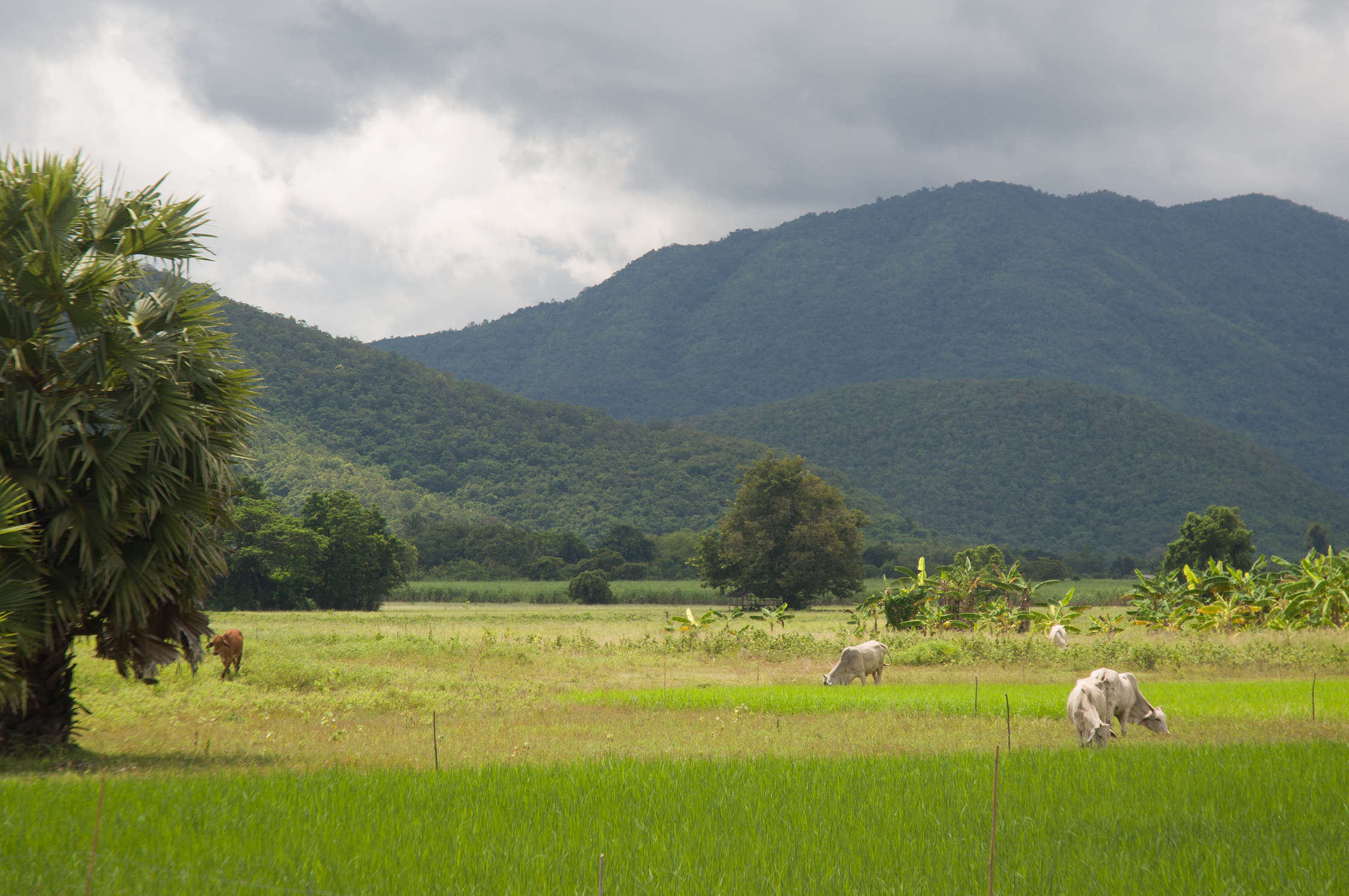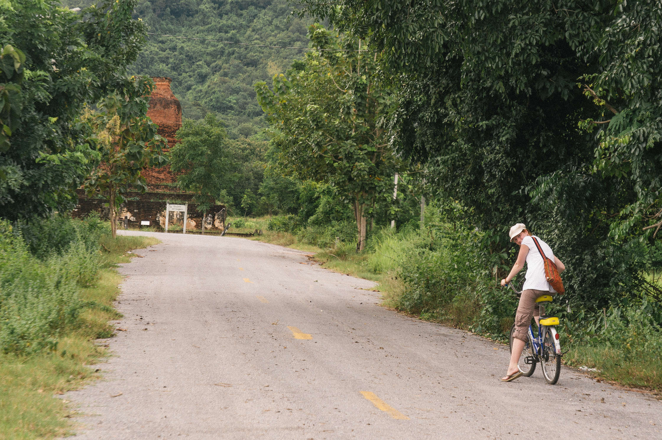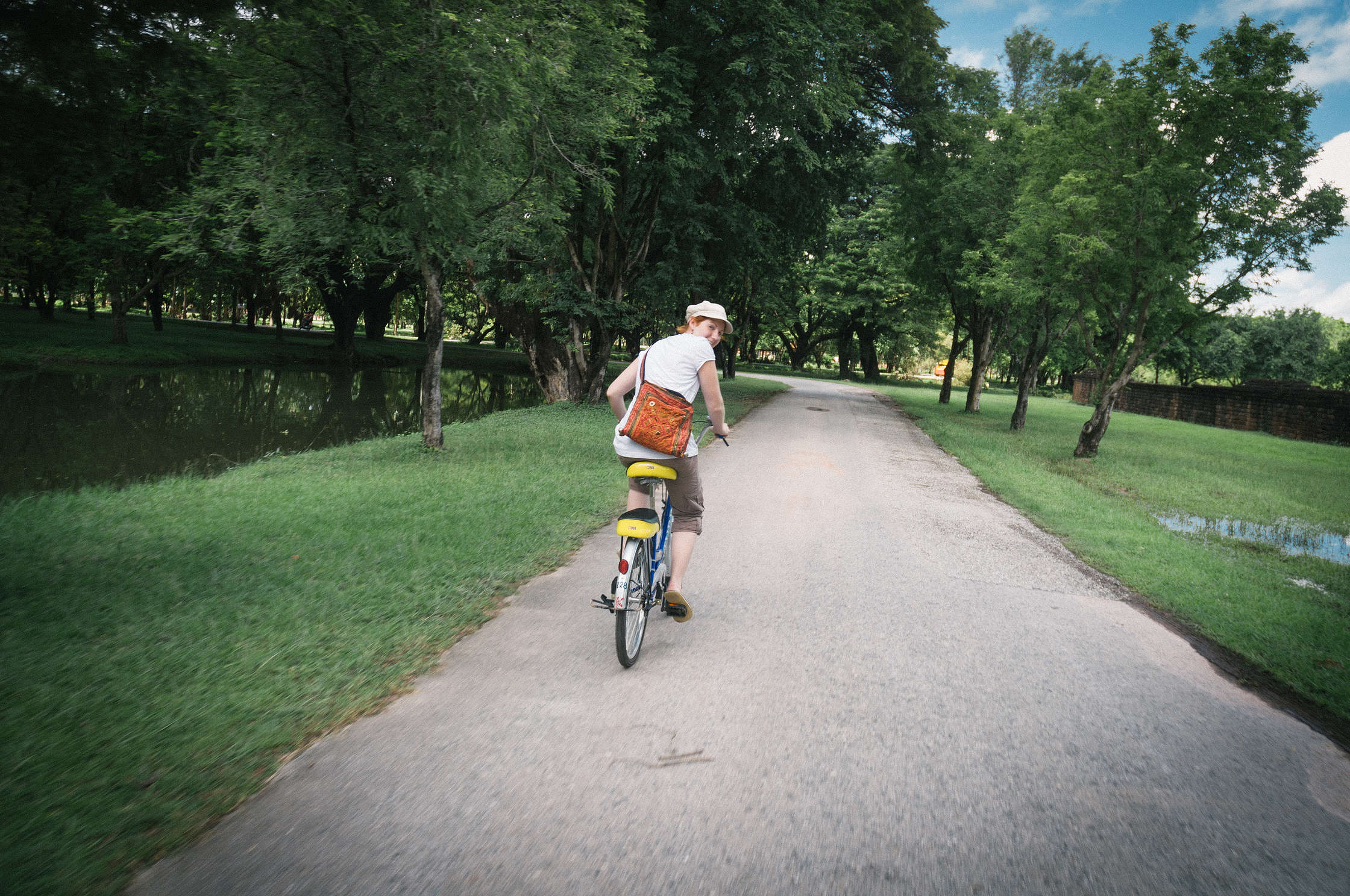 Uzreiz pie izkāpšanas no autobusa kautkāds sīks vecītis iegrūda rokās rajona karti, un praktiski piespieda noīrēt čīkstošus velosipēdus - par laimi tāpat to gribējām darīt, un šads “serviss” bija tieši laikā. Interesantā kārtā pie ieejas kompleksā bija milzīgs uzraksts ka no pirmā oktobra cenas tiek palielinātas no 150 uz 400 Baht, bet tante kas sēdēja būdiņā tieši blakus uzrakstam paņēma no mums 150. Vai nu nezināja ka ir 7. oktobris, vai nemācēja lasīt. Karstums šeit bija vienkārši dedzinošs, un braukalējot apkārt pamatīgi apdegām. Izbraukājām ne tikai visu kas bija apskatāms iekš senpilsētas sienām, bet arī aizbraucām apskatīt vietējos laukus, govis un pirmos kalnus. Pamatīgi izbraukājāmies, un īsi pirms atgriešanās pilsētā izlijām kārtējā 10 minūšu lietū. Kas pēc svilinošas saules bija ļoti patīkami.