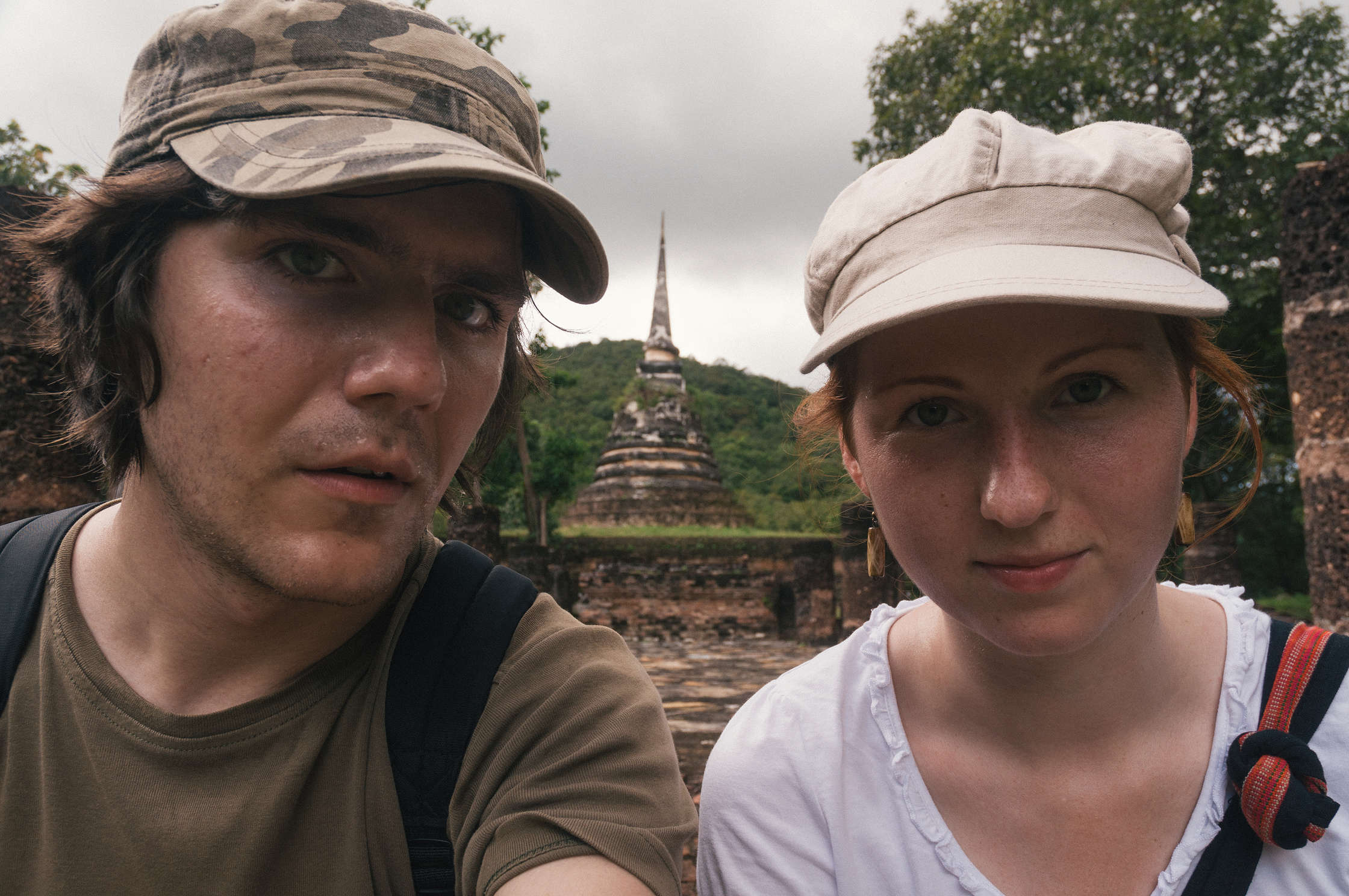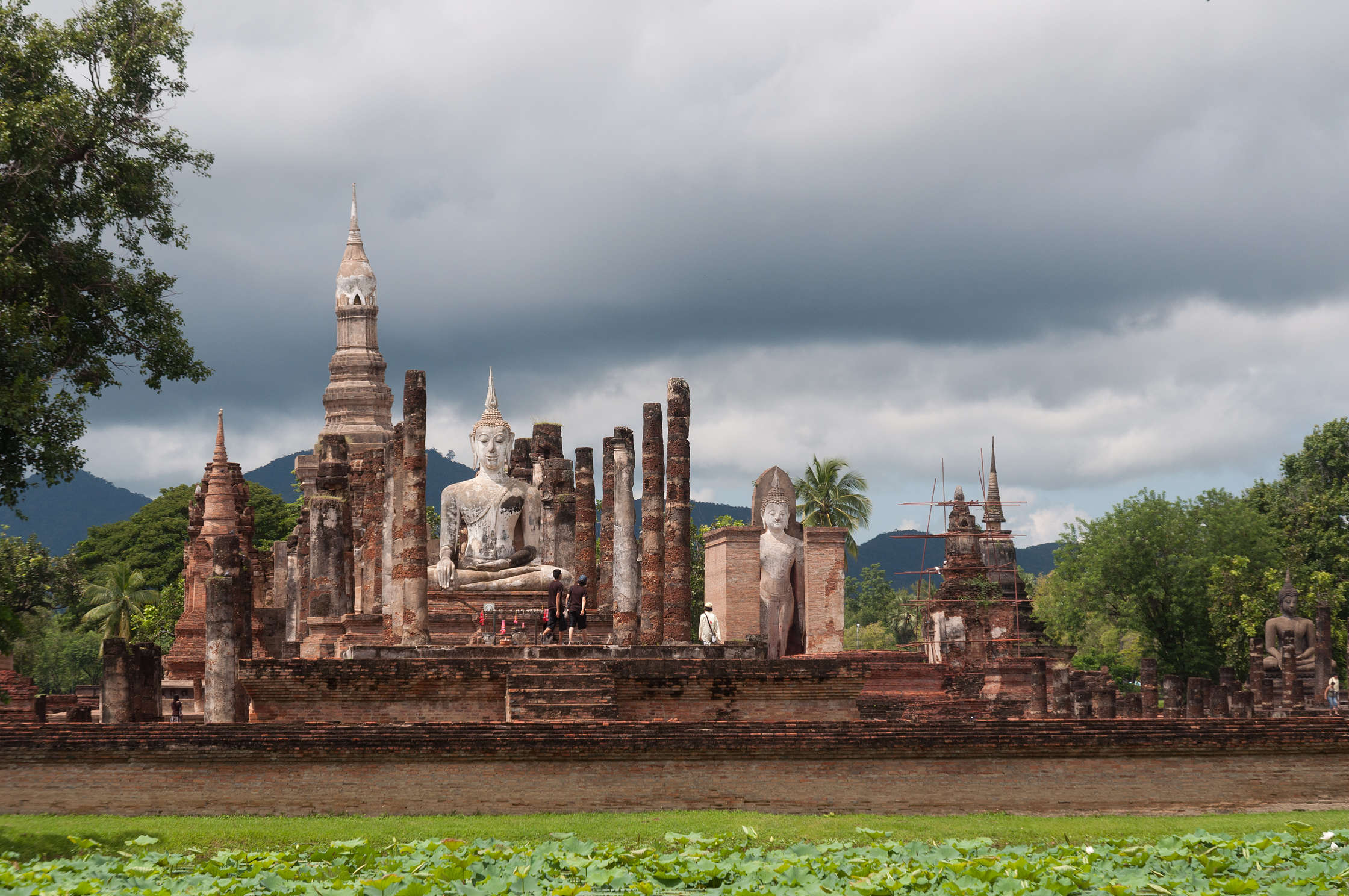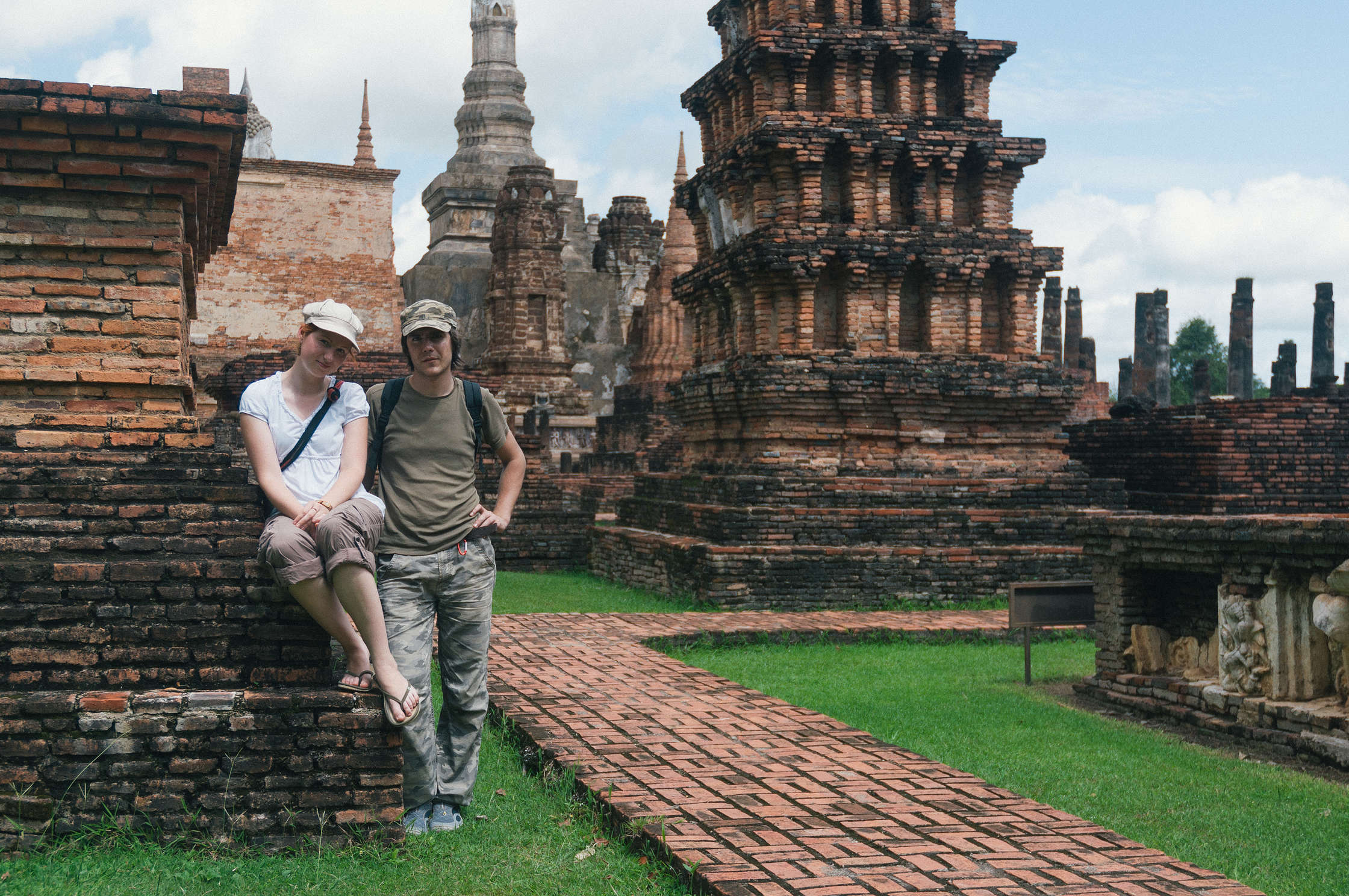 Brauciens uz Sukhotai bija visai dīvains, pirmkārt autobuss nobrauca pāris kilometrus, un visus pasažierus izmeta ārā kādā mazpilsētā, kur tālāk ar TukTuk vajadzēja braukt uz Autoostu, tur meklēt autobusu uz Tak, un mēģināt iestāstīt vadītājam ka mums vajag līdz Historical Ruins. Autobusā gāja televizors kurā rādija Tajiešu humora raidījumu, kurā tika parodēti baltie tūristi. Tajietis ar blondu parūku, tērpies šortās un vestē, dimdināja apkārt ar lielajiem pārgājiena zabakiem un skaļi smējās. Stilīgi protams, bet man bija sajūta ka tas tika speciāli mums uzlikts. Pati Sukhotai Historical Park ir sīka vieta, centrēta uz senu pilsētu, kurā daudz dažādu sagruvušu tempļu un lielu Budas statuju. Tur ir ļoti skaisti un tas viss komplekss ir vienkārši milzīgs. Daudz arhitektūras ir Khmēru laika, tapēc vietām izskatās pēc Angkor Wat, tikai protams mazākos izmēros.