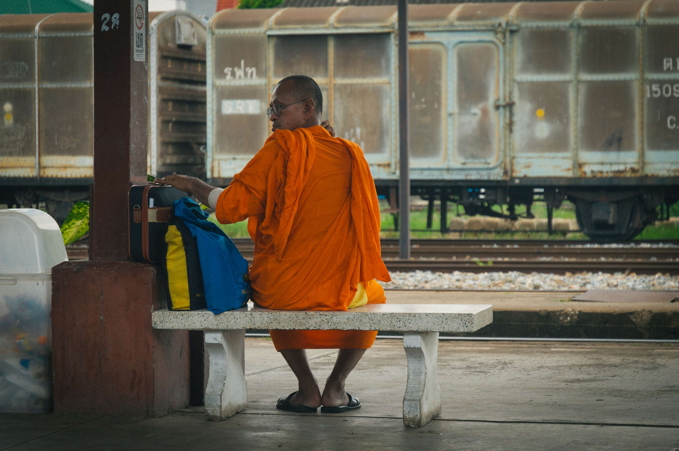 Stacijā uz soliņa paēdām, pavērojām kā sīkais ēd kukurūzas vālīti, kā sēž oranžs mūks, un kā policists salamā skeitboardistus no francijas, un tad jau bijām sēžamvagonā pa ceļam uz Chang Mai pilsētu, kas skaitās otra svarīgākā pilsēta Taizemē pēc Bangkokas. Vilciens veda mūs caur visādiem fantastiskiem skatiem, kalniem, džungļiem un tuneļiem, brauciens bija tiešām lielisks. Lasīju ka autobuss braucot pa garlaicīgu apvidu, kā jau parasti ap šosejām, tapēc vienmēr pēc iespējas braucām ar vilcienu - tas galu galā ir arī daudz ērtāks.