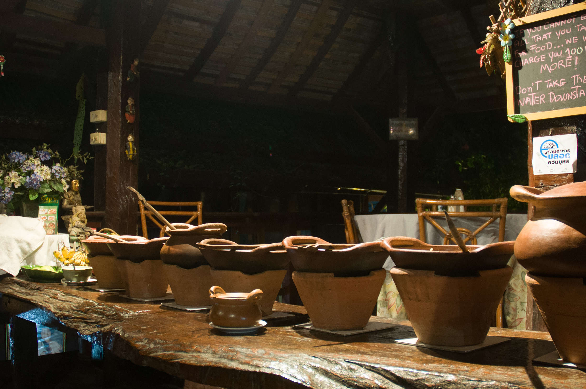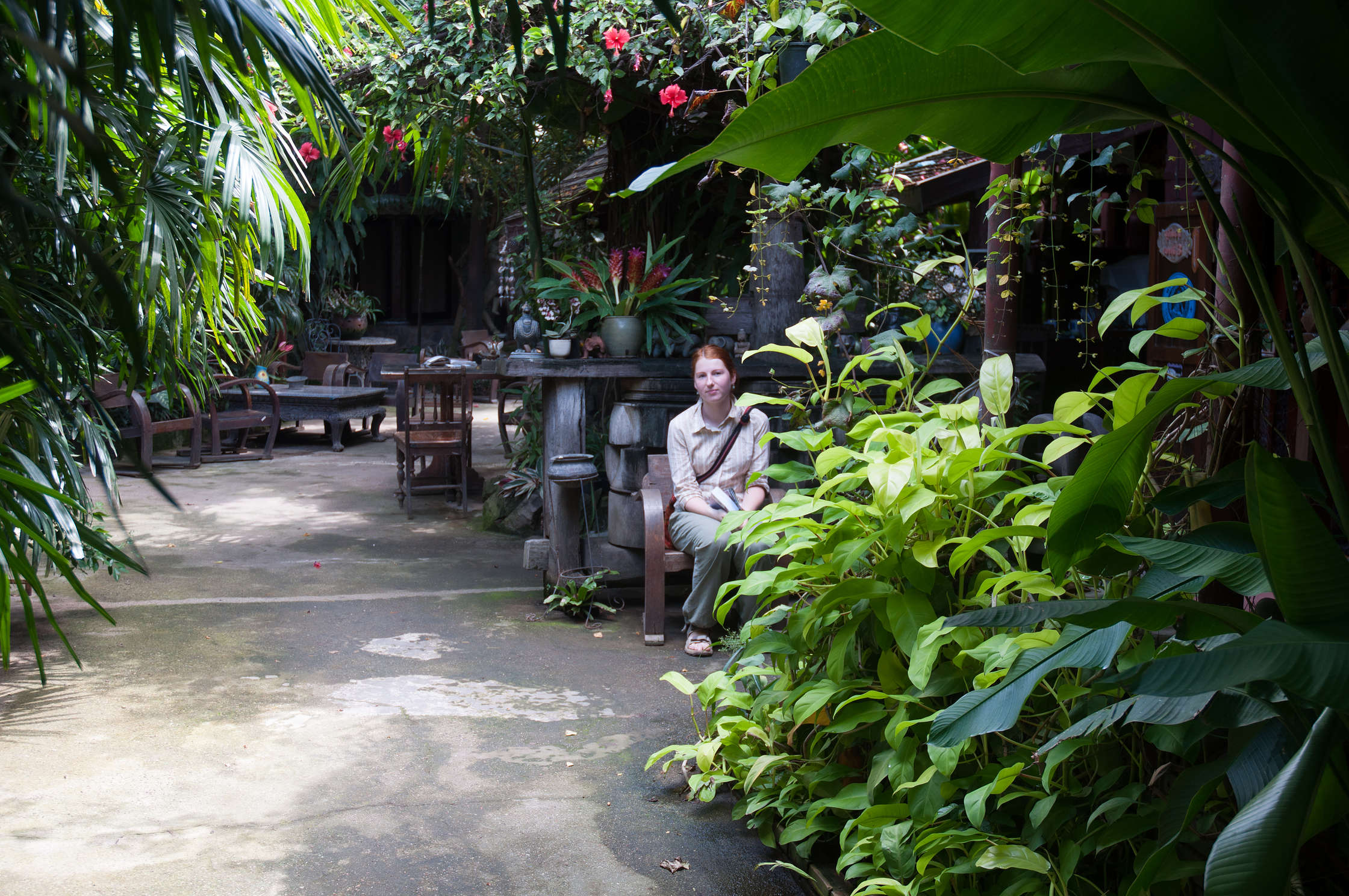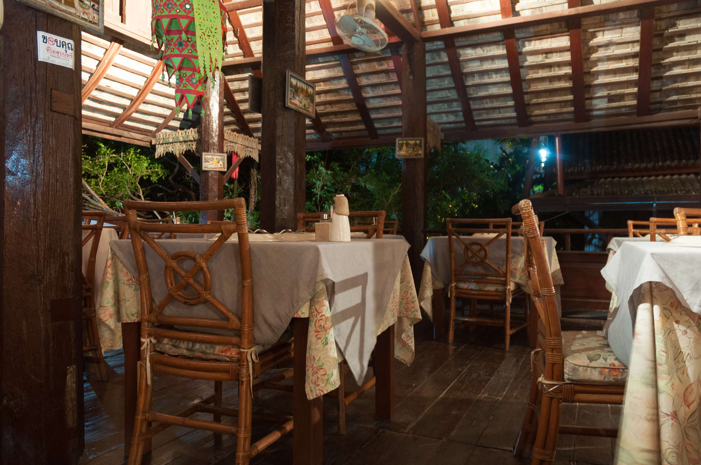Chiang Mai ieradāmies jau tumsā, un mums uzbruka vesels bars ar kliedzošiem un ļoti uzmācīgiem TukTuk šoferiem, kas mani pamatīgi nokaitināja un samaitāja garastāvokli. Ar kājām aizgājām labu gabalu no stacijas, un tur (kā parasti) dabujām miermīlīgāku TukTukistu par puscenu. Protams ka aizveda mūs uz nepareizo Tirgus laukumu, un to es secināju kad braucamais jau bija gabala, tā kā nācās vien līdz paredzamajai naktsmītnei doties kādus 2km ar kājām. Tas nekas - nedaudz apskatīsim pilsētu. Vispār pirmais iespaids bija visai bēdīgs, jo naktsdzīve gāja pilnā sparā, un visur manīja resnus vecus baltos sekstūristus ar jaunām Tajiešu meitenītēm pie rokas. Vēmiens nāk. Palaimējās, un mūsu hotelis atradās ļoti (ļoti!) klusā un tumšā šķērsieliņā, un bija ļoti skaists un mājīgs. Viss iekšpagalms bija kā tāda džungļu māja Rīgas Bot.dārzā, viss zaļš un aizaudzis visādiem ziediem. Arī vietējā ēstuve bija fantastiska, turklāt vegetarian-only. Vienīgais mīnuss - Norai izdevās kautkur pa vidu starp reģistrāciju, vakariņām, un istabu pazaudēt maku ar saviem 15ls (tur tā ir liela nauda). Labi ka naudu bijām sadalījuši pa dažādām vietām, un īsti lielu robu mūsu budžetā tas neizgrieza.