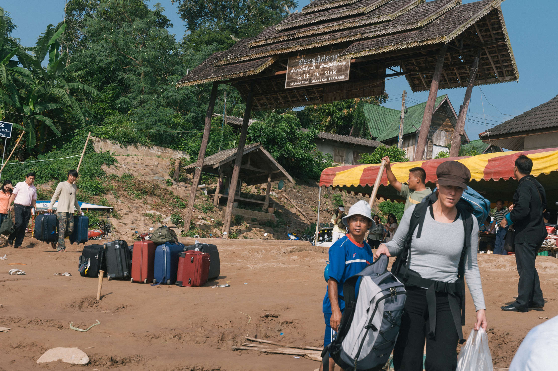 No rīta savācām mantiņas, un devāmies pāri ielai uz brokastu ēstuvi, pie sava jaunā drauga, kurš mums sarunāts par transportu pāri robežai. Bez mums pāri robežai dodas arī trīs jauni džeki, vienam no kuriem ir plastmasas roka, kas gan viņam netraucē būt stilīgākajam no viņiem visiem. Sakāpjam džipa kravaskastē un tiekam aizvesti līdz upei, kur priekšā samērā milzīga rinda cilvēku, kuri cenšas izreģistrēties Taizemes immigration office. Mūsu vedējs savāc mūsu pases, un ielien bez rindas nokārtot papīrus. Tiesa, prasa viņam tas teju tikpat laika cik mums būtu izstāvēt rindu, bet te nu viņš atgriežas, norāda kurā laivā jāsēžas un pamāj ardievas. Tarkšķošajā laivā pametam “Gateway to Indochina” vārtus, un dodamies pretī otrajam Mekongas krastam, uz Houei Xai *, kur uzreiz sākas jau otrā rinda - pēc Lao vīzām (Lao par Laosu sauc sviestainās Franču rakstības dēļ, un īstenībā valsts ir Lao - franči to “s” beigās laikam neizrunā, bet Amerikāņi kautko nesaprata, un atstāja to burtu tur arī sev).