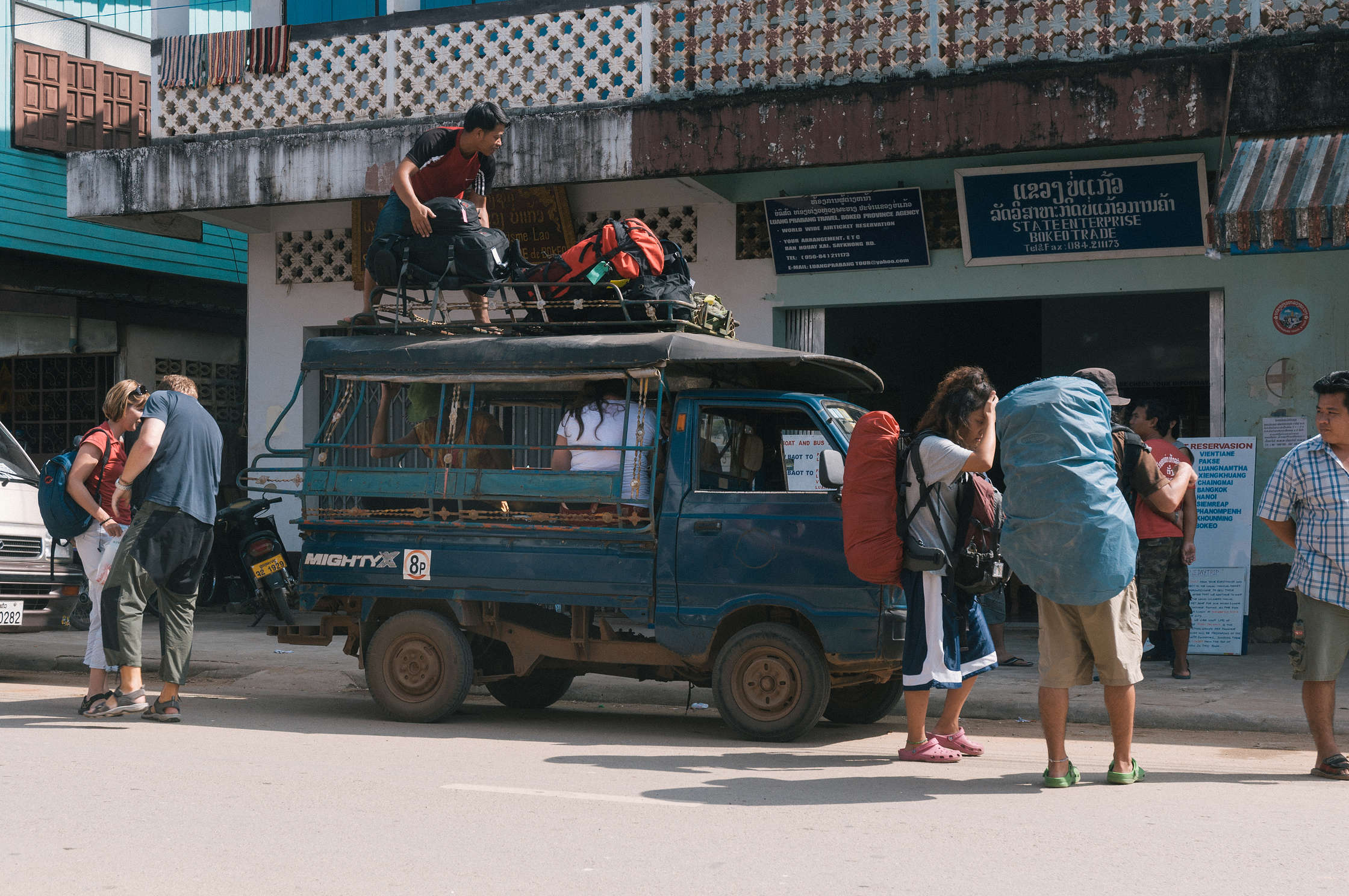 Patiesībā lielākā daļā (99%) uz Lao ceļo šādi - pārceļas pāri Mekongai, nokārto Vīzu, un tad pa Mekonku divas dienas brauc uz Luang Prabang (tāda kā kultūras galvaspilsēta), pēc tam dodoties uz Vang Vieng un uz Vientienne (galvaspilsēta). Mēs kā tādi īsti alternatīvi cilvēki, izvēlējāmies “off the beaten track” ceļošanas veidu, un ar autobusu gribējām doties uz Luang Namtha (ziemeļos) un tur izmest visādus lokus pa laukiem, pirms turpināt uz “parasto” tūristu maršrutu. Līdz ar to visi tūristu kompānijas Tuktuki devās uz laivu, nevis uz autoostu. Nācās pagaidīt birojā, kur Norai uzplijās kautkādi sekstūristi no Izraēlas, kamēr es izbaudīju pirmo ceļojumā manuālo tualeti (tualetes papīra vietā ir spainis ar ūdeni, izlietnes caurumam apakšā ir grīda).