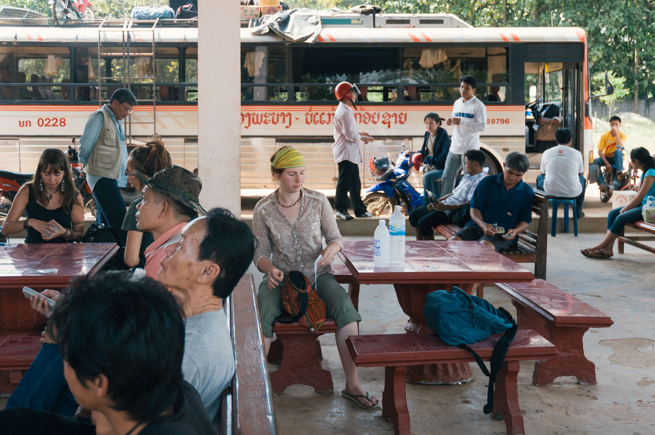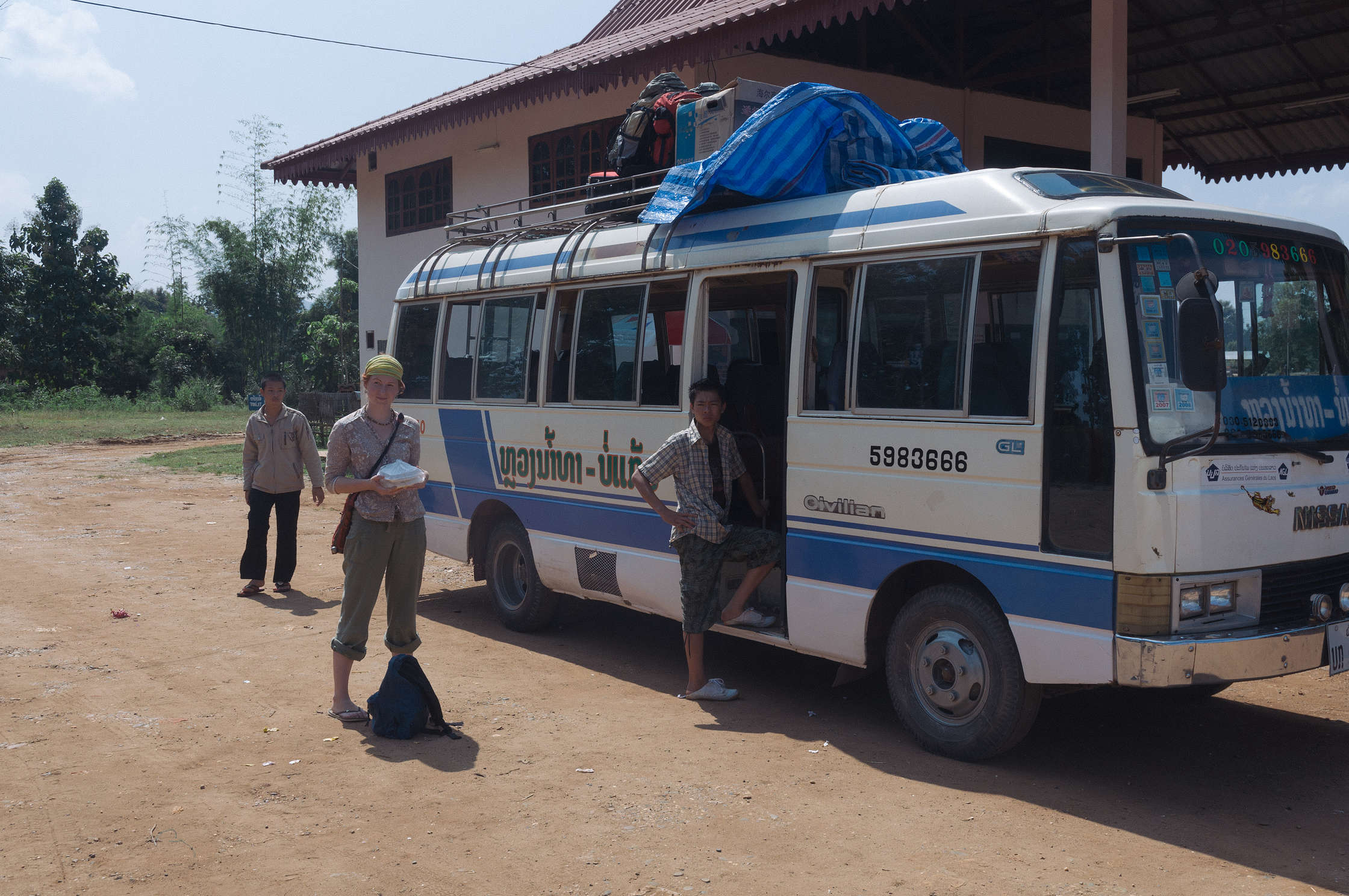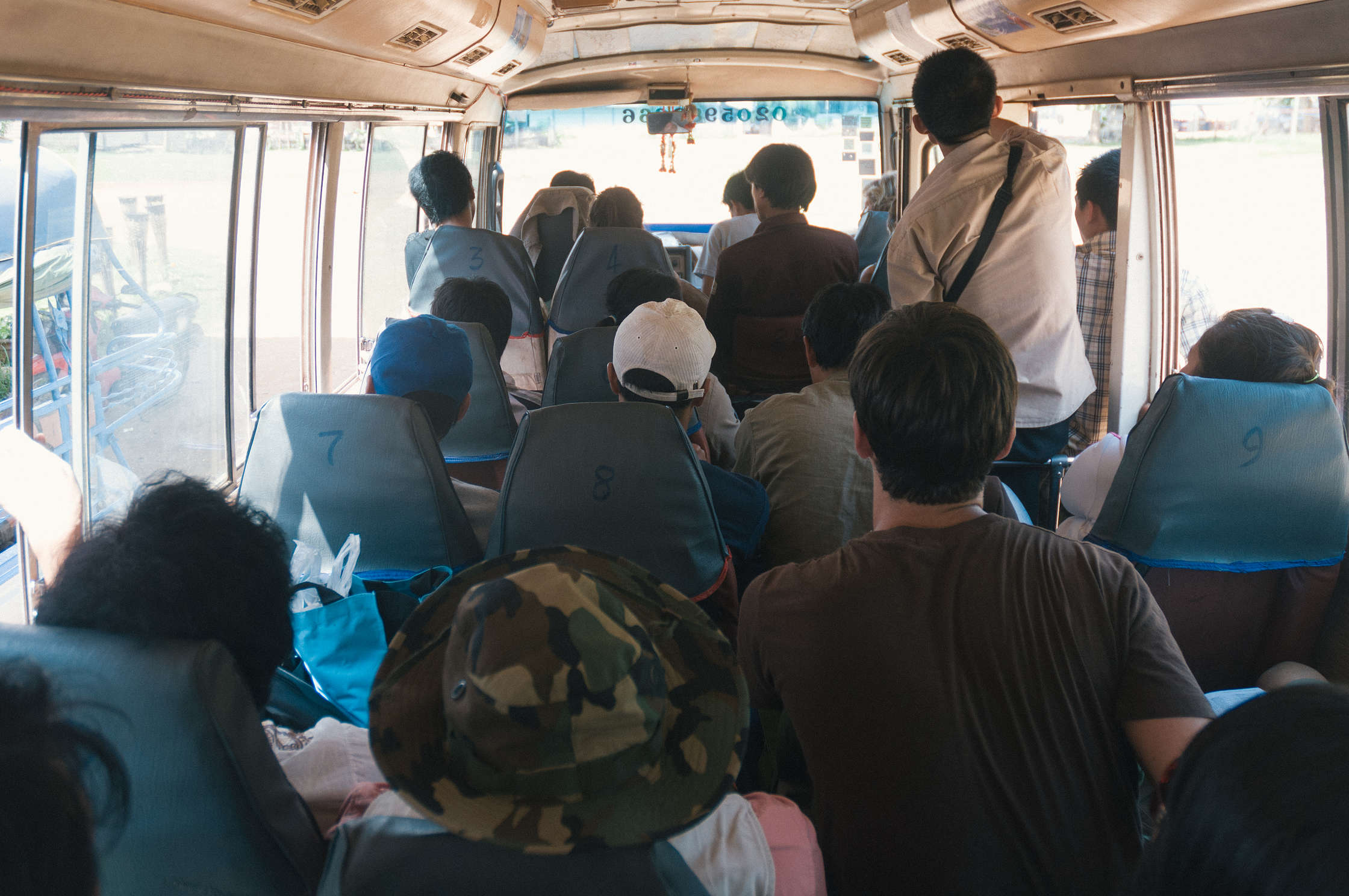 Nedaudz pastaigājām, apskatījāmies uz nu jau nedaudz atšķirīga tipa templi, pavērojām sirpju un āmuru esamību dažādās vietās, tad kautkā sagaidījām pareizo tuktuku, kurā braucām vieni, un nonācām autoostā. Izrādijās ka tur bija vēl daži baltie cilvēki, ar kuriem sapazināmies. Triju cilvēku kompānija bija tādi dredainie dīvaiņi, vienai meitenei no šiem līdzi bija milzīgs Digeridoo instruments, un viņi ceļoja jau vairākus mēnešus, un ceļošot “kamēr nauda beigsies”. Vēl tur bija tāds klusais tēls, kurš ātri vien izkāpa no autobusa, kautkur nekurienes vidū, ar maziņu “day pack” izmēra mugursomu, un tad vēl pāris paskaļi Spāņi. Visai daudz, jā, bet uz to skaitu kas sakāpa laivās (pāris desmiti) tas ir salīdzinoši ļoti maz. Pārējie mazajā autobusā sēdošie bija vietējie, un autobuss bija tipiski vietējais. Maziņš (18 vietas), čīkstošs un grabošš, pārbāzts, uz jumta traktora riepas un motocikls, salonā rīsu maisi, starp krēslu rindām iespiesti vēl mikroskopiski plastmasas krēsliņi utt.