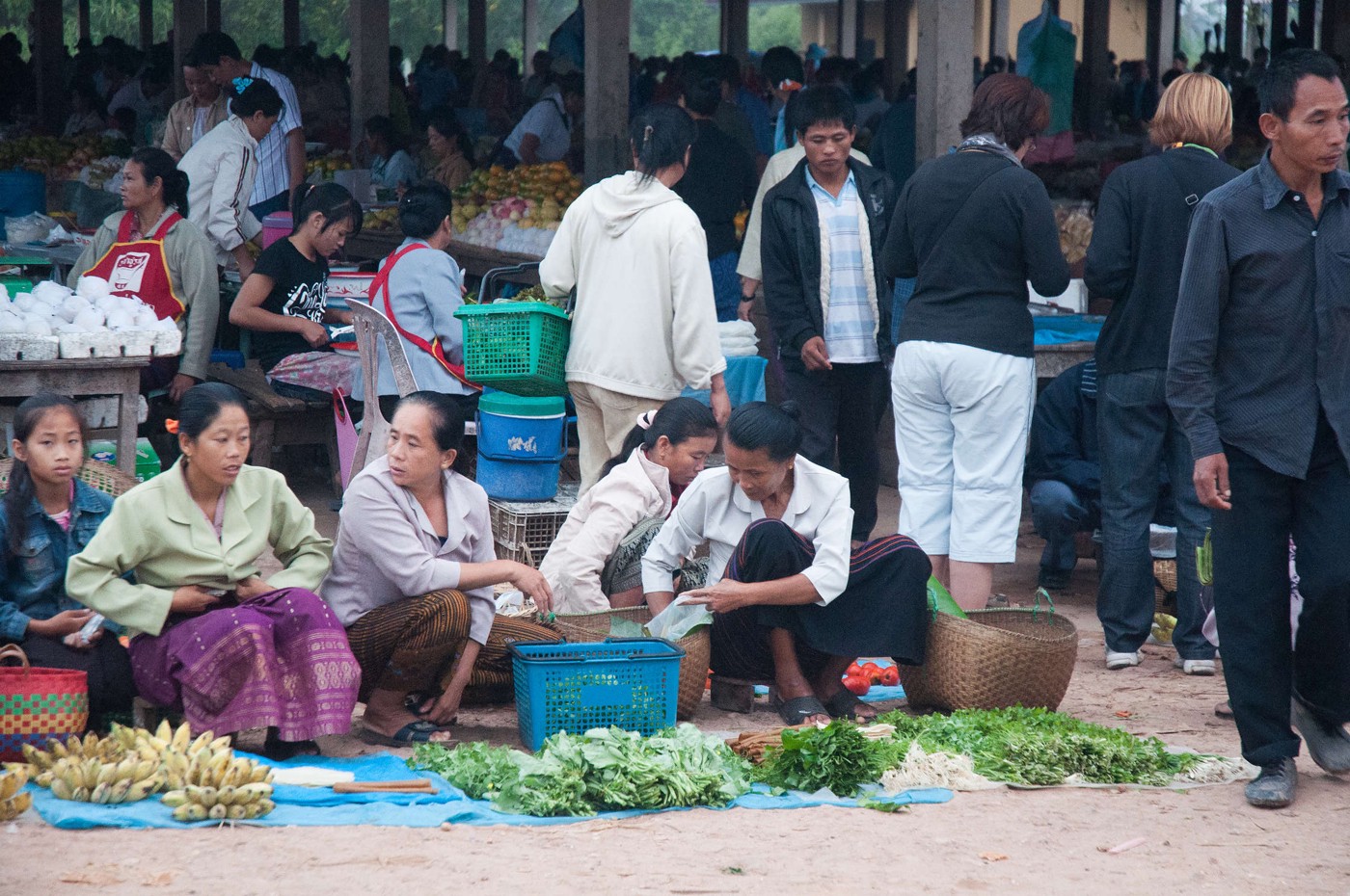 Rīts bija miglains, un salīdzinoši pavēss - teiksim tā, ierasto 30+ grādu vietā drošvien bija kādi 26. Pat neēduši, pa taisno sataisījamies un devāmies meklēt tirgu. Izrādās, ka kopā ar autoostu, arī tirgus ir pārvietots uz pamatīgi neertu vietu, kādus pāris kilometrus prom no pilsētas, bet tas nekas, cilvēki rindām vien devās uz turieni, mums tikai atlika sekot. Tirgū nonācām drošvien ap septiņiem, un tur nebija neviena paša tūrista. Tirgus pavisam īsts un nesamākslots - pārdeva visādus dārzeņus, augļus, pinumus, kandžu lielos daudzumos, visādus krāmus un tādas lietas. Izstaigājām, sāka nedaudz smidzināt lietus, un tad mūs pamanīja tantes no kalniem. Tantes tādas krāsaini saģērbušās, un visas tirgo dažādus rokdarbus, izšūtus ar krellītēm no graudiem, vai spīgulīšiem kas pagatavoti no Pepsi bundžiņām. Tantes aplipa ap mums lielos daudzumos, un katra sāka savu mantību likt rokās, raustīt aiz drēbēm, un smaidīt ar saviem smieklīgajiem sarkanajiem smaidiem (mute te veciem cilvēkiem ir spilgti sarkanā krāsā jo viņi košļā Betelnut - līdzīgi kā Indijā Gutka - lai nesāpētu zobi. Šis augs nokrāso muti un zobus sarkanus, toties tam ir pretsāpju efekts). Viena tante pat pamanījās Norai no rokas izņemt naudu, un ielikt rokās kautkādu somiņu, un prom bija. Lietas jau protams ļoti skaistas un fantastiski lētas, bet kā nu tadam tantukam lai atsaka - bet no visām jau nenopirksi. Sapirkām visādus smukumus un tināmies ātri prom, tantes rindiņā sekoja. Protams - vienīgie potenciālie klienti esam mēs.