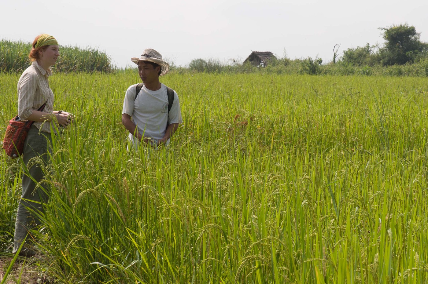 Gājām pāri strautam, redzējām milzu tauriņus kas izskatījās un lidoja kā tādi mazi putni, redzējām visu rīsu audzēšanas sistēmu, sākot no apūdeņošanas konstrukcijām, beidzot ar stāstu kā rīss top par rīsu, redzējām kā zemnieki tos ievāc un sien lai liktu kaltēties. Karstums tajā brīdī noteikti bija tuvu četrdesmit, jo sviedri tecēja aumaļām, un saule dedzināja neiedomājami stipri. Šobrīd to atceroties es to vien gribu kā turp atpakaļ. Skati ir skaisti - visur dzeltens un zaļš, kalni, daba, bezgalīgs miers. Pa rīsu lauku māla malām uzkāpām līdz palmu lapu atpūtas būdiņai, tur satikām mazu meitenīti kas auklēja daudz mazāku brālīti - šai bija labi ja četri, brālītim esot 3 mēneši.