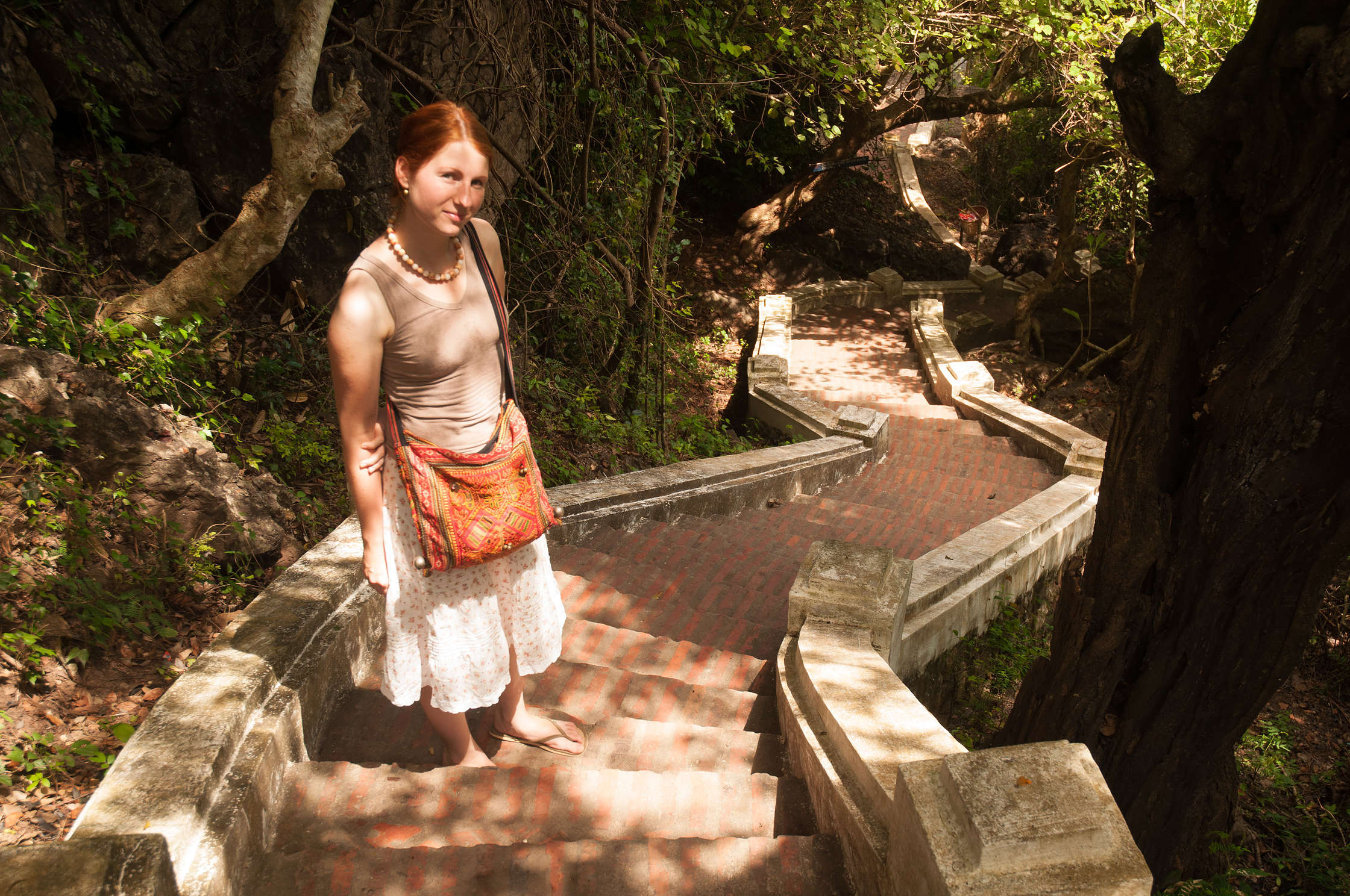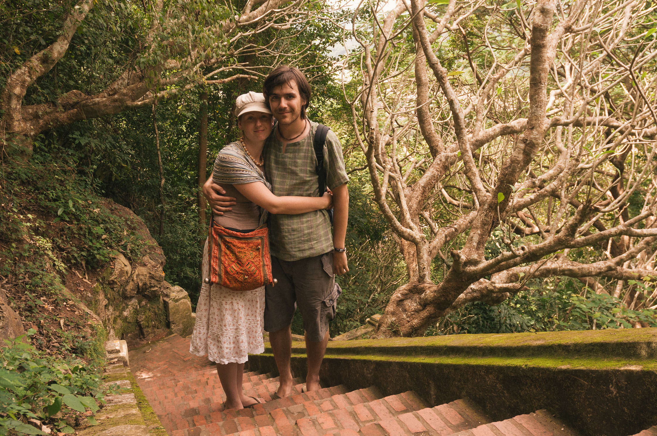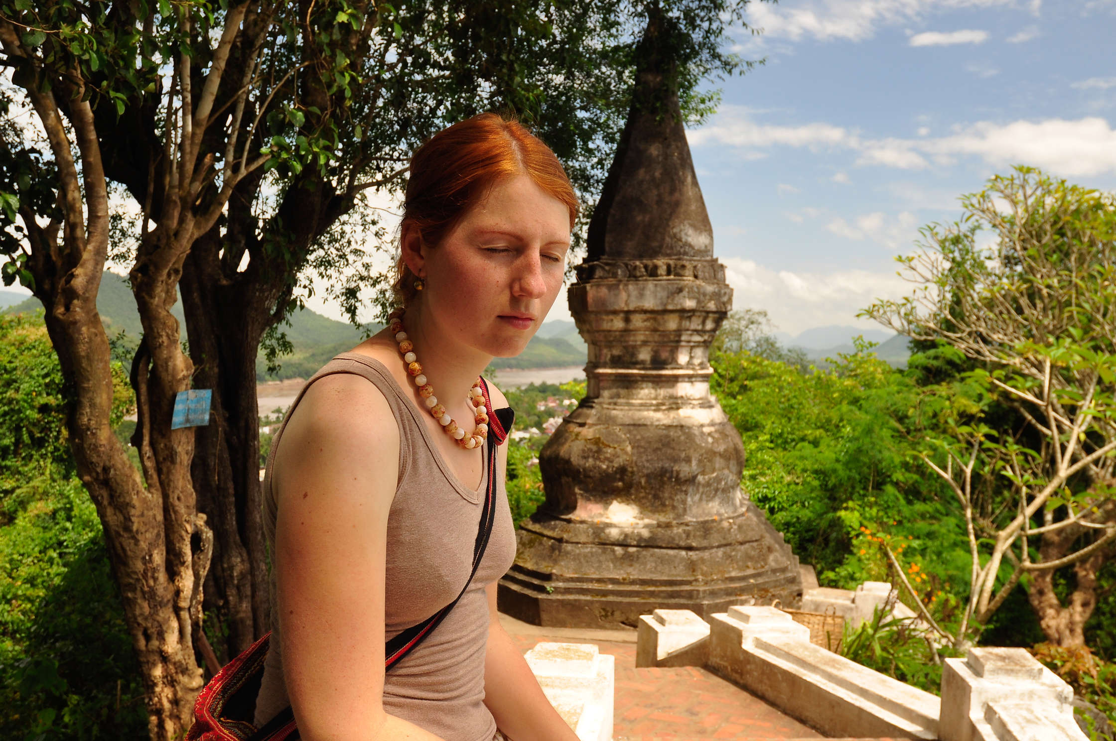 Paēduši un atpūtušies pēc ēdiena meklējumiem, mēs gājām kāpt lielajā kalnā, kas atrodas pilsētas centrā, un kura augšā ir visādas stupas, tempļi un dažādas interesantas Budas statujas. Tur par nožēlu bija jāmaksā ieejas maksa, kas vispār šajā pilsētā ir totāls absurds - atšķirībā no Taizemes, te tempļos ir ieejas maksa. Kāpjot kalnā kautkādas tantes mums mēģināja pārdot mazus putniņus būrīšos, ar mērķi tos izlaist brīvībā. Es nosmējos un teicu ka nemaksāšu tantei par putna mocīšanu tā lai viņai šis bizness varētu attīstīties, un gājām tālāk. Tad jau labāk nopirkt kādus vienkāršus rokdarbus, zīmējumus vai ēdienu, lai atbalstītu vietējos. No kalna pavērās fantastiski skati uz pilsētu, un abām upēm. Dienas gaitā izstaigājām Luang Prabang centru vairākas reizes, iegriezamies visādās sīkās ieliņās, apskatījām dažādus tirgus, paēdām jocīgus ēdienus no ielas tirgotājiem, un arī iemīlējām fruit-shake. Uz ielām bieži vien te ir sastopami galdiņi, nokrauti ar ~0.5L plastmasas glāzēm, kuras pilnas ar dažādu svaigu augļu gabaliem. Te ir tāda augļu dažādība, ka bieži vien nav vērts jautāt kas tas viss ir. No atminamajiem nosaukumiem viens bija Dragon Fruit. Jebkurā gadījumā šeiks maksā kādus 40 santīmus un tiek veidots šādi - tevis izvēlētās glāzes saturu ieber blenderī, piejauc klāt aptuveni tik pat daudz samalta ledus, pielej karoti cukurniedru sīrupa, karoti kokosa piena, karoti sojas piena, tad labi sakuļ, un ielej atpakaļ glāzē. Tādus mēs dzērām visu laiku un bez apstājas, jo karstumā šie atvēsinošie dzērieni bija praktiski nepieciešamība. Un cik tie ir garšīgi … Ja kāds jautās par uzticēšanos aizdomīgam ledum - mums ar vēderiem viss bija labākajā kārtībā, galvenais sapotēties pret Hepatītu un Vēdertīfu, un tad nedomāt par šiem urbānajiem mītiem. Ielu ēdiens ir svaigāks kā restorānos, jo to pagatavo uzreiz tieši tev, un tas nekur ilgstoši nestāv. Par ūdens tīrību Laosieši ir tik pat uztraukušies kā mēs, un paši arī ūdeni no krāna nedzer, neredzu iemeslu kapēc viņi censtos tieši tevi noindēt.
