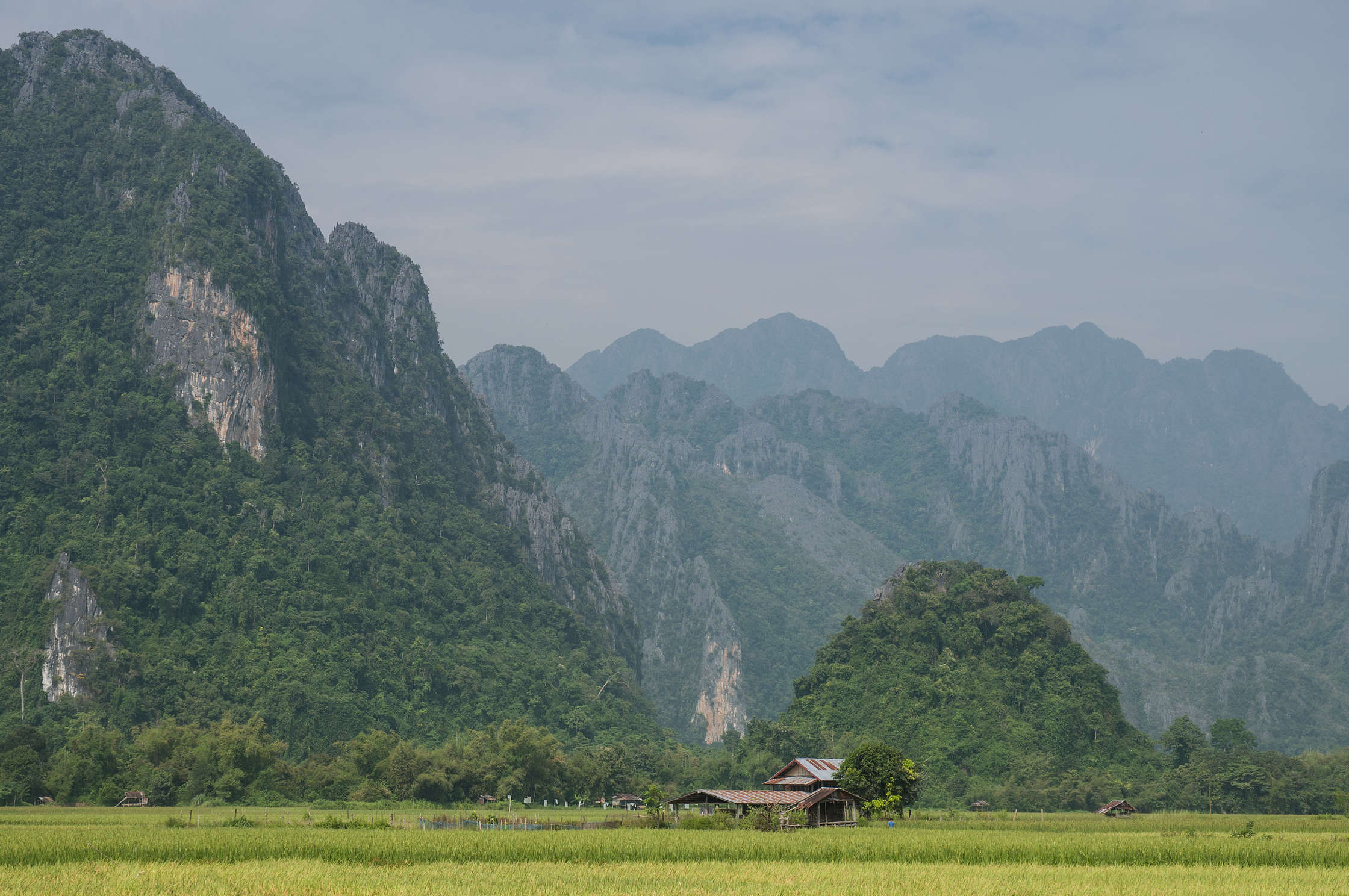 Vang Vieng ir slavena ar saviem pasakainajiem klinšu skatiem, kas arī bija iemesls mums tur iegriezties, tapēc gājām uz upi pavērot šos skatus saulrietā. Upes otrā krastā (pāri tikšana pa paštaisītu, ļodzīgu bambusa tiltiņu) atradām fantastiskākos bambusa bungalo, ar neierobežotu skatu tieši uz klintīm, rīsa lauka malā.