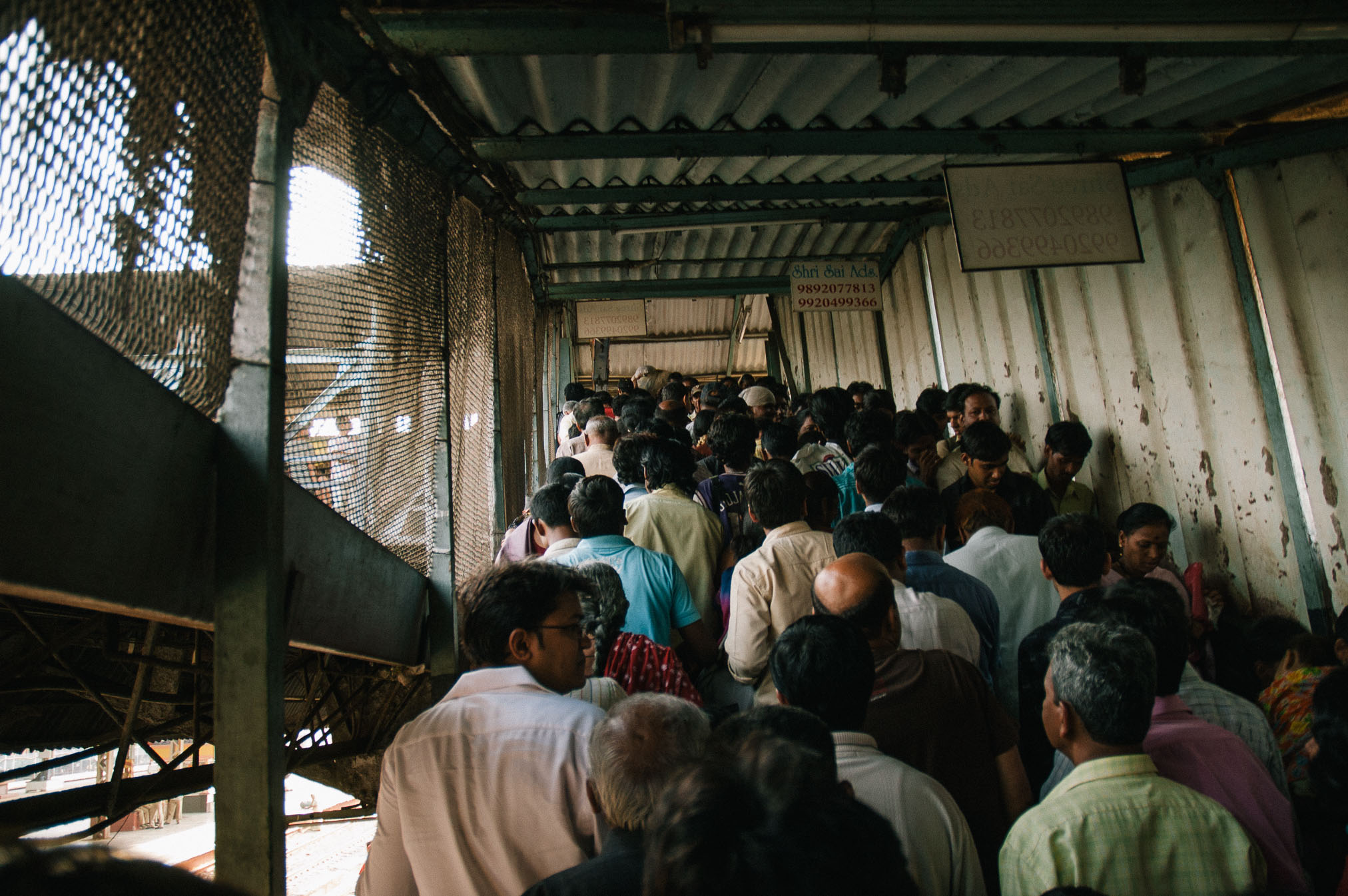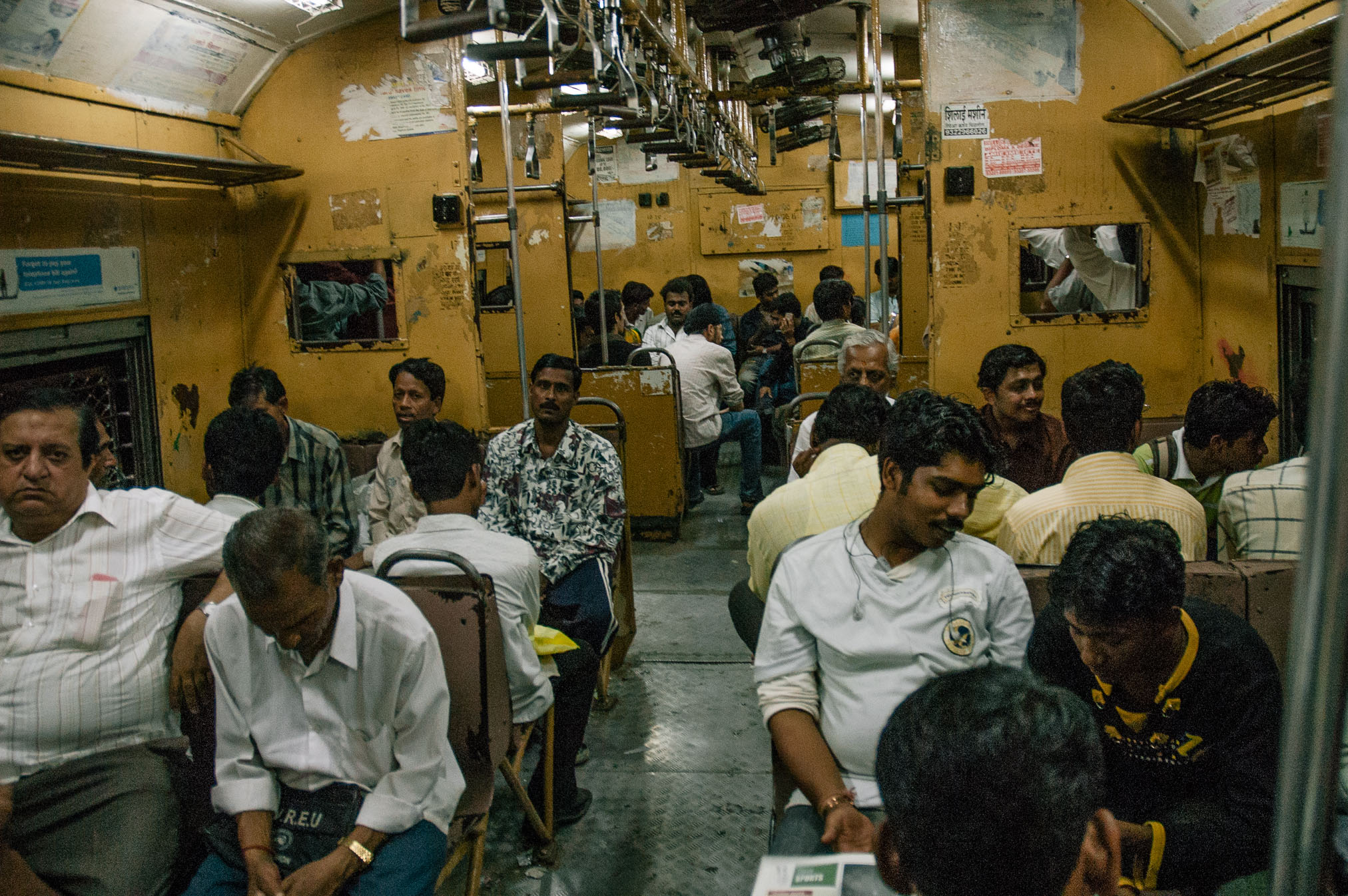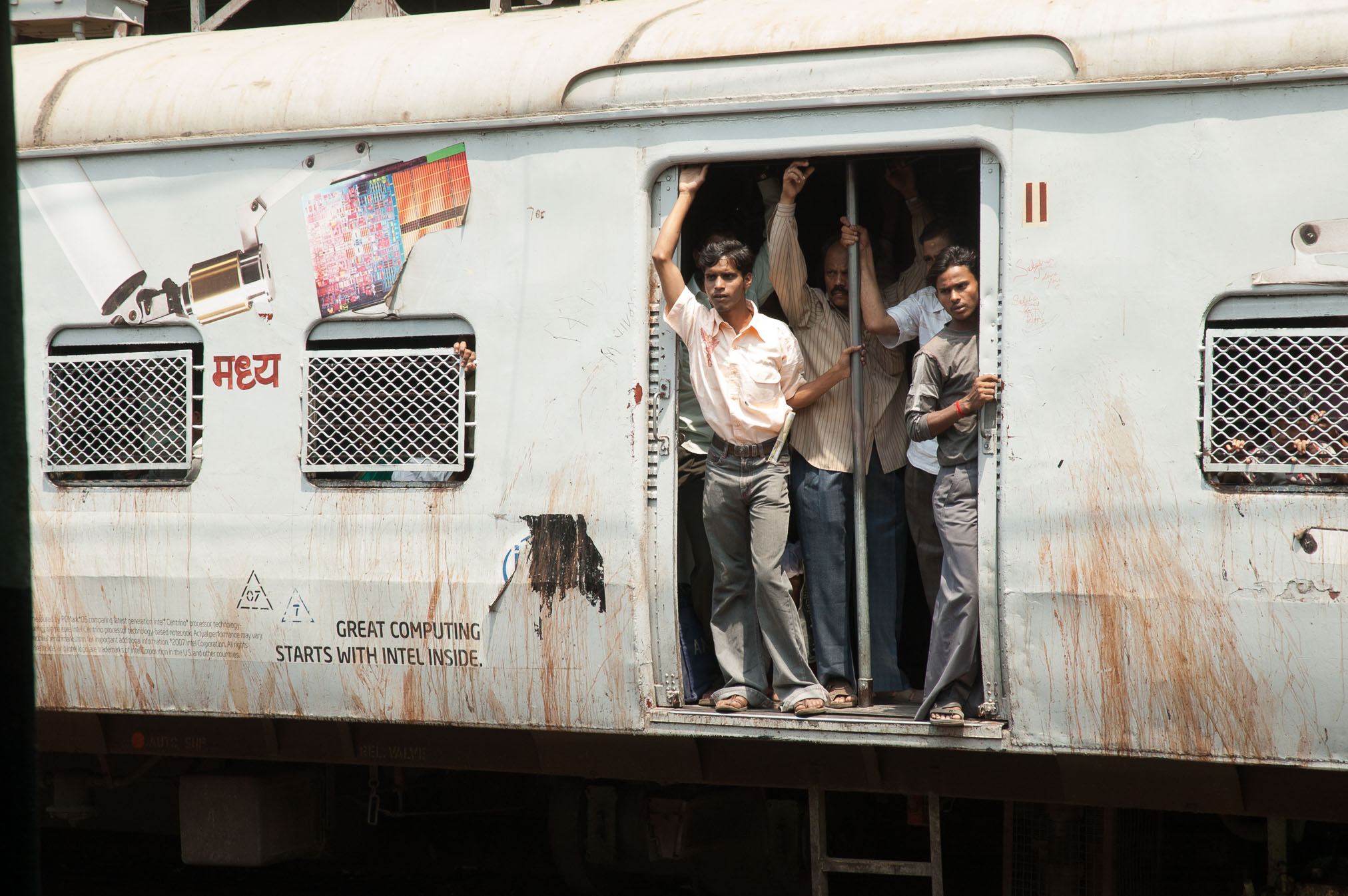Brauciens uz Bombejas centru (dīvaini, bet vietējie Mumbaju tāpat sauc par Bombeju ar visu to ka nosaukumu mainīja jau 1995.g) bija maigi izsakoties ekstrēms. Vispirms nācās stāvēt divdesmit minūšu rindā, turklāt veltīgi, jo pretēji policista “any counter!” kase mums atteicās pārdot pirmās klases biļetes. Tā pirmā klase varbūt te izklausās pārāk labi, tāpēec es sākumā gribēju braukt pie “tautas”, bet patiesībā arī pirmā klase ir kaut kas krimināls. Cilvēki karājas ārā pa vilciena durvīm, ir karsts un netīrs, un vienīgā priekšrocība ir tā, ka var pakustēties un reizēm pat apsēsties. Vilciens pieturā apstājas uz ~10 sekundēm (skaitijām), turpceļā, Arnim iekšā kāpjot, vilciens sāka braukt. Kamēr ielēca Sergejs, tas jau kustējās labā skrienamajā ātrumā. Taču, kamēr es pieķēros durvju stangai, man jau bija jāskrien pamatīgā ātrumā un es pat īsti nesapratu kā es tur iekļuvu, jo burtiski ievēlos iekšā.
