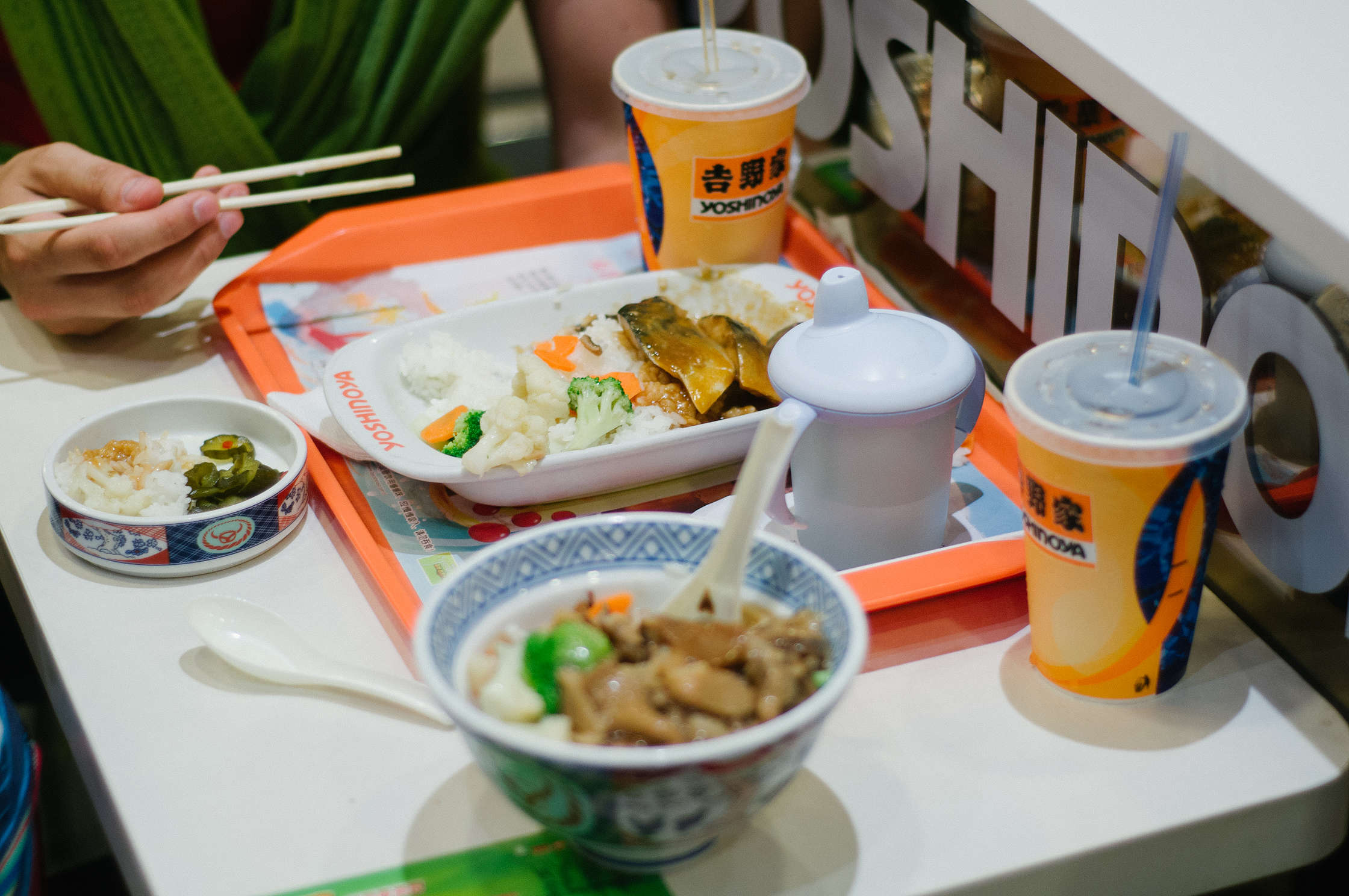 Pamodāmies un secinājām, ka esam nogulējuši brokastis, tāpēc devāmies vien uz metro staciju un braucām uz pieturu, kura, kā izrādijās, atrodas lielveikalā. Tur arī atradām brokastu vietu, kas saucās Yoshinoya un kurā bija precīzi divi ēdieni gaļas neēdājiem. Ēdām zivi un sēnes ar rīsiem.