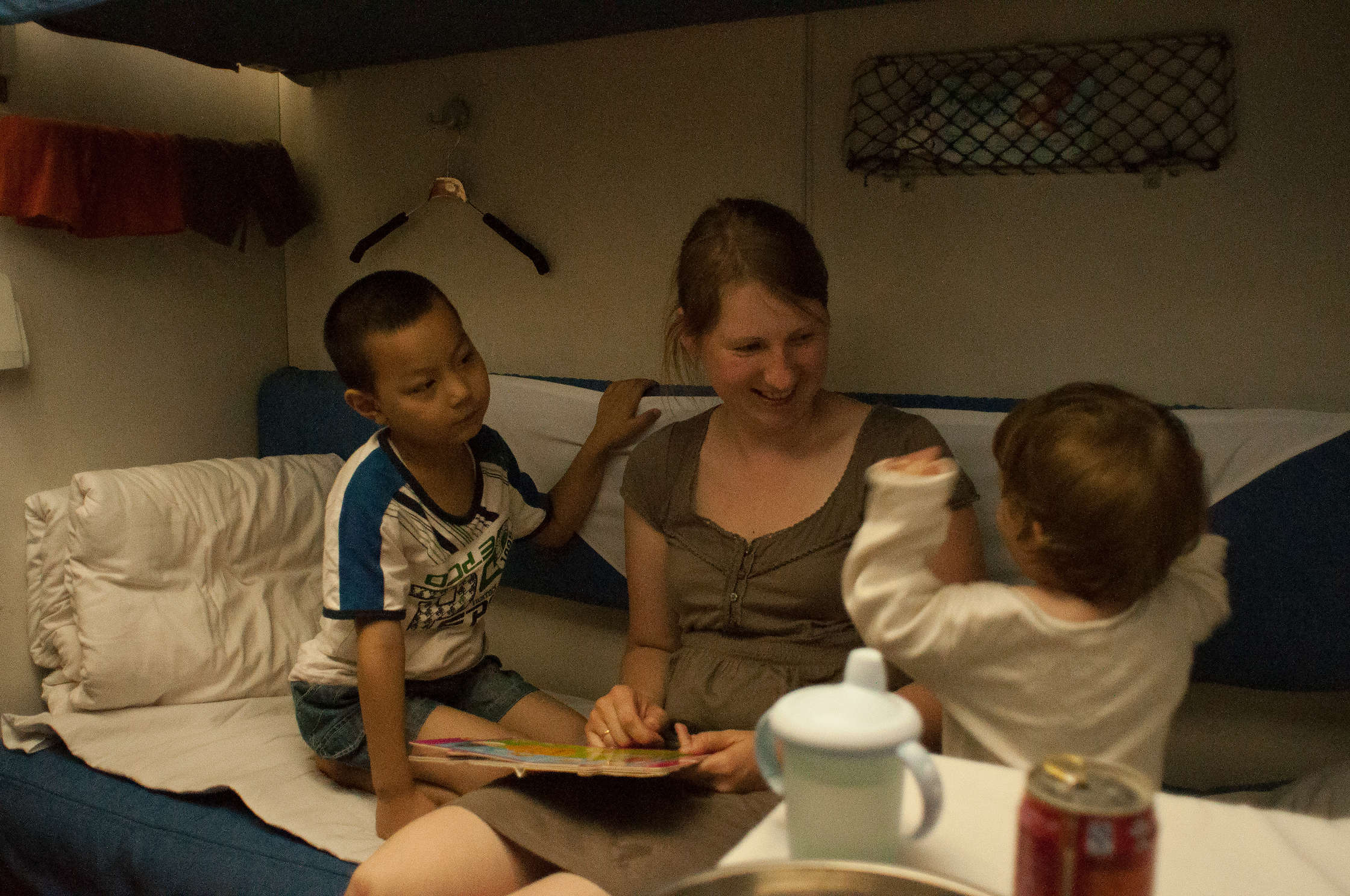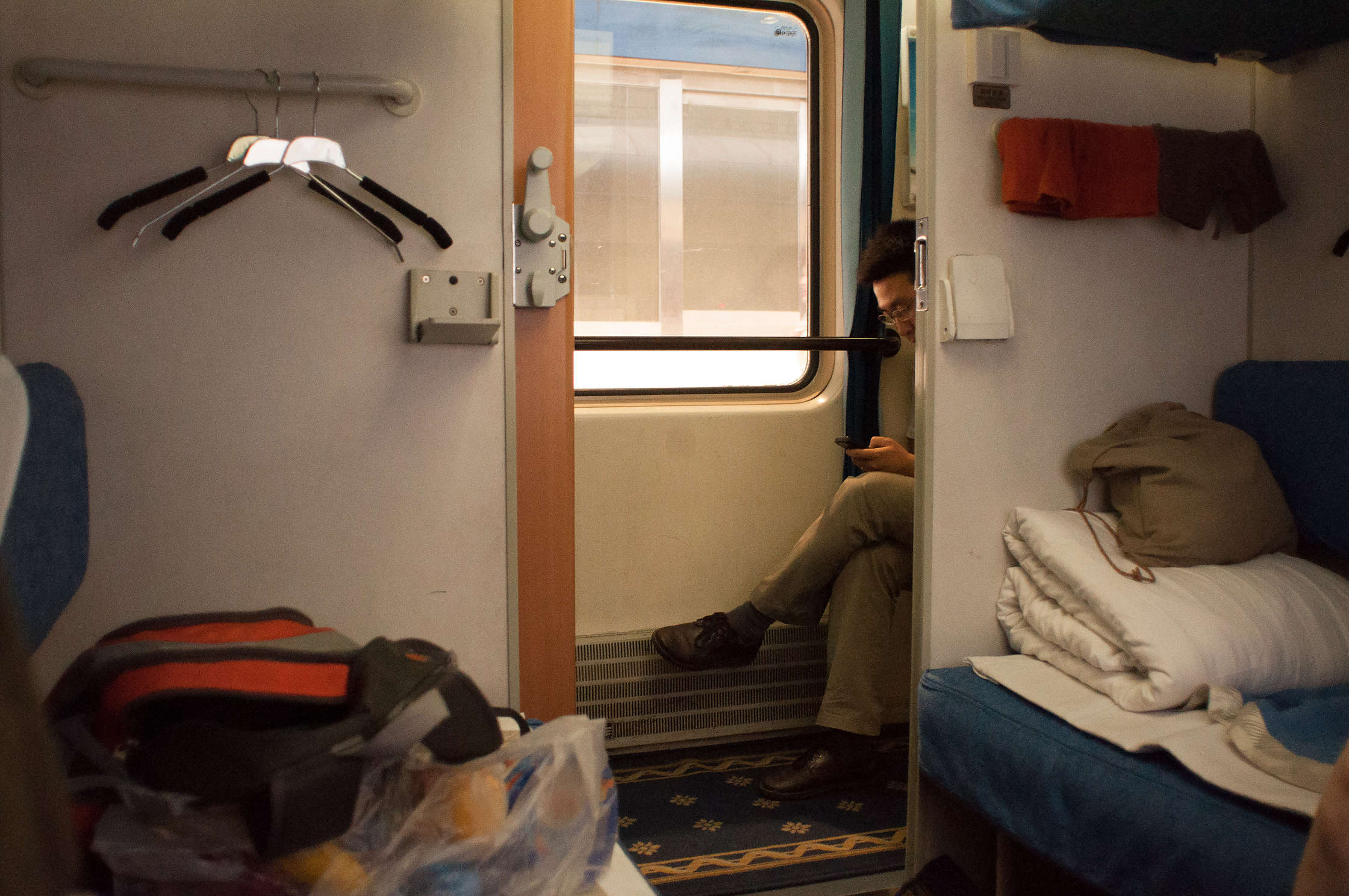 Stacijā nonācām kādas 40 minūtes pirms vilciena atiešanas, taču šī stacija bija visai labi marķēta un organizēta, tāpēc vilcienā bijām nieka 10 minūtes pēc ierašanās. Brauciena biļetes bija nopirktas iepriekš aprakstītajā Soft Sleeper kupejā, taču kad jau sākām iepazīties ar līdzbraucējiem, ienāca kaut kāda meitenes un pamatīgi žestikulējot mēģināja kaut ko iestāstīt. Beigās sapratu, ka viņas vēlas lai mēs divi (Oliveram savas gultas nebija) apmainamies ar diviem citiem cilvēkiem no blakus kajītes, lai viņas vecāki var dzīvot kopā ar viņu. Tā arī darījām, un mūsu jaunie kaimiņi bija pat piemērotāki - jauns pāris ar mazu bērnu. Viņi bija neiespējami pieklājīgi un klusi, bērnu gan aicinājām ar Oliveru kopā paskatīties multenes uz iPod touch (kas bija mūsu emergency glābiņš situācijās kad Oliveram viss bija līdz kaklam), beigās šie pat nepateica ka mēs varam slēgt ārā gaismas, jo paši bija jau aizmiguši - t.i. neprotestēja, ka mēs kaut ko vēl ņemamies un vāram nūdeles pie lielās gaismas.