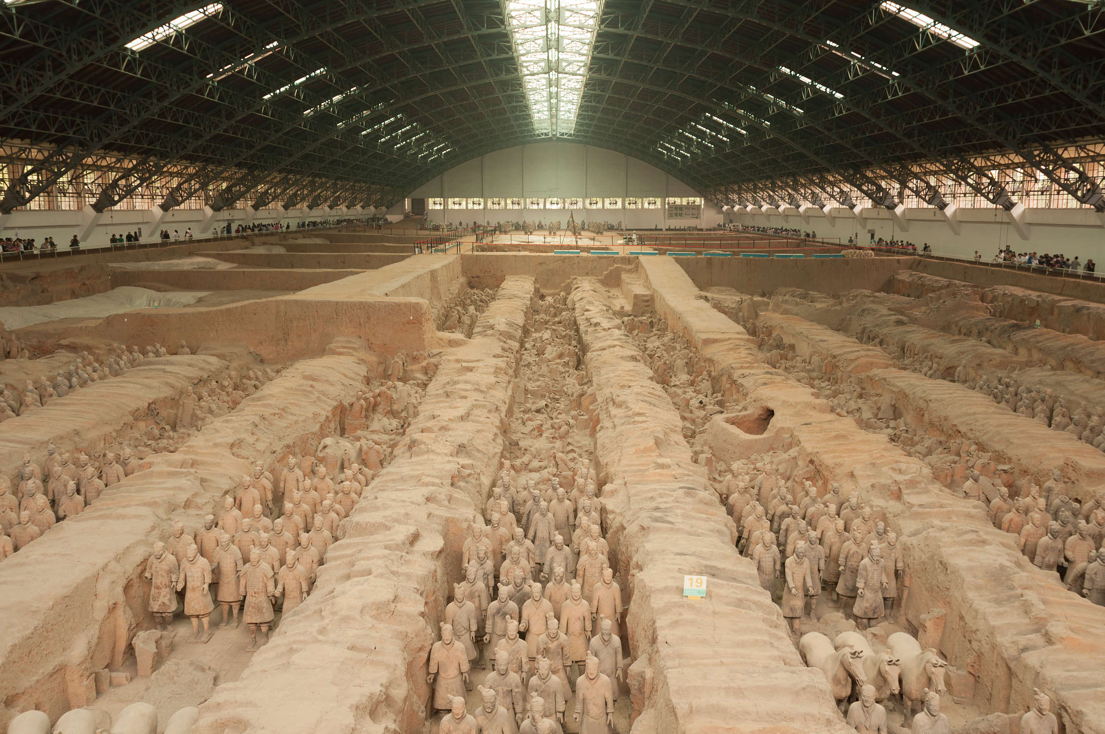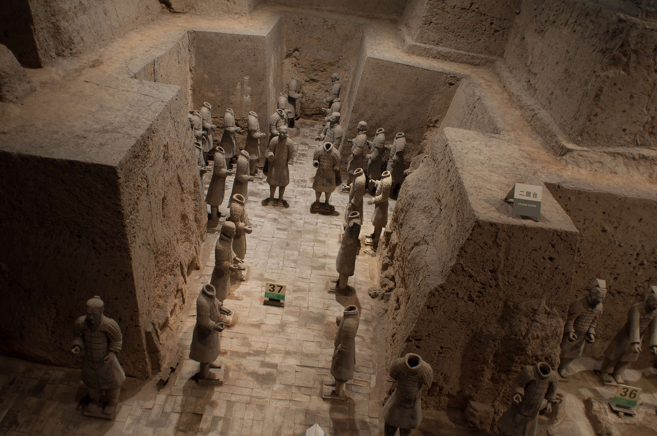 Ar autobusu aizbraucām līdz stacijai un kādu brīdi pavazājāmies pa rajonu, meklējot to vietu kur stāv sabiedriskie kas dodas uz Terakotas armijas vietu. Terakotas armija ir viens no pēdējā laika (relatīvi) nozīmīgākajiem arheoloģiskajiem atklājumiem pasaulē - pirmā Ķīnas imperatora kapenēm tuvumā esošas gigantiskas barakas, kurās imperatoru sargā astoņi tūkstoši pilnīgi dažādu, cilvēka izmēra karavīru, katrs ar rokām ļoti rūpīgi izgatavots no māla. Kādreiz tie bijuši krāsaini, taču veicot izrakumus, senā krāsa oksidējās un izzuda momentā. Atklājums veikts jau septiņdesmitajos, taču lai pasargātu objektus no sabojāšanas, daudz no tā visa nemaz nav atrakts pat šodien. Pašas imperatora kapenes vispār nav atvērtas, jo ja iedomākas cik liela ir armija kas tās apsargā, gribas ticēt leģendām par piramīdā esošajām dzīvsudraba upēm un ko tik vēl ne, tāpēc lai neatkārtotu kļūdu ar armijnieku krāsām, kapenes never vaļā kamēr nebūs izgudrota efektīva sistēma lai saglabātu visu kas tur iekšā. Autobusus atradām, bet pa ceļam līdz tiem vēl vajadzēja atkratīties no pēdējā brīža censoņiem taksistiem. Taksis prasa sākot no 200 naudiņām, autobuss maksā 11 naudiņas. Autobusi turklāt spilgti zaļi, ar skaidriem uzrakstiem angliski “Terracota warriors and horses”.