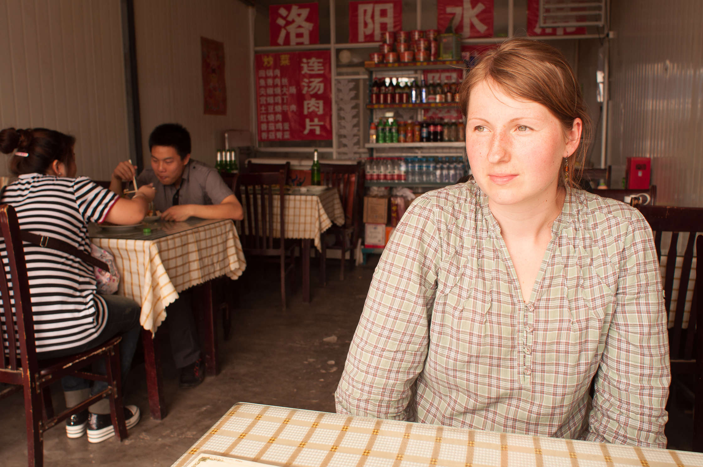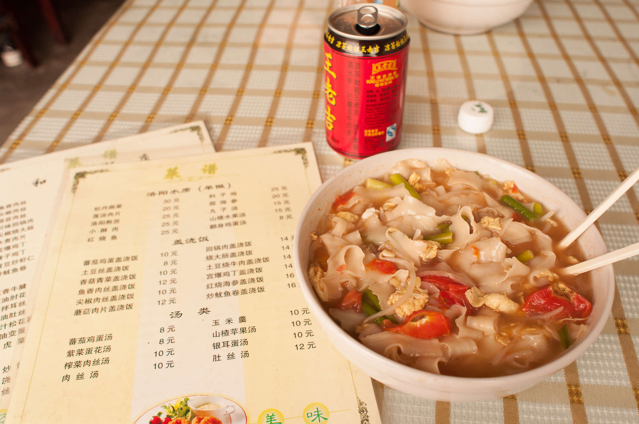 Pie stacijas esošajā autobusu pieturā secinājām, ka Longmen grotas atrodas tepat blakus (2-3Km) un ir pat autobuss kas gar tām brauc. Nākamais jāgaida pusstunda, tāpēc atradām tukšās stacijas darbiniekiem paredzēto kioskveidīgo ēstuvi un devāmies pusdienās. Personāls bija vairāk kā laimīgs mūs sastapt, jo tādā wasteland nekurienes vidū droši vien bez apsarga un kasiera bijām pirmie klienti. Atkal no grāmatas tantei parādijām kādas lietas ēdam un neēdam un ņemot vērā izcili detalizēto menu, paļāvāmies uz tantes gaumi un gaidījām ko nu mums atnesīs. Patiesībā ēdiens bija fantastisks, nūdeļu zupa ar olu. Klāt piedzērām kaut kādu Daktera Fū zālīšu tēju no bundžiņas un par to visu kopā samaksājām dažus santīmus, pati lētākā ēdienreize braucienā. Serviss bija lielisks un atmosfēra jauka.