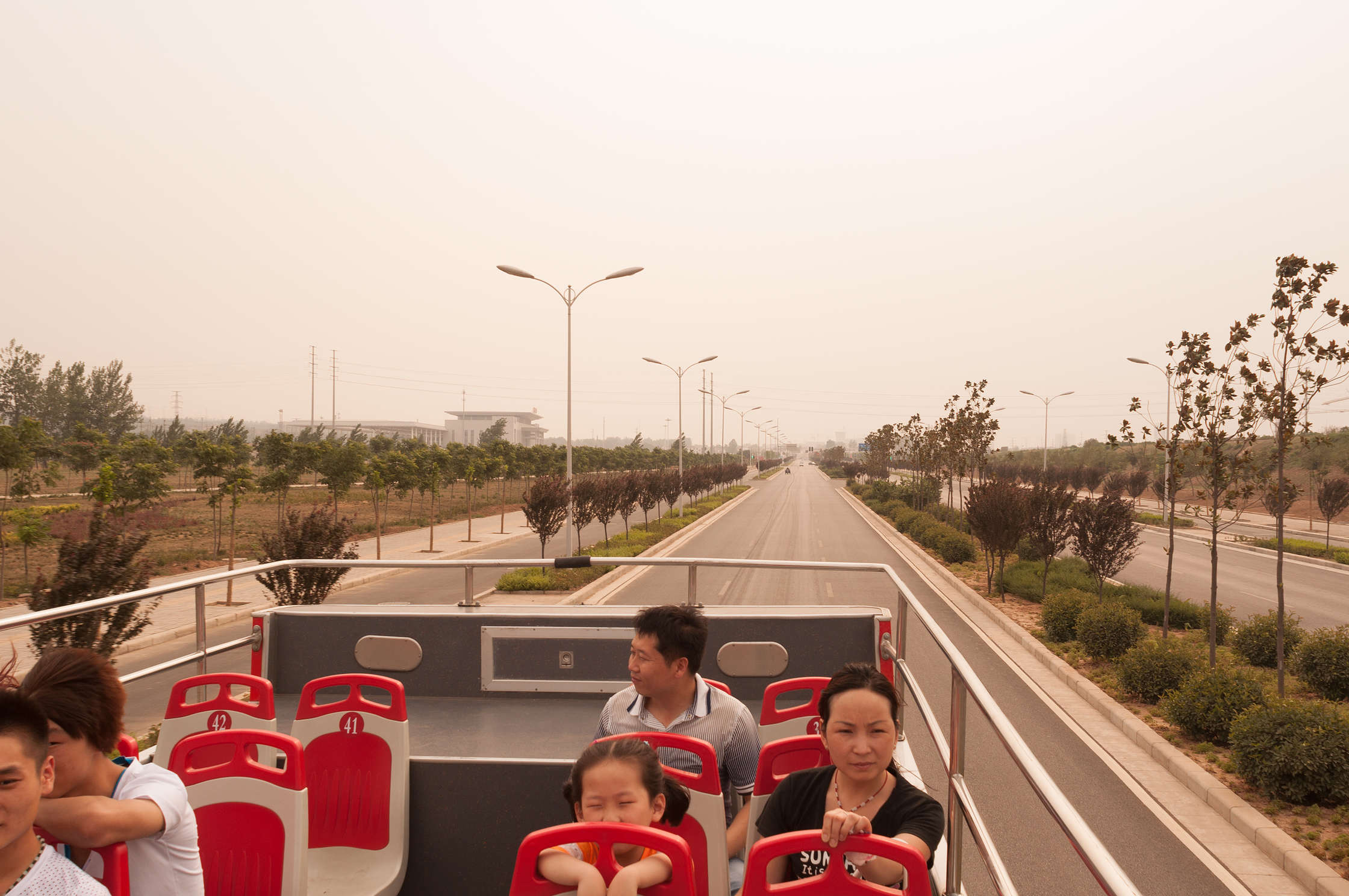 Kamēr mēs tā gaidījām autobusu, bija uzradies kaut kāds ļoti nesaprotamas nozīmes tūristu autobuss ar vaļēju jumtu, iespējams ar šo te tika izrādītas tūres pa jauno pilsētu, demonstrējot potenciālajiem biznesiem kādas te jaukas iespējas pārvietot kompāniju birojus (un arī jauns dzelzceļš jums speciāli uzbūvēts). Meiča-gide mūs pierunāja, ka arī viņi dosies gar grotām (paši gan neapmeklējot tās) un mūs var tur izlaist. Cena no parastā autobusa diži neatšķīrās, tāpēc braucām ar viņiem. Toties uz divstāvu autobusa vaļējā jumta!