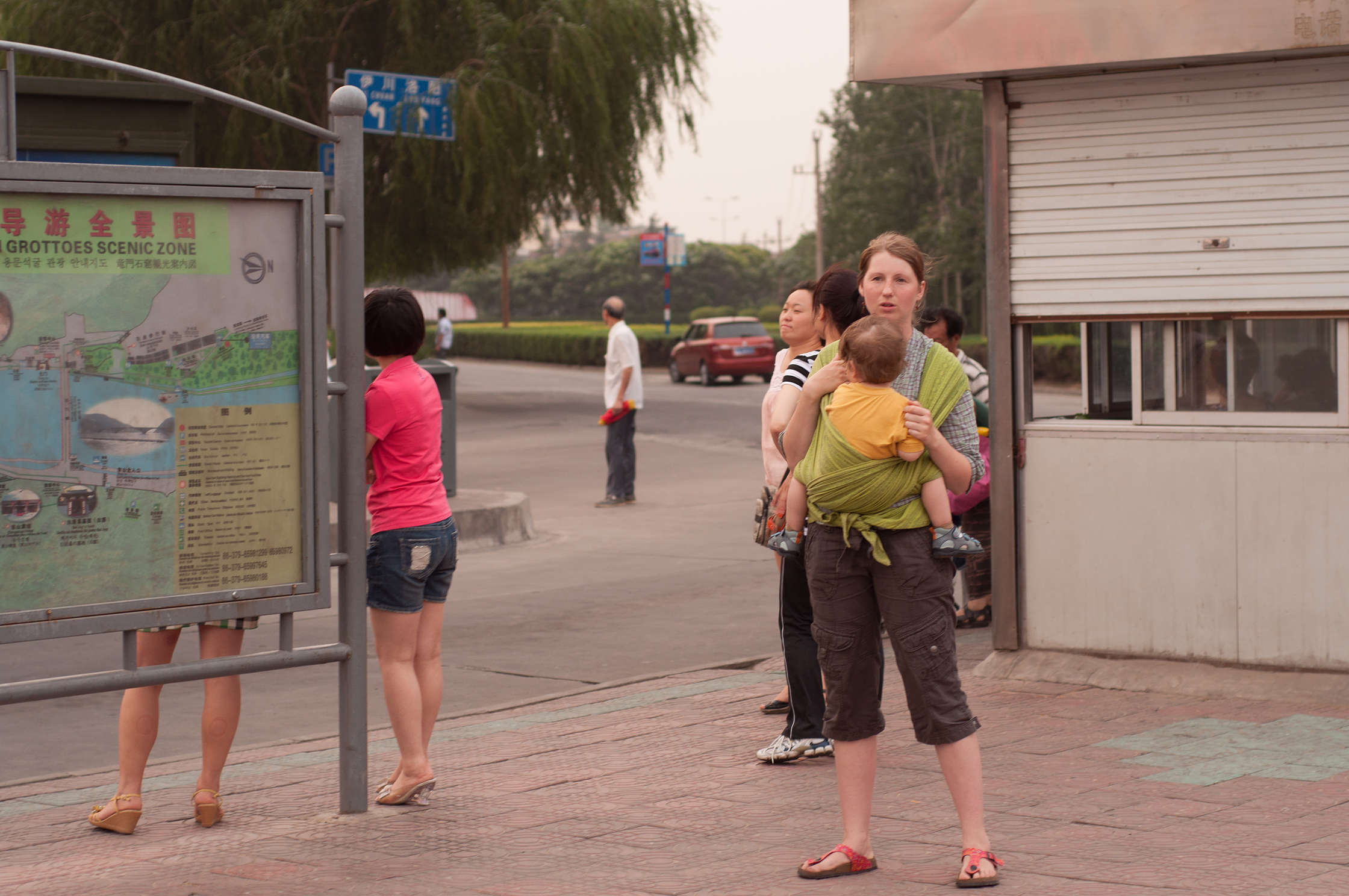 Luoyang stacija nu jau atgādināja provinci. Visai netīra, šaura un bez jebkādām pazīmēm, ka te jebkad kāju ir spēris tūrists. Pārnestā nozīmē protams, tūristi ir visur, vismaz kādreiz jau parādās. Iestājās kārtējais brīdis, kad gribējās izsamist, turklāt ārā svelme bija neizturama un Olivers gribēja gulēt. Nebiju rēķinājis visu līdz galam, biju domājis ka pilsēta ir kājām izejama, taču Lonely Planet karte nebija zīmēta mērogā un patiesībā pilsēta reāli bija visai liela. Sākumā aizgājām uz stacijas kasu zāli, lai noskaidrotu, vai tiešām esam tajā stacijā kur likās un vai tiešām eksistē Lonely Planet minētā otra dzelzceļa stacija. Labi, ka man bija jaunās stacijas nosaukums Ķīniešu valodā. Izgājām ārā un netālu no stacijas sameklējām čupiņu autobusu, tur kādam garlaikotam šoferim parādijām uz kurieni gribam un viņš mums parādija kurš autobuss turp brauc. Tātad plāns bija nopirkt biļetes uz Pingyao un tad doties apskatīt Longmen grotas.