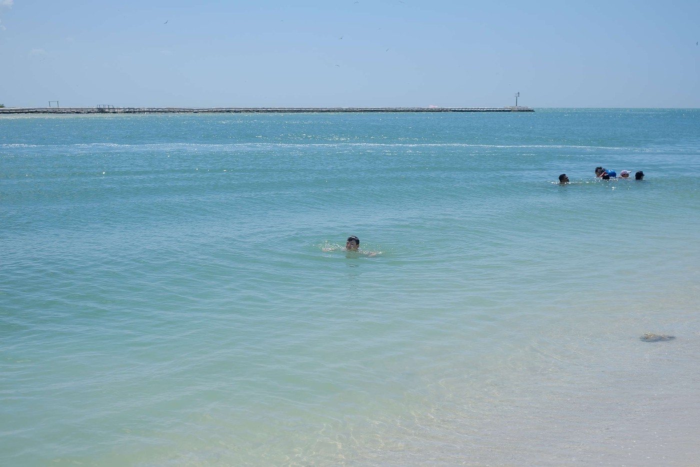 Ar pleznām kājās un maskām uz sejas, uzsēdāmies uz laivas malas un ielēcām ūdenī. Pie laivas tas vēl bija tik dziļš, ka vēl dibenu varēju sasniegt, tāpēc to vietu izmantojām, lai aklimatizētos un pārliecinātos, ka maskai garām nespiežas ūdens, kas gan man ar bārdu bija neliela problēma. Ūdens ir ārkārtīgi sāļš, kož acīs un degunā. Uzreiz jau sapratu, ka labi vien ir, ka izvēlējos uzvilkt peldvesti, jo jāpeld uz priekšu labs gabals. Iegremdēju galvu ūdenī un sekoju instruktoram. Viņš bija vienkārši izcils, jo visu laiku turēja tuvumā Oliveru, sekoja kā mums visiem iet un pavadīja. Šo es tik ļoti uzsveru, jo pēc tam dzirdēju, cik ļoti var atšķirties šāda veida tūres. Mums turklāt skorkeļa trubiņas bija ūdensdrošas (tā ka teorētiski drīkst ienirt).