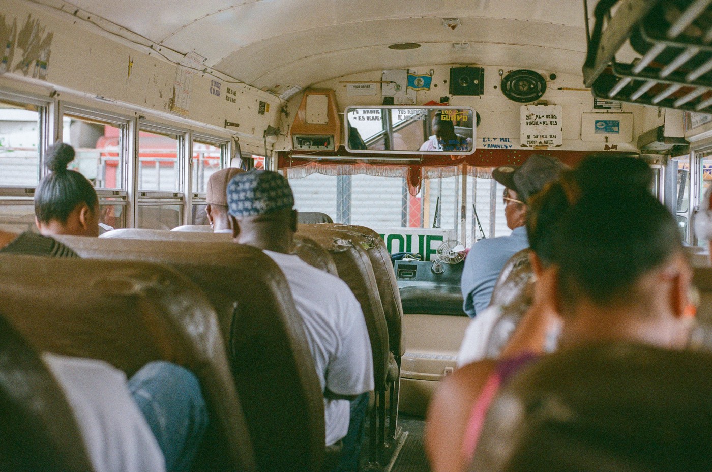 Noskaidrojām, kur atrodas tas autobuss, kas mums ir vajadzīgs, pieskrējām klāt, jo mums teica, ka viņš drīz aties, ielēcām iekšā un tas viss aizņēma labi ja minūti. Nepaspējām pat ceļam uzkodas nopirkt. Autobusi Belizā ir pārmantoti ASV skolas autobusi, izkrāsoti dažādās krāsās. Tie ir ārkārtīgi veci un sagrabējuši, šķībiem un neērtiem krēsliem. Neskatoties uz to, tas bija interesants brauciens ar interesantu publiku. Bijām vienīgie tūristi.