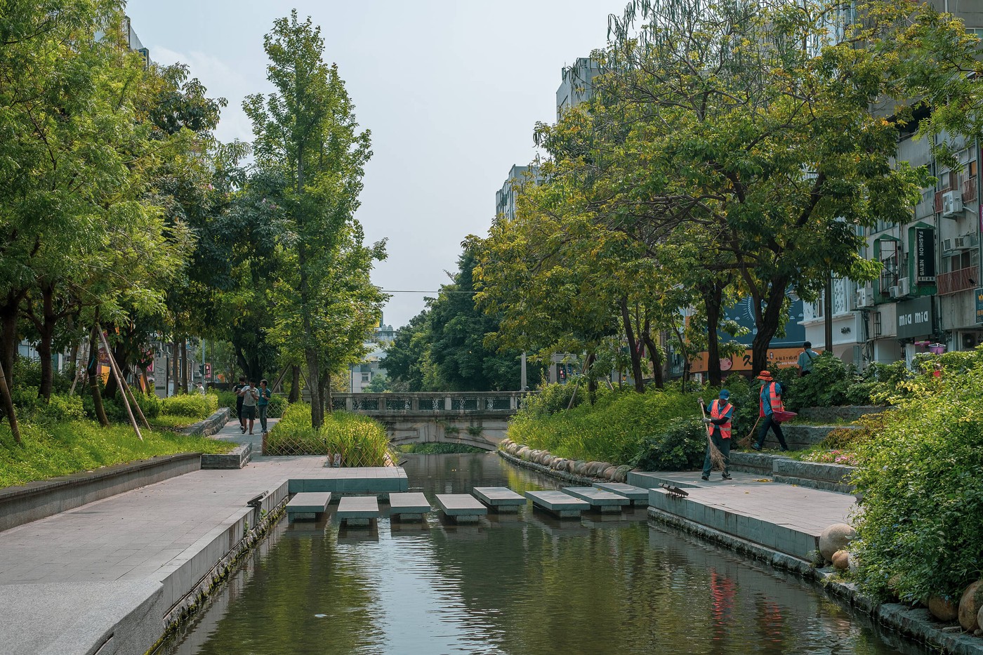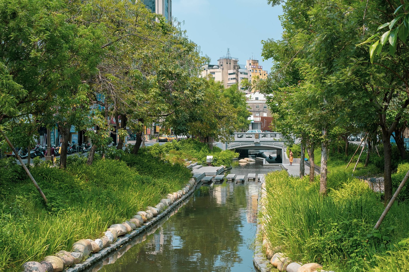 Nolikām viesnīcā somas un devāmies pastaigā pa rajonu. Ja Taipeja bija atstājusi tādu visai neitrālu iespaidu, tad šis bija tas brīdis, kad es iemīlējos Taivānā. Taičungas stacijas rajons ir kompakts, sakārtots un jauks. Blakus viesnīcai atrodas kanāls, kas ir transformēts par tādu kā savvaļas upi, izlīkumots, apzaļumots, salikti akmeņi, lai zivīm ir gaisa burbulīši, sabūvēti tiltiņi un dažādas instalācijas. Vide ir tik atvērta un relaksēta, turklāt bija tik saulains un silts, ka tas viss atstāja paliekošu iespaidu uz mani. Automašīnu bija maz, bija tāds mierīgās vasaras dienas gaiss.