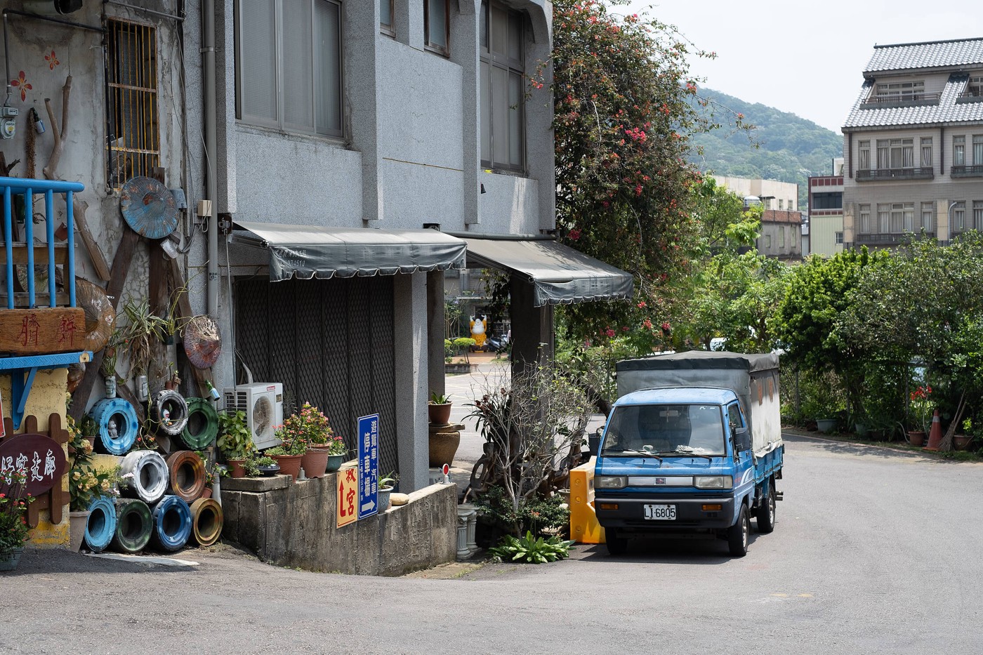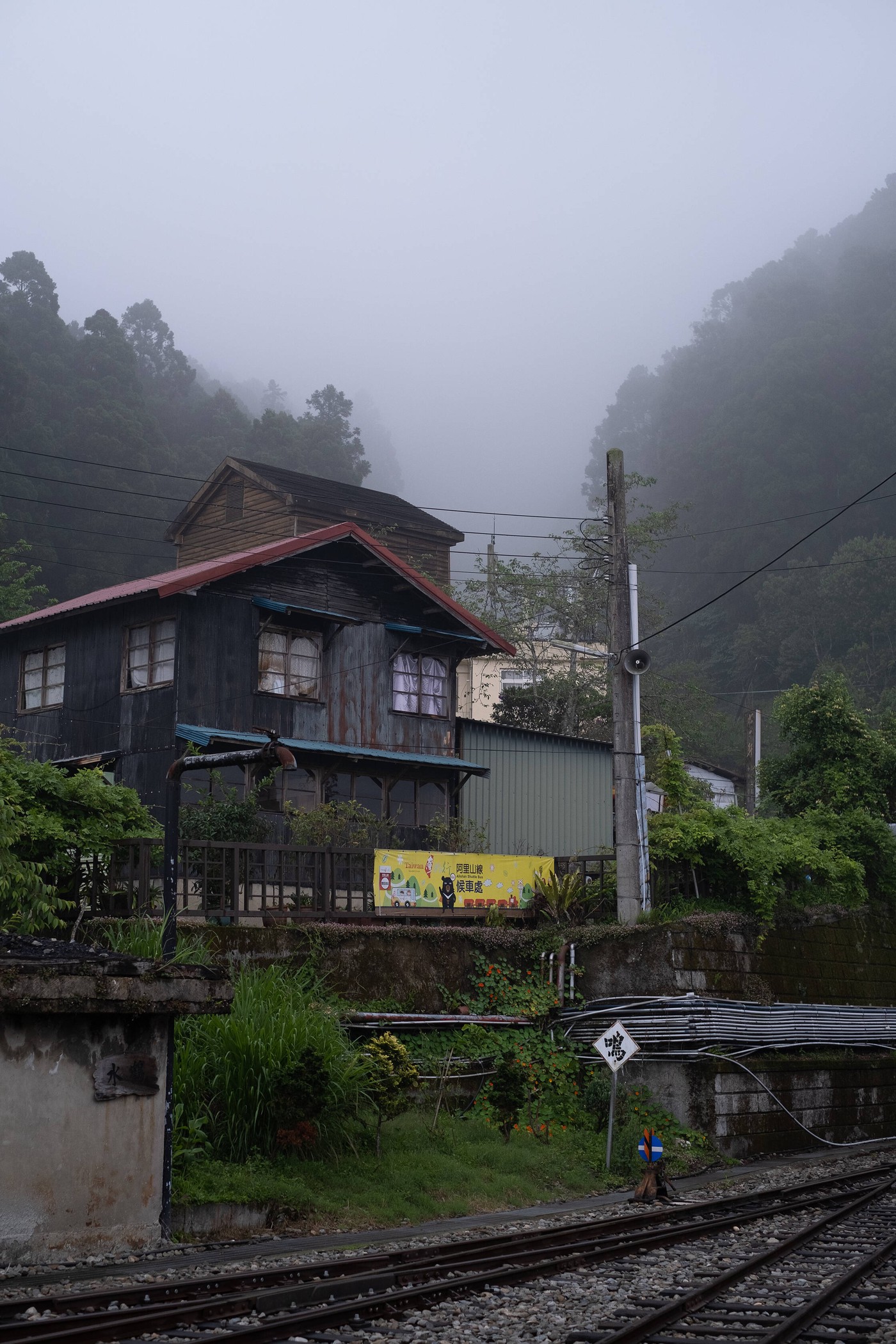 Sanyi dzelzceļa stacija jau pati par sevi ir ļoti maza un laucinieciska. Izkāpām un sajutām, ka vairs neesam pilsētā. Kluss un tukšs, nelielas mājas, neviena cilvēka, apkārt kalni un meži. Viens kiosks, kurā nopērkam saldējumu un aukstās kafijas. Pētām stacijā atrodamo tūrisma karti un secinām, ka šeit visapkārt ir dažādi pārgājienu maršruti. Kāpēc gan jāmeklē taksis (kuru šeit tāpat nevar manīt), iesim vienkārši ar kājām. Nobildēju karti, piemetu Google Maps aptuveno virzienu un devāmies pētīt Taivānas laukus. Skats no stacijas durvīm