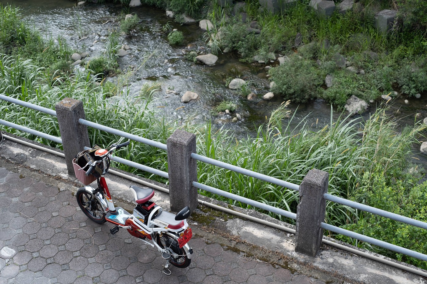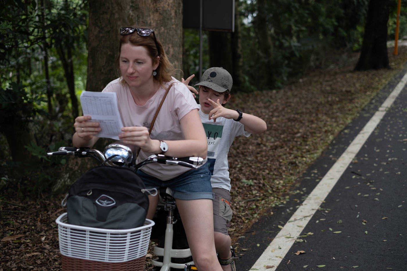 Kad vilciens sagaidīts, sekojot ieteikumam, nākamajā (Jiji) stacijā atrodam elektrovelosipēdu nomu un iznomājam tādus kā skūtervelo. It kā tādi kā motorolleri ar ērtu sēdekli, kuri brauc uz elektrības, taču pieejami arī pedāļi, kurus var lietot stāvos posmos, kad baterijai grūtāk uzvilkt kalnā.