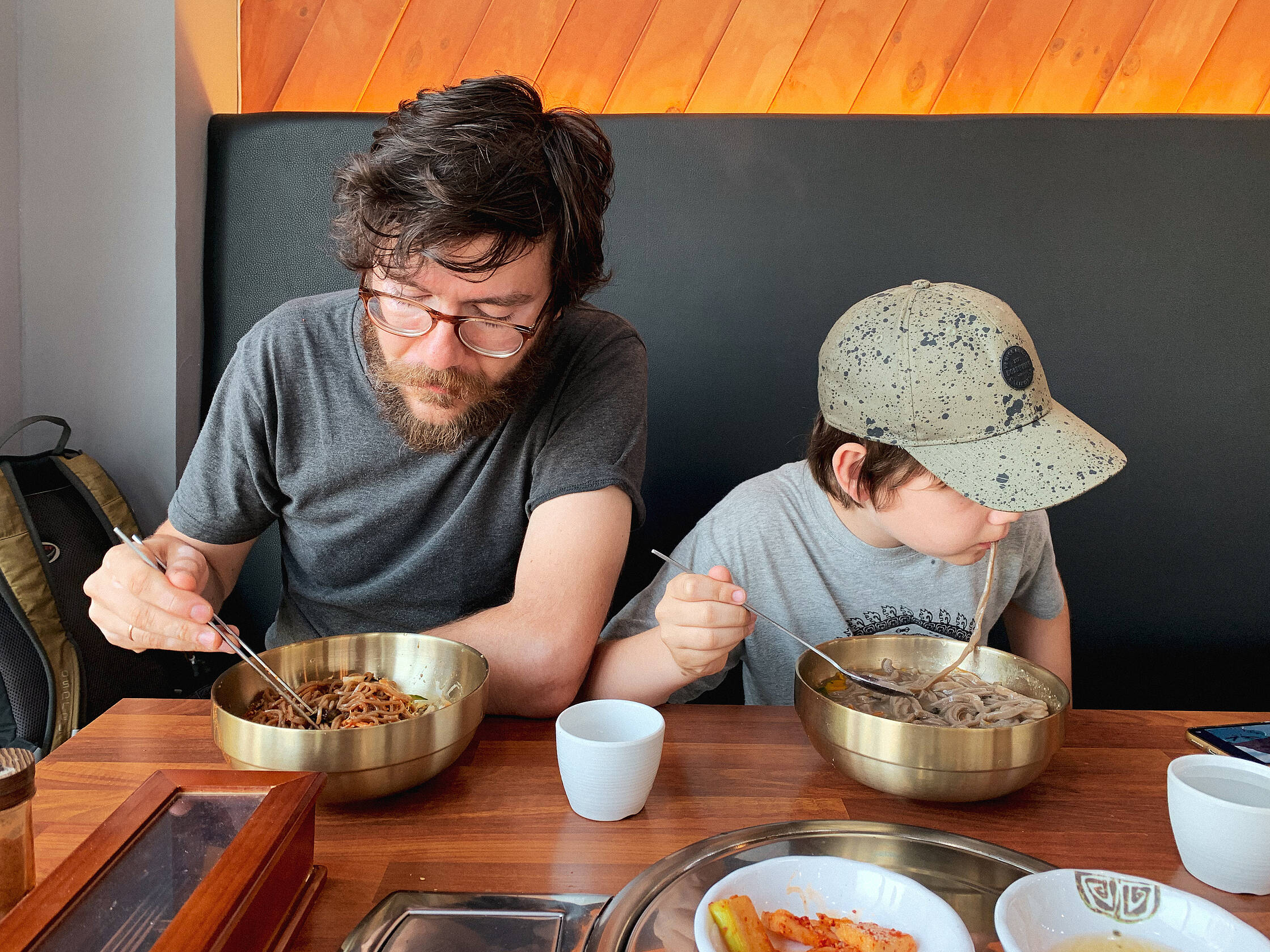 Atkal jau sakombinējām dažādus autobusus un braucām cauri visai pilsētai uz otru galu, apskatīt Haedong templi. Izkāpuši no autobusa nu gan momentā atradām kādu nūdeļu ēstuvi un beidzot paēdām, pēc garās staigāšanas noguruši un gaužām izsalkuši.