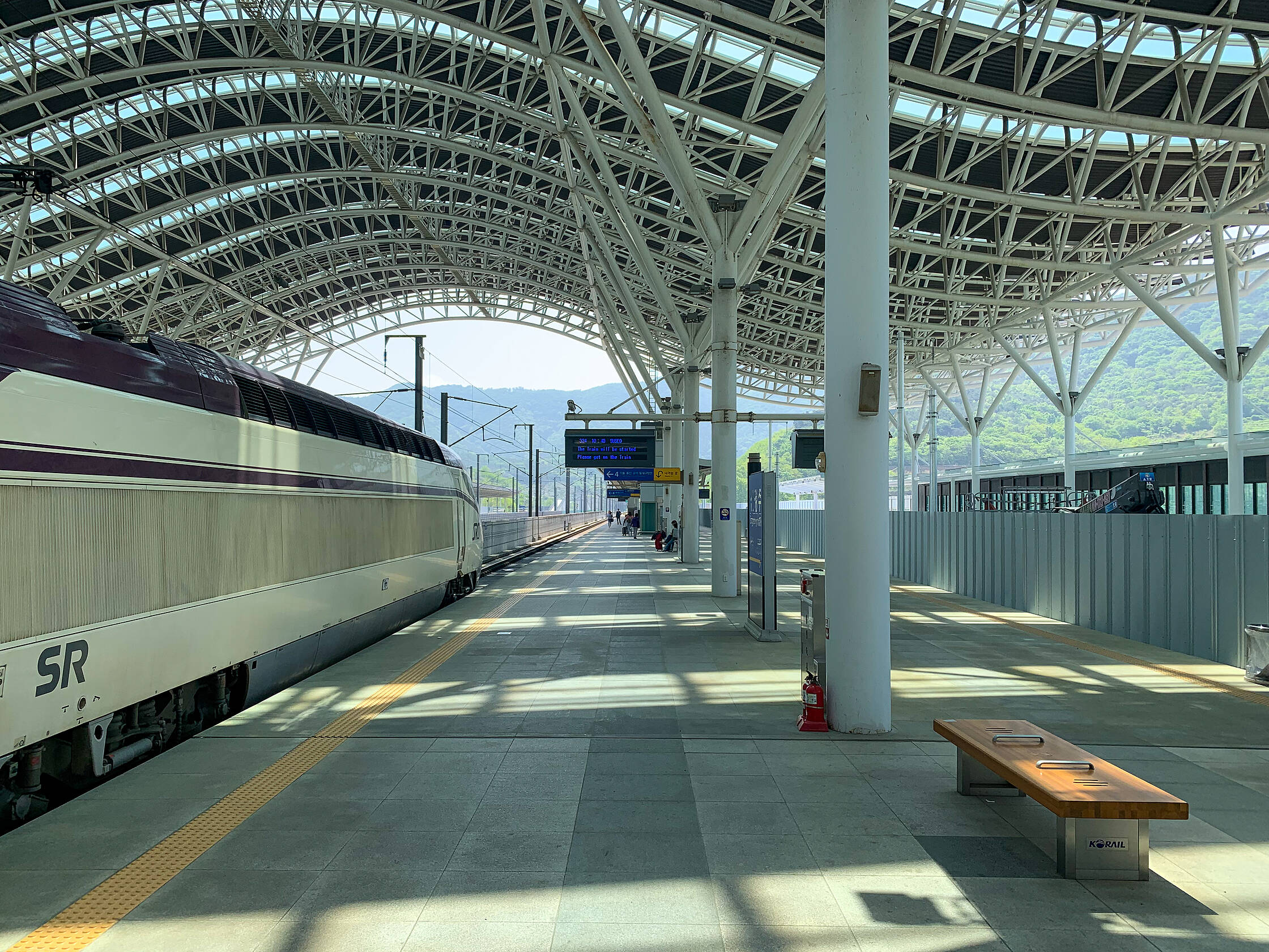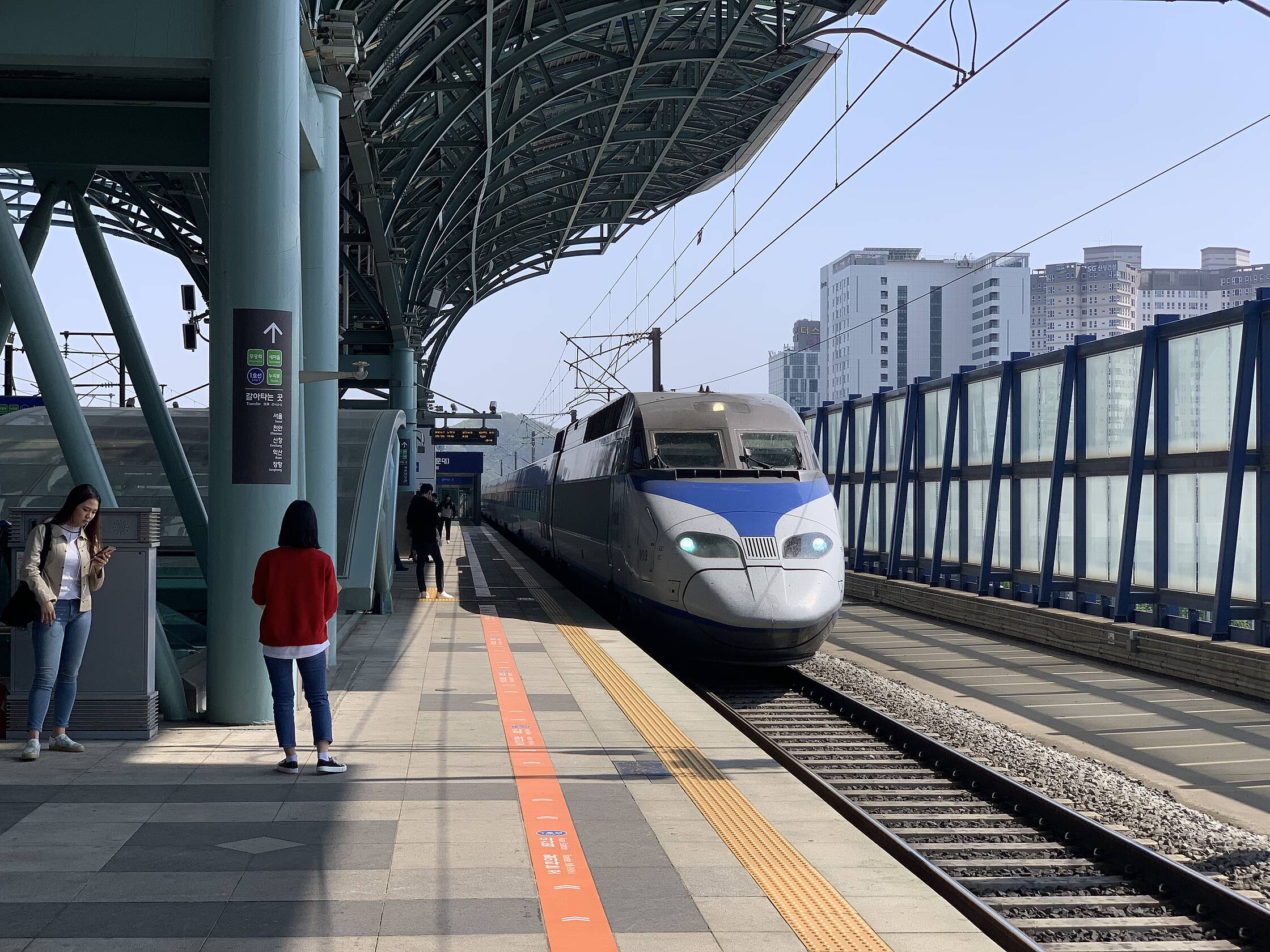 Nākamās dienas rītā sapakojām somas, teicām atvadas mūsu jaukajai viesnīcai un devāmies uz ātrvilcienu staciju. Korejā ir laba un kvalitatīva ātrvilcienu satiksme, tikai, diemžēl, tā izbūvēta tikai visai ierobežotā maršrutā starp Busanu un Seulu. Taču, kad ilgstoši pētīju, kas tieši Korejā ir jāredz – beigā secināju, ka interesantākās vietas ar vilcienu ir iespējams sasniegt. Te pieejami divu veidu ātrvilcieni, kurus teorētiski izpilda dažādi uzņēmumi – KTX un SRT, taču beigās secināju, ka vilcieni ir identiski, atšķiras logo un krāsojums, turklāt laikam nesen abi uzņēmumi apvienojušies. Tas nu tā, ja kādam rodas interese, kuru vilcienu izvēlēties.