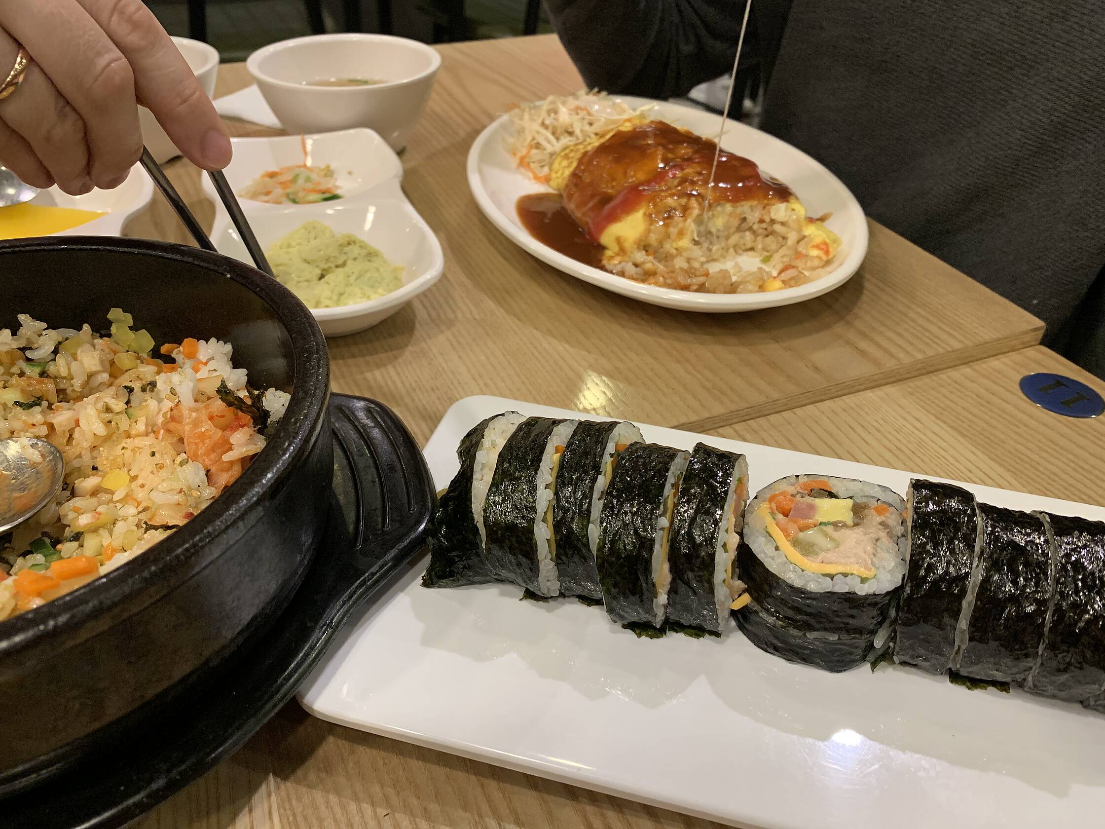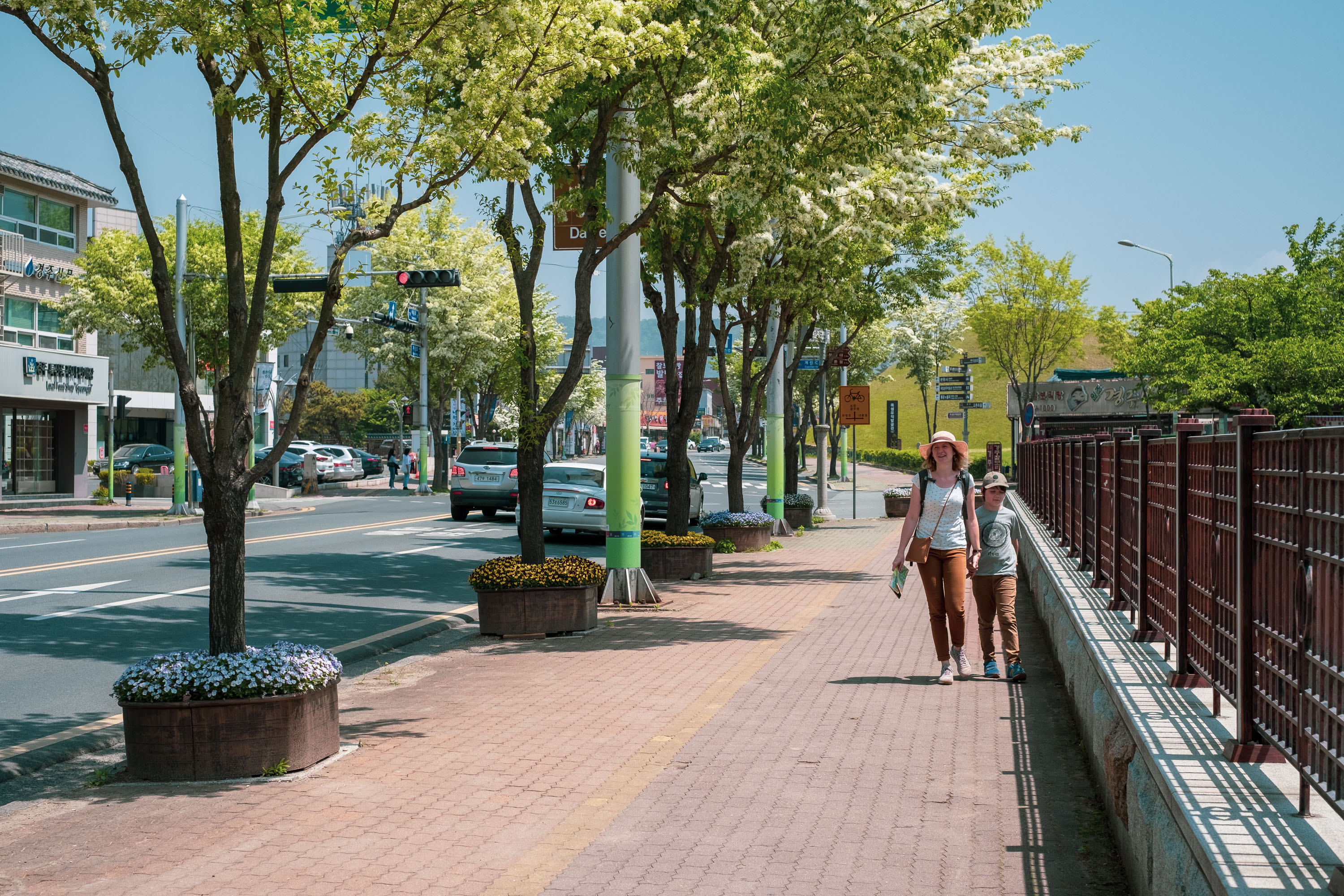 Apskatījām visus apskates objektus, izmetām pāris lokus pa ārkārtīgi sakarsušajiem laukiem, izgājām nelielā pārgājienā pa pilsētas nomali, tad atgriezāmies tūristiskajā centriņā un nelielā ēstuvītē nopirkām Gimbap, kas ir kaut kas līdzīgs ļoti resniem suši rullīšiem, kurus izgatavo turpat acu priekšā, rupji sagriež lielos gabalos un pasniedz kartona līdzņemamajā kastītē. Visi pēc tam sēž uz ielu apmalēm un ēd.