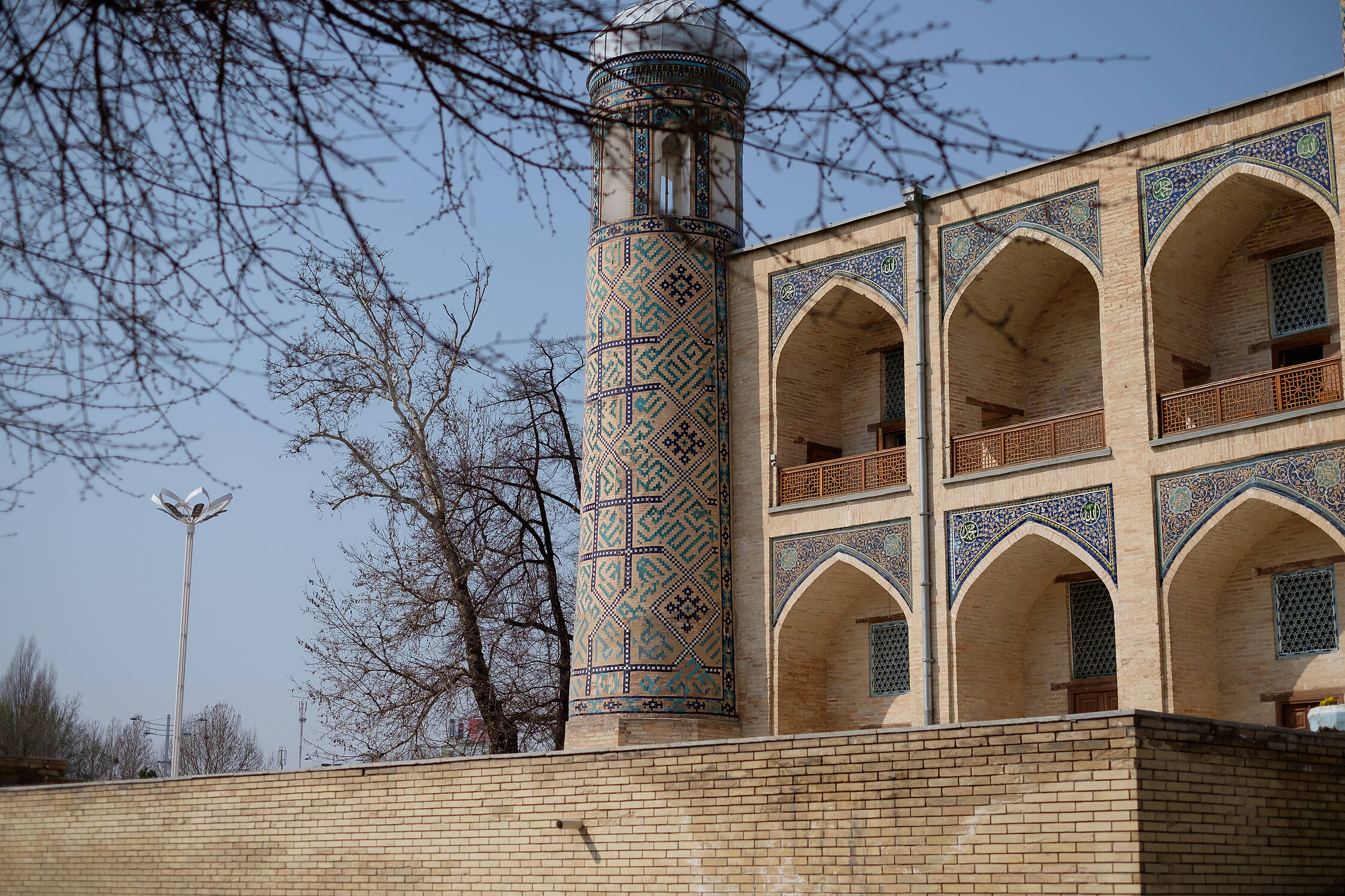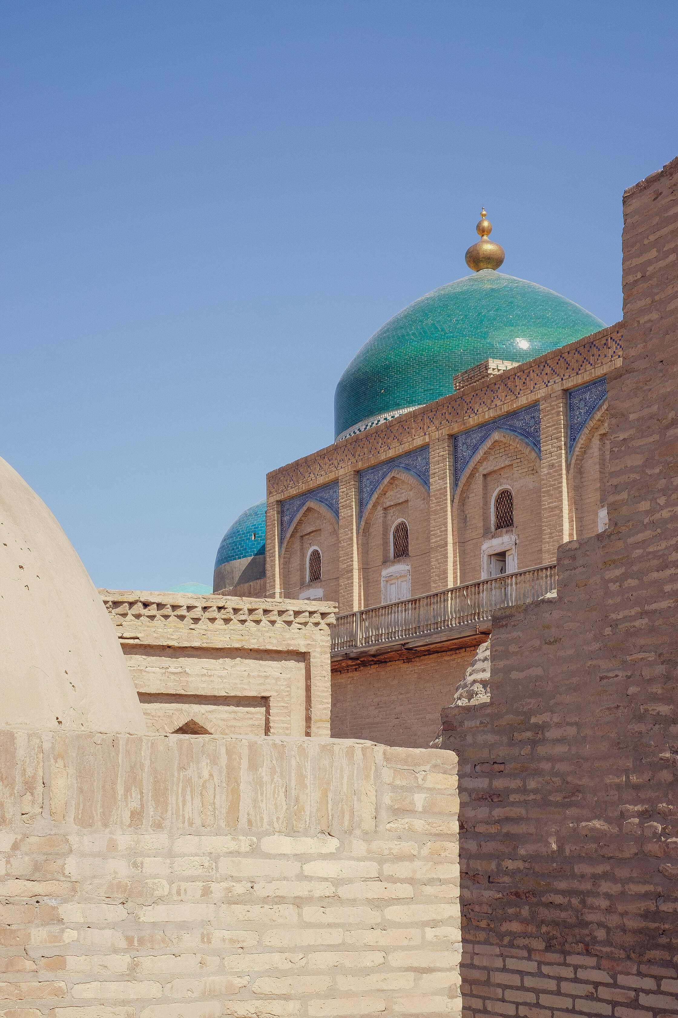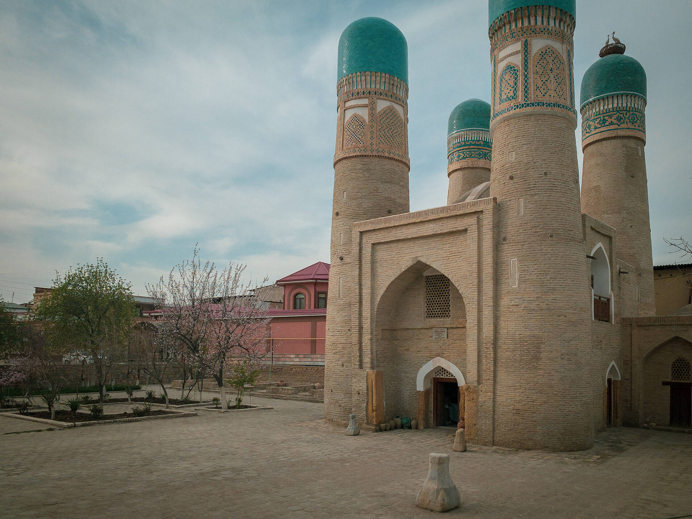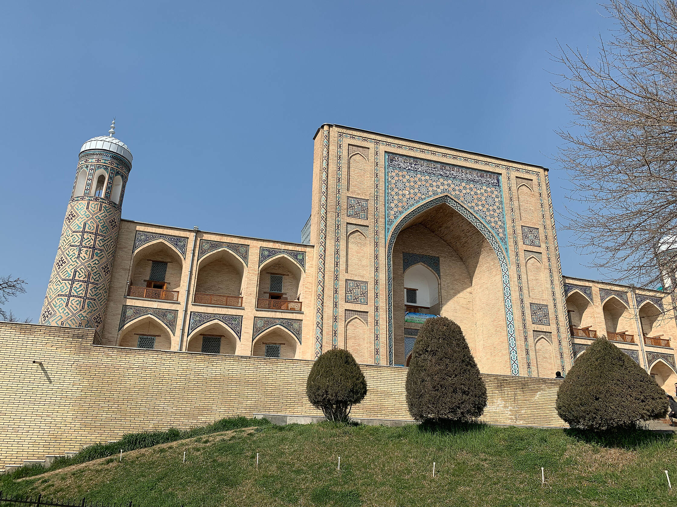 Netālu no tirgus ir interesanta medrese (medrese ir tāda savdabīga izskata ēka, kura islāma pasaulē ir garīgā skola, nereti atrodas tuvumā mošejām), pirmā skaistā ēka, kuru Uzbekistānā apskatījām. Nu jā, starp citu, Uzbekistāna ir musulmaņu valsts, taču te ir tāds kā pasīvais islāms. Tagad lūdzu piedodiet, ja sapinos terminoloģijā, es nevienu negribu aizvainot, vienkārši neesmu lietpratējs. Lielākā daļa uzbeku nepieder konkrētai islāma skolai, kā arī nav tādi izteikti musulmaņi, drīzāk “uz papīra musulmaņi”. Padomju laikos te vispār nenotika nekāda reliģijas praktizēšana, taču deviņdesmitajos, kad valsts atguva neatkarību, jaunais prezidents arī nebija īsti ar pilnu rubli, tāpēc tur nevarēja īsti saprast. Oficiāli nebija nekas aizliegts, taču minareti pareizajās stundās klusēja līdz pat pagājušajam gadam, kad pirmais un vienīgais prezidents nomira un pie varas nāca jauns, progresīvs un uz rietumiem orientēts prezidents. Pavisam nesen no dažiem minaretiem esot pirmo reizi atkanējuši muezīna aicinājumi uz lūgšanām. Kaut kādā mērā, man braucienā pietrūka šo maģisko saucienu, jo minaretu šajā valstī ir daudz, taču tie klusē.