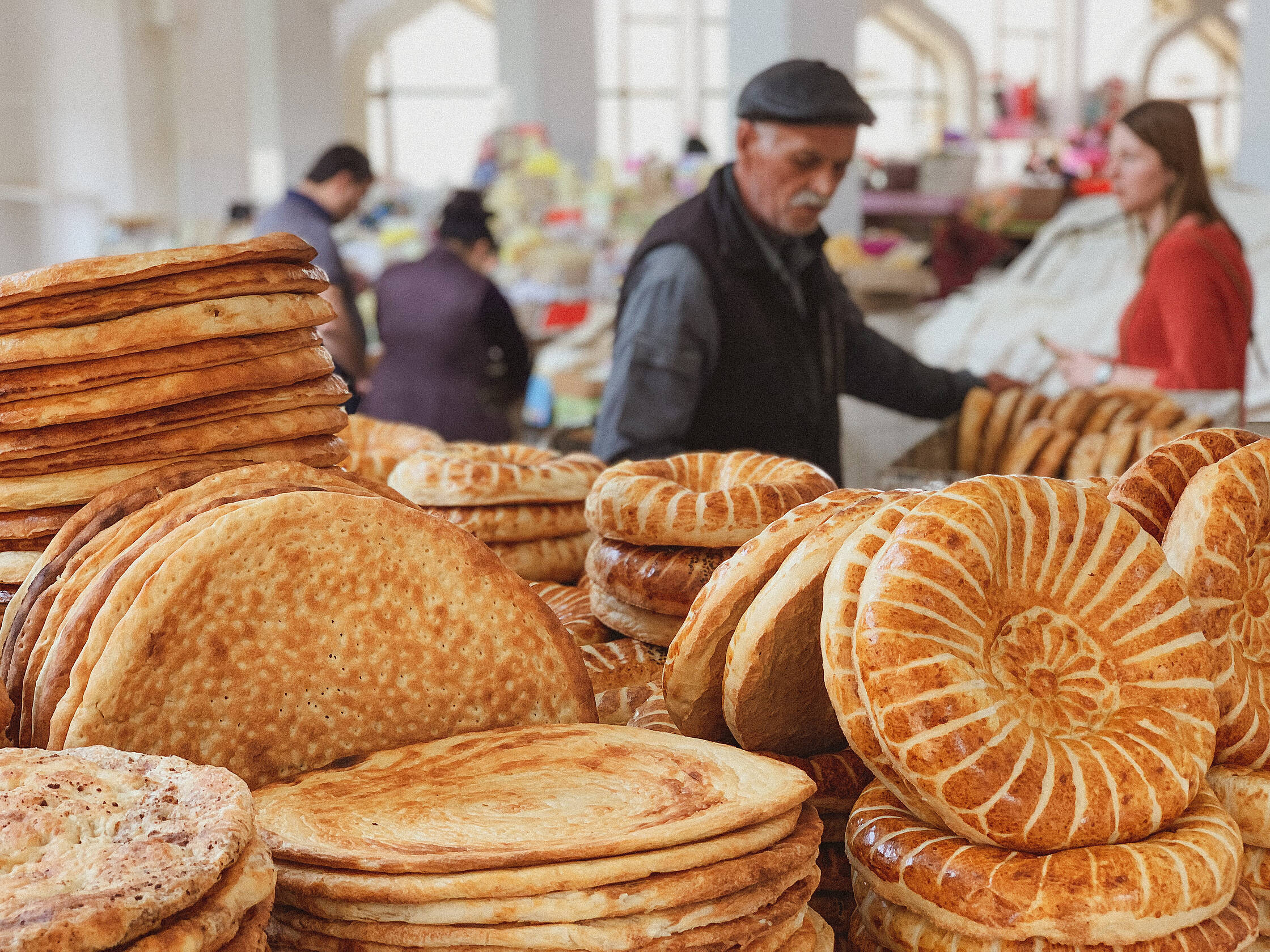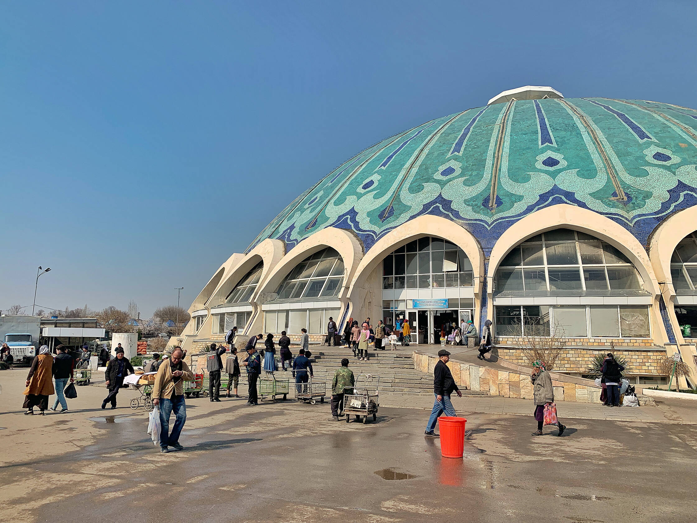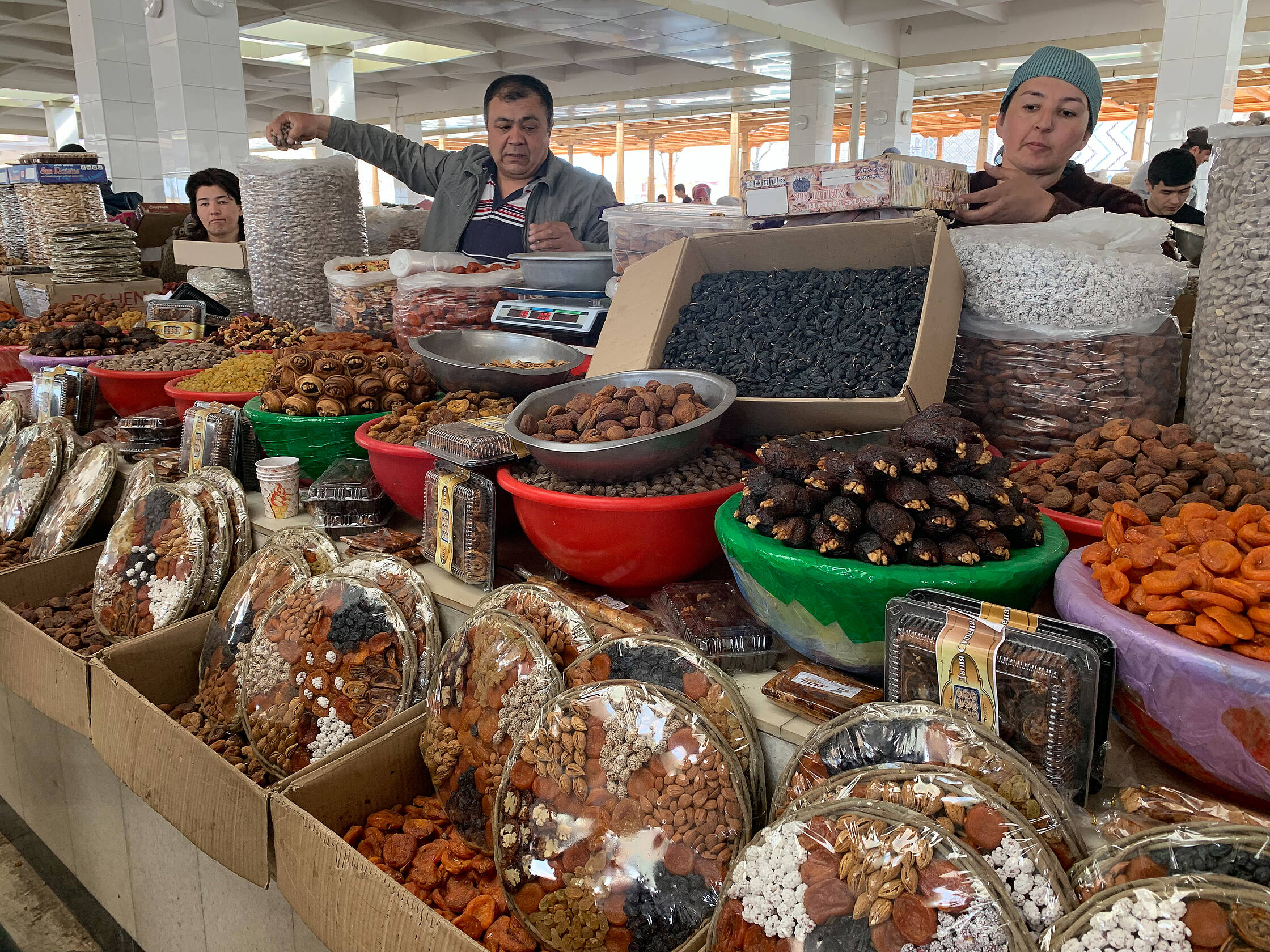 Izstaigājuši centru, aizbraucām uz tirgu. Interesanti, ka pārtikas veikalu šajā pilsētā ir visai maz un tie ir tādi jokaini. Tukši un neinteresanti. Tad nu sapratām kāpēc. Visa dzīvība ir tirgū. Te ir visi tie cilvēki, kuru nav citur. Skaņu, smaržu un krāsu eksplozija. Te var dabūt itin visu. Sapratām, ka Uzbekistānā cilvēki pārtiku pērk tieši te. Uz svara viss, sākot no miltiem un beidzot ar ziepēm. Izpētījām visu interesanto un nepazīstamo, kad mums piesitās bariņš jauniešu, kuri aicināja piedalīties kaut kāda klipa filmēšanā. Īsti nesapratām, ko filmēs, taču mums vajadzēja iztēloties, ka esam Samarkandā (viņiem budžets neļaujot braukt filmēt tur) un apbrīnojam vietējo maizi.