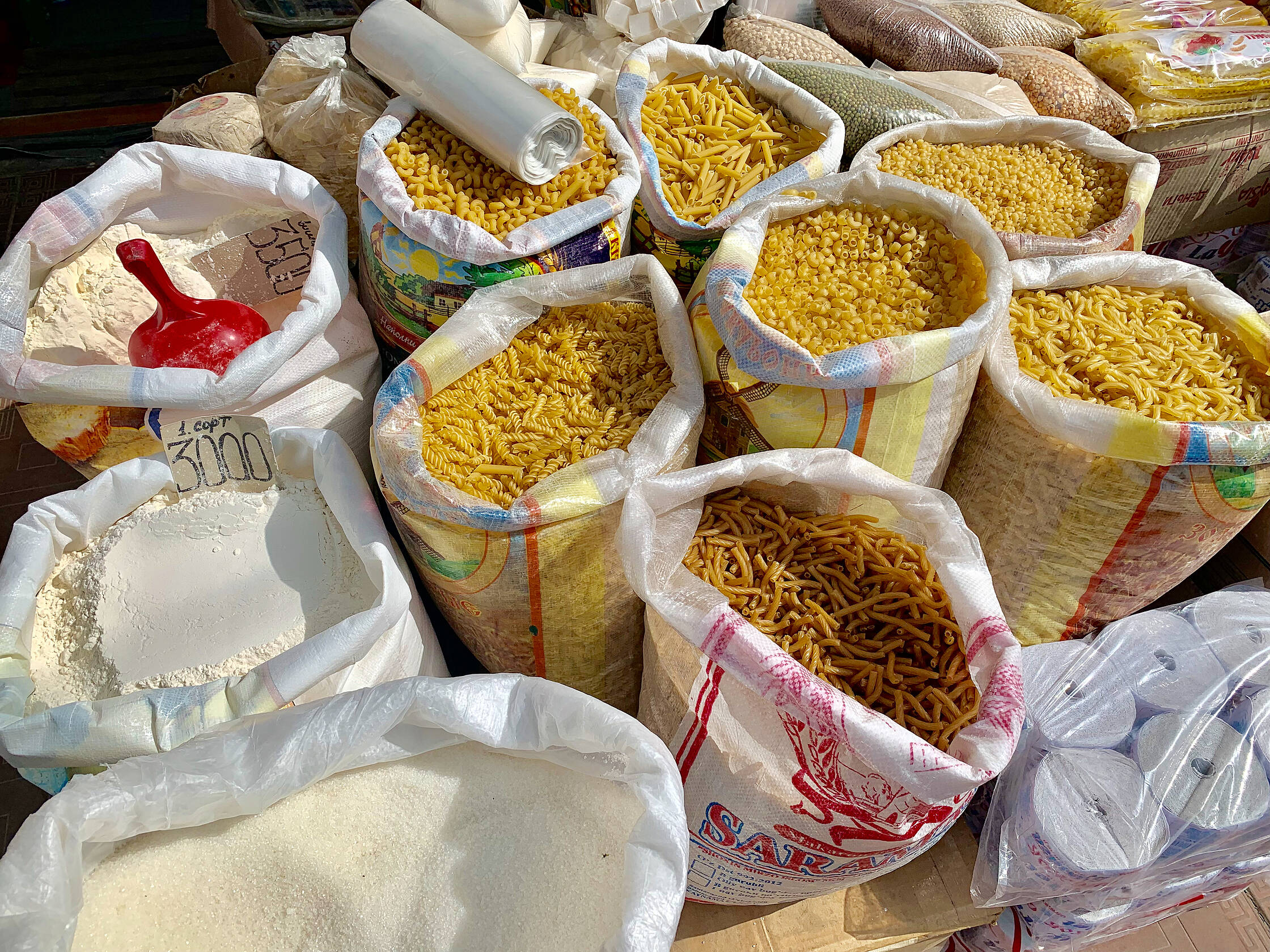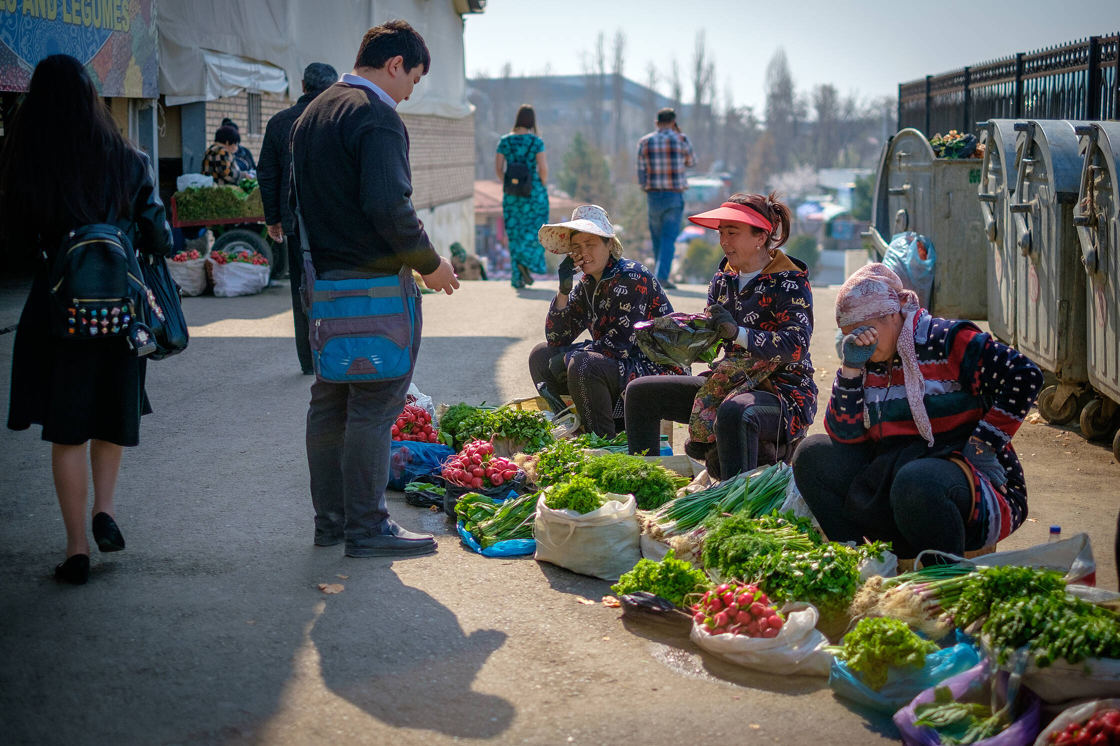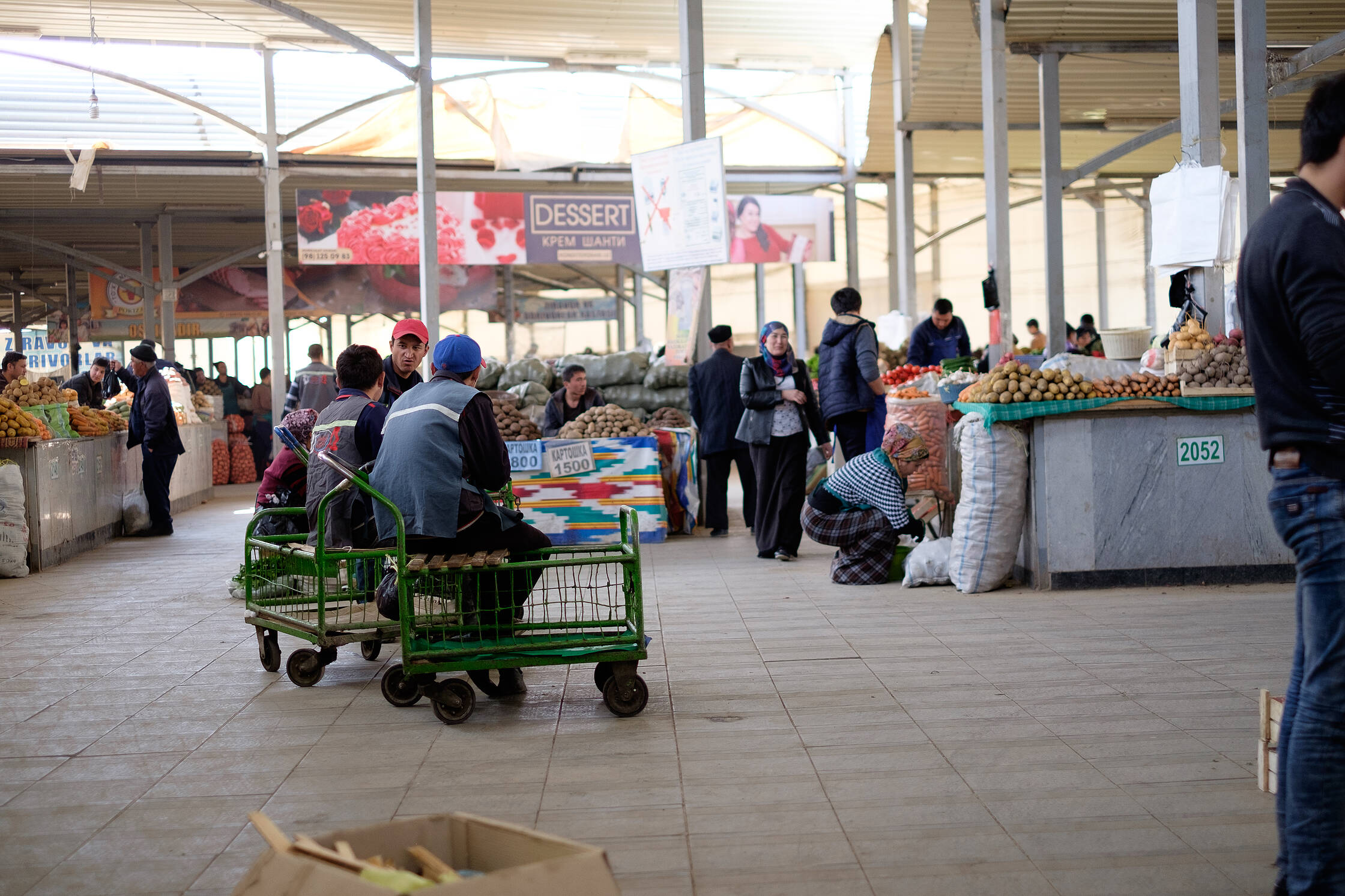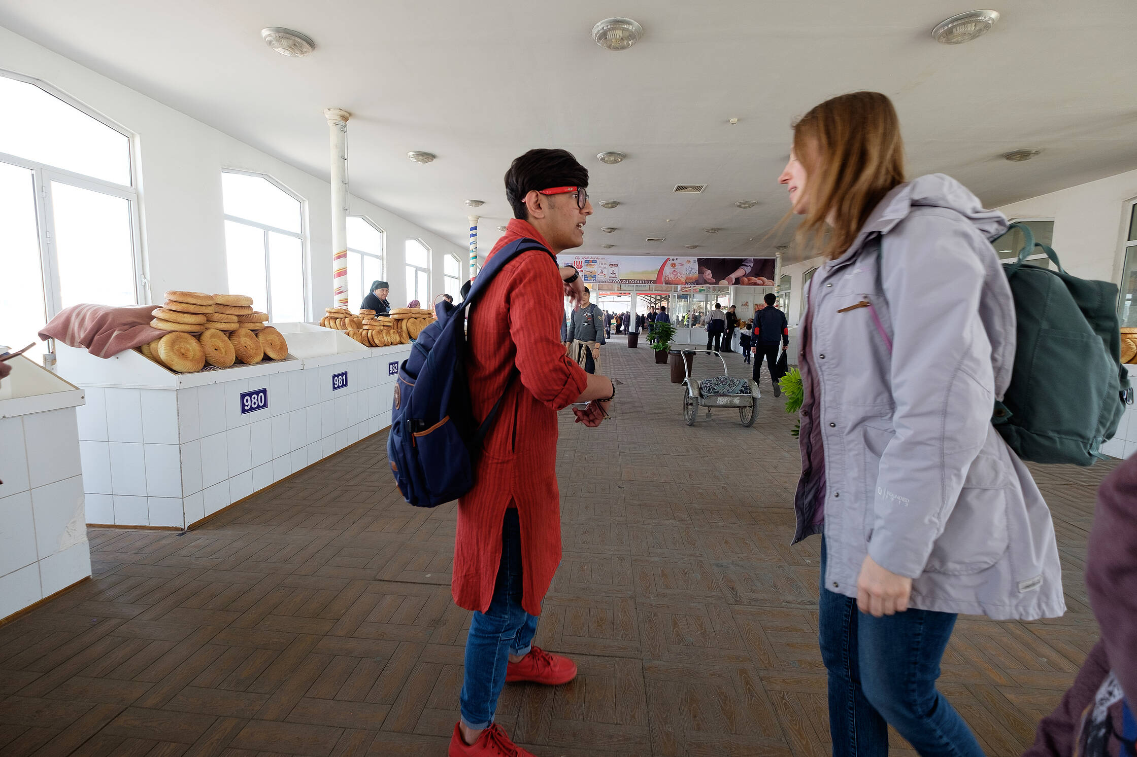 Izstaigājuši centru, aizbraucām uz tirgu. Interesanti, ka pārtikas veikalu šajā pilsētā ir visai maz un tie ir tādi jokaini. Tukši un neinteresanti. Tad nu sapratām kāpēc. Visa dzīvība ir tirgū. Te ir visi tie cilvēki, kuru nav citur. Skaņu, smaržu un krāsu eksplozija. Te var dabūt itin visu. Sapratām, ka Uzbekistānā cilvēki pārtiku pērk tieši te. Uz svara viss, sākot no miltiem un beidzot ar ziepēm. Izpētījām visu interesanto un nepazīstamo, kad mums piesitās bariņš jauniešu, kuri aicināja piedalīties kaut kāda klipa filmēšanā. Īsti nesapratām, ko filmēs, taču mums vajadzēja iztēloties, ka esam Samarkandā (viņiem budžets neļaujot braukt filmēt tur) un apbrīnojam vietējo maizi.