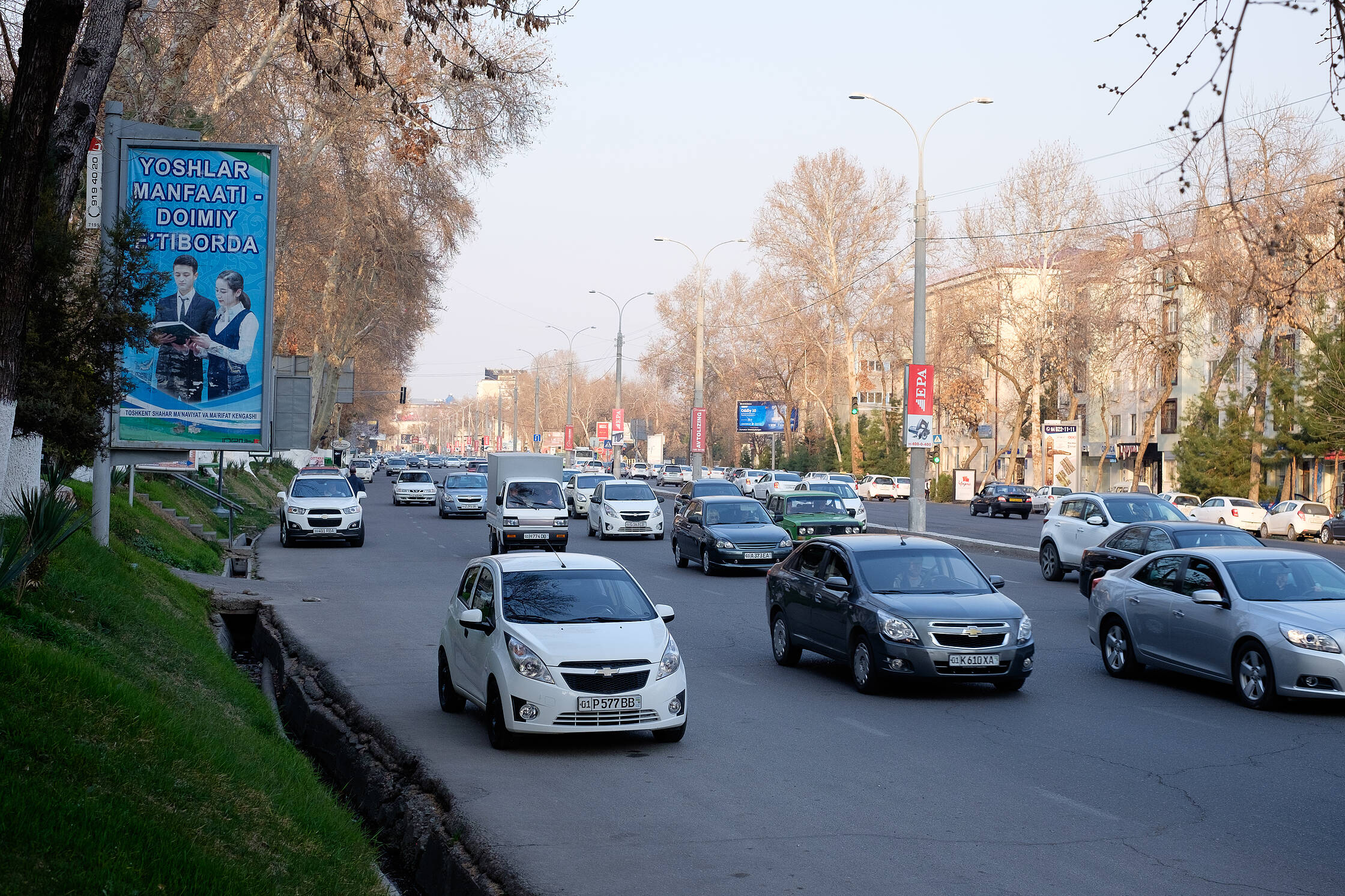 Lidmašīna pilnībā adekvāta klasika, Airbus A320, pārbaudīta vērtība. Dod silto ēdienu un rāda krievu filmas. Tante, kā no padomju ēdnīcas izkāpusi, draudzīgi sauc “Mīlīši, kam te vēl pēdējo zivs gabalu?” Taškentas lidostā muitnieks paskatās uz otru, saka - Eirosajuzam taču bezvīza, ja? Aha, ŠTAMP un esam valstī.