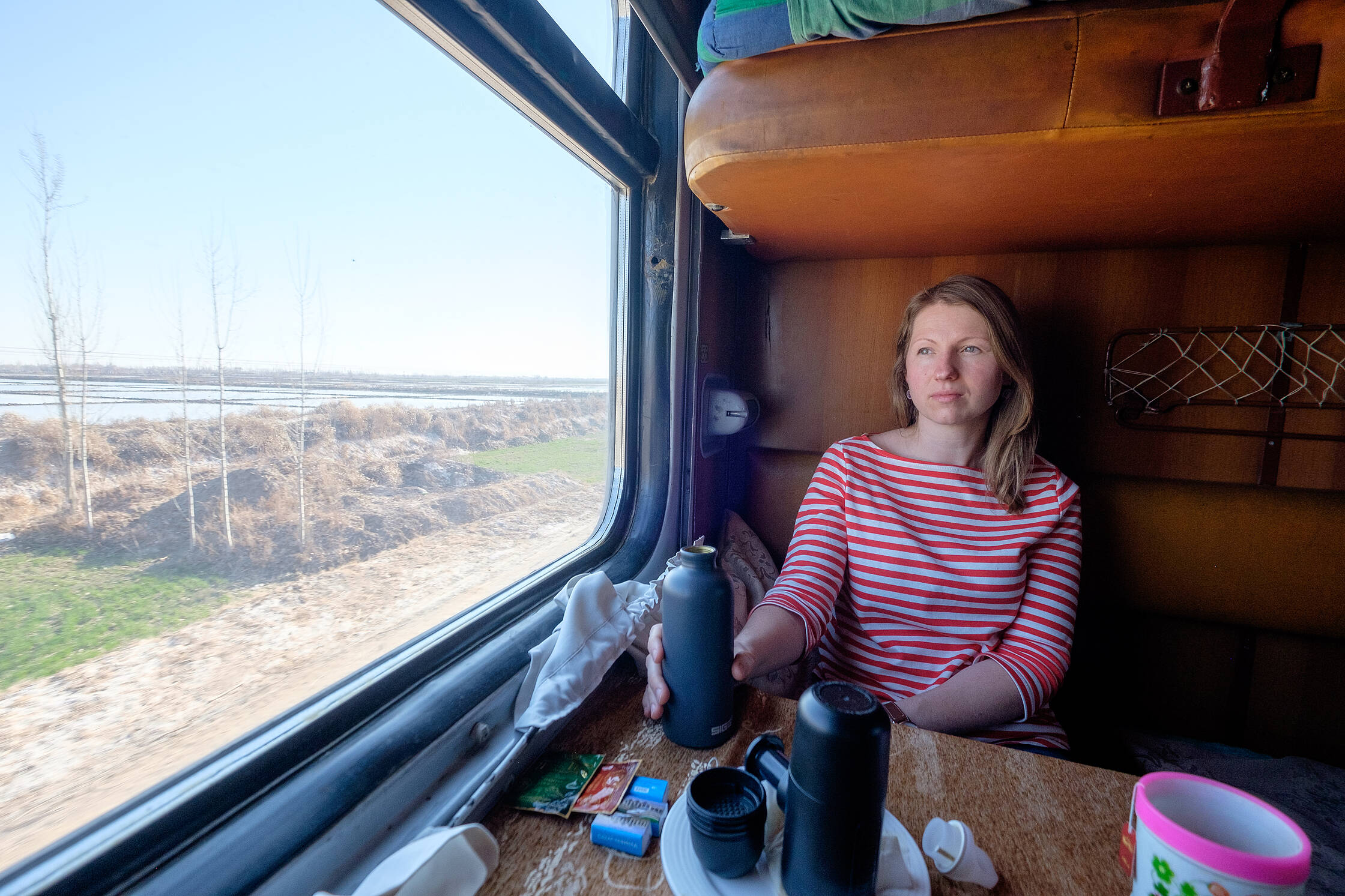 Pēc nelielās pastaigas, devāmies atpakaļ uz vilcienu. Čukinājām garām Turkmenistānas robežai, atkal apskatījām Amudarjas upi. Vagona galā esošajā “samovārā”, ja to tā var nosaukt, ņēmu karsto ūdeni kafijai, spēlējām kārtis, veicām lielos pārgājienus pa vagoniem. Vienā brīdī vagona pārzinis atzinās, ka viņam ir temperatūra un palūdza vai man nav kādas zāles. Iedevu ibuprofēnu, kurš viņam tik labi iedarbojās, ka palūdza vēl pārīti, vēlākam.