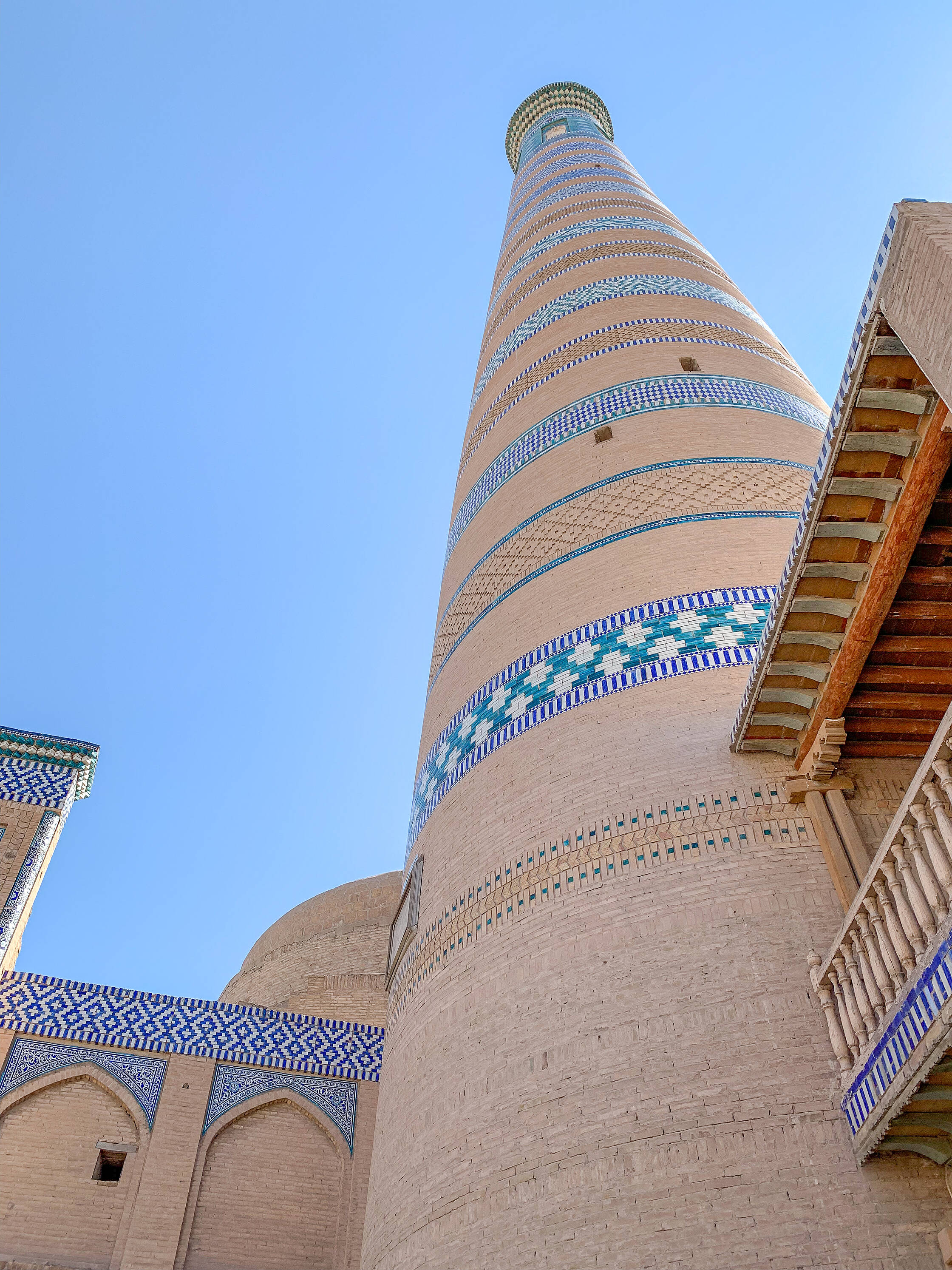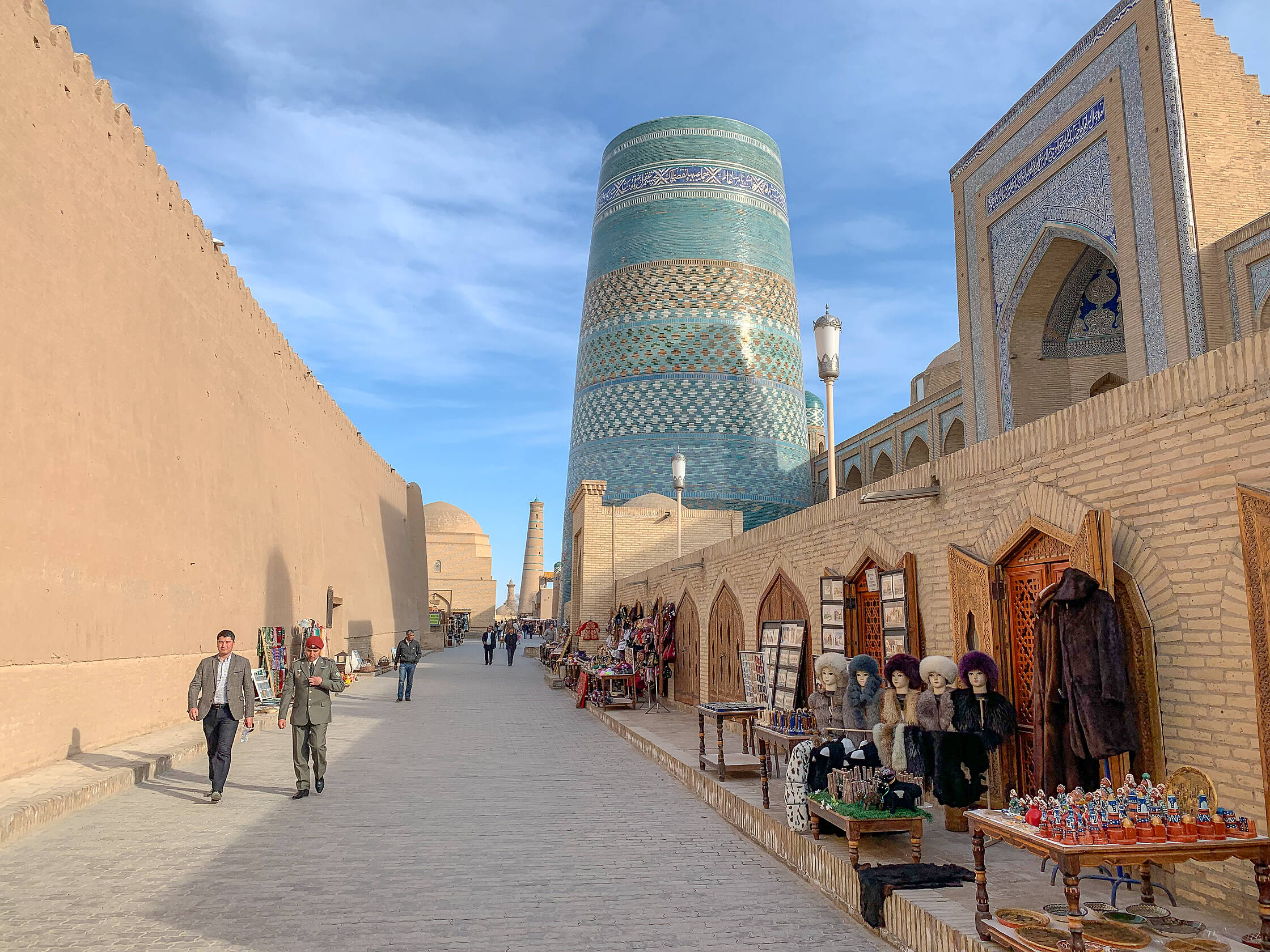Hivā pavadījām visu dienu, staigājot pa mazajām ieliņām, kāpjot minaretos, kaulējoties ar tirgotājiem. Redzējām gandrīz tikai vietējos tūristus, pārsvarā kāziniekus, kas ar šausmīgi uzkrītoši bēdīgām līgavām reizēm staigāja pa pilsētu un fotografējās. Pilsētā jau tā nav daudz ēstuvju, taču arī tās, kuras bija atrodamas, bija aizdomīgi tukšas un nepiedāvāja ne pusi no saviem menu minētajiem ēdieniem. Marts vēl esot nesezona. Runā, ka vasarā te esot lielāks tūristu daudzums, tad arī esot labāks ēdiena piedāvājums. Nopirkām arī vienoto muzeju biļeti un apstaigājām vairākus smieklīgus muzejus - smieklīgus tāpēc, ka dažos no tiem nebija pat gaismu. Gaisā pelējuma smaka, neizgaismotas fotogrāfijas pie sienām, pusaizmiguri dežurante guļ kaktiņā uz krēsla. Tādi ļoti padomju stila tie muzeji. Viens pat bija prezidentam veltīts, sienas ar partijas sanāksmju bildēm. Un ierīkots tāds, piecsimt gadus vecā medresē. Jokaini, nu.