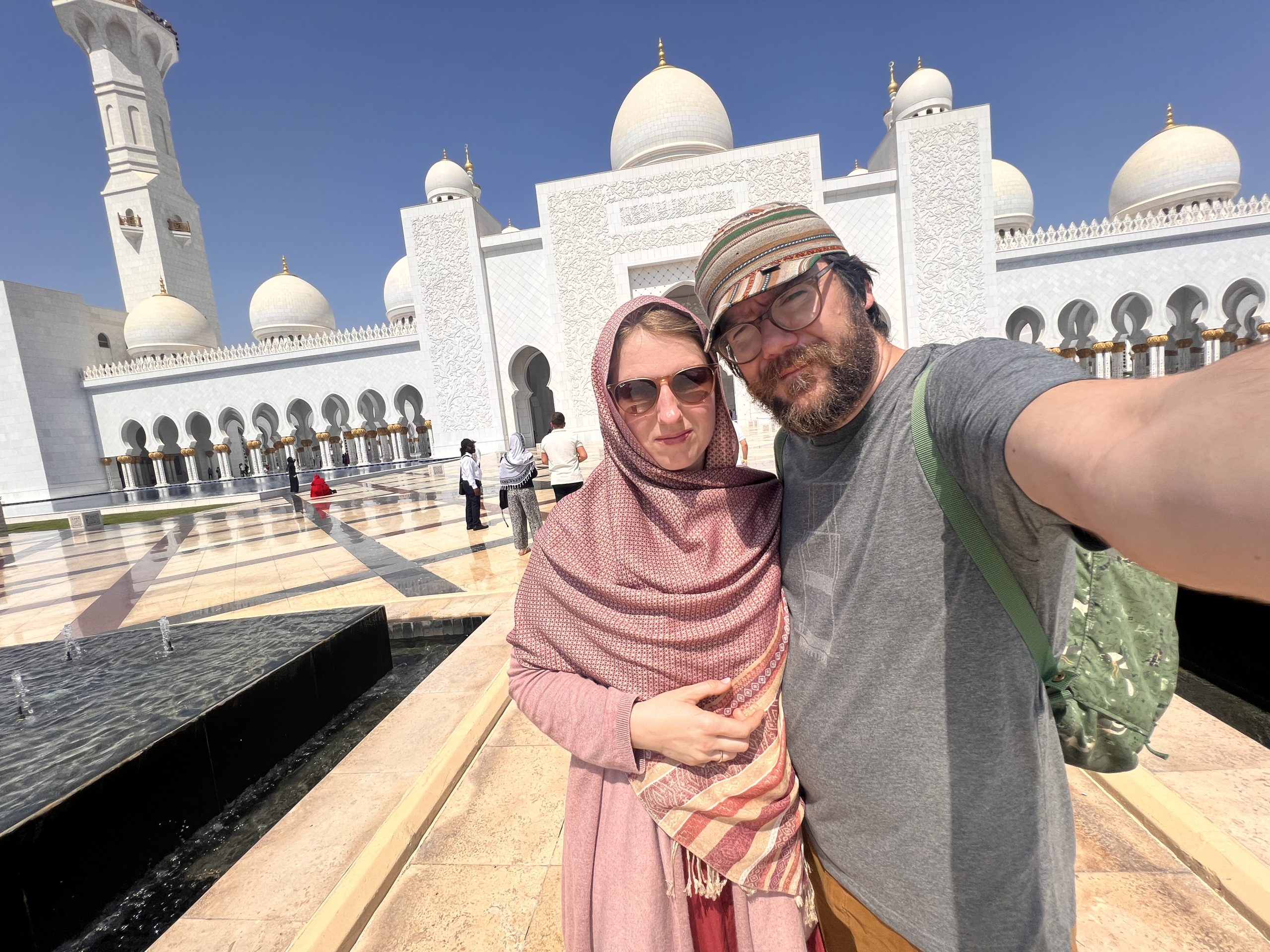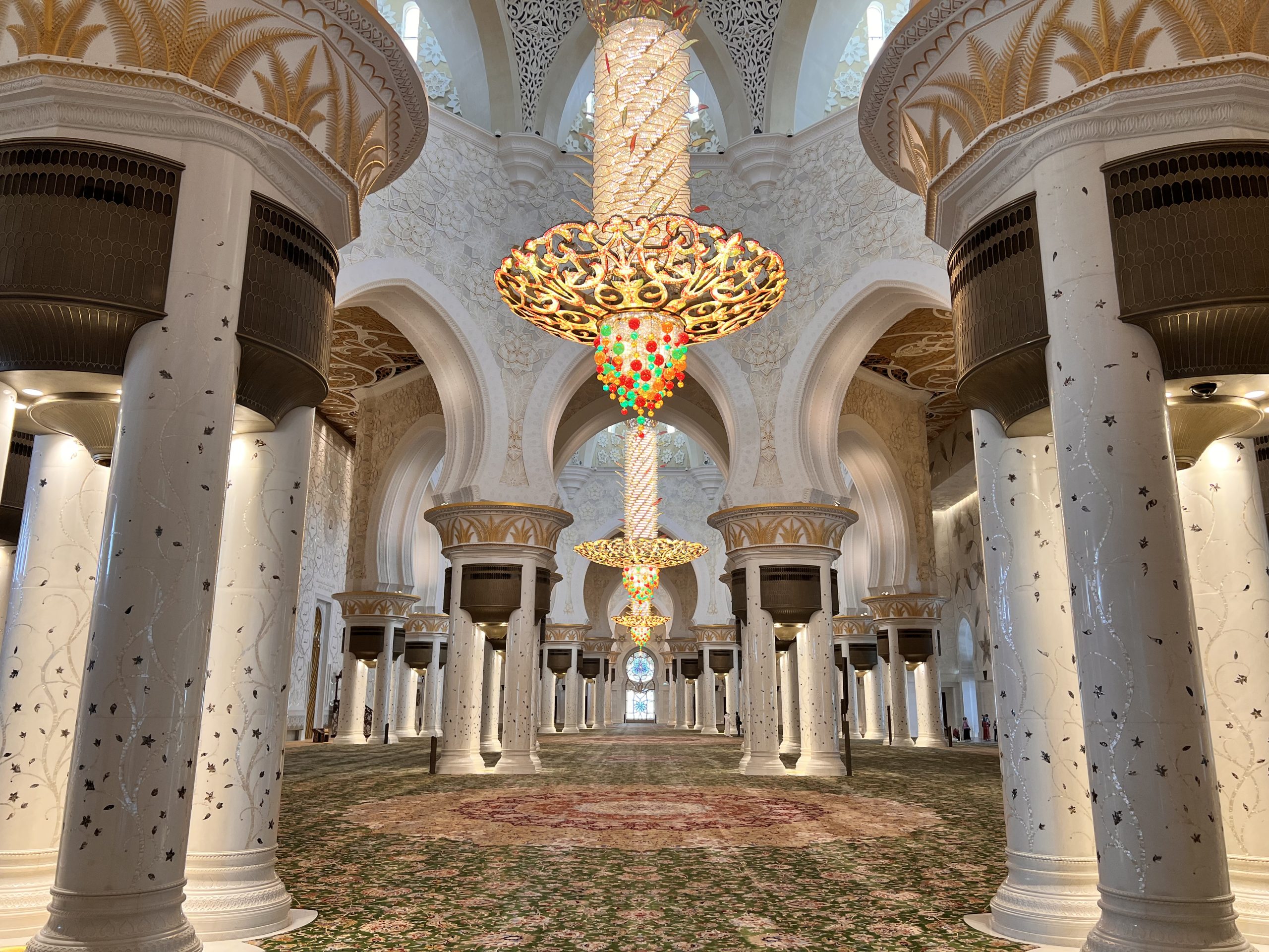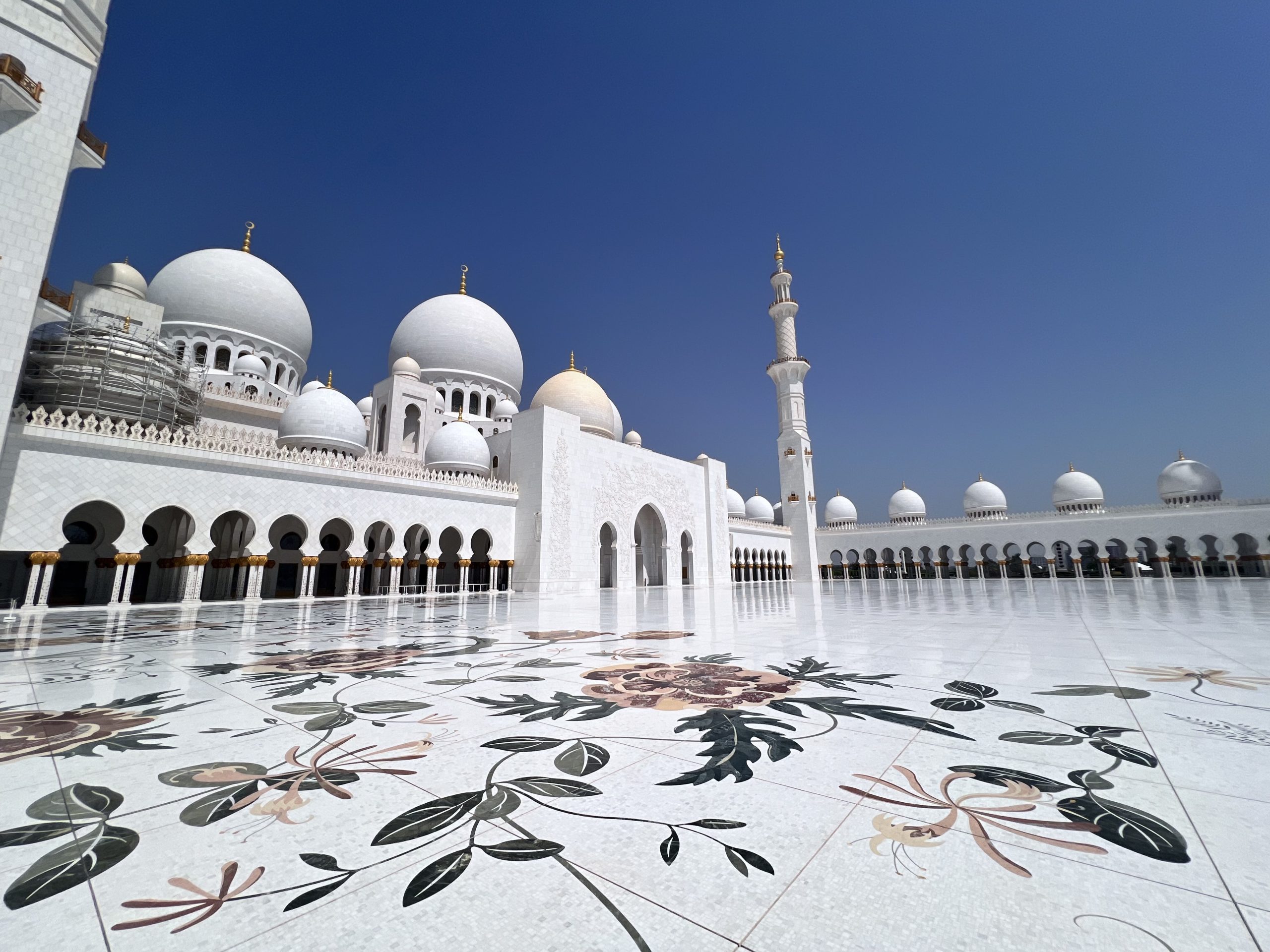 Cik iespējams, pastaigājām pa palmu ēnām, pārbaudījām 35C grādu ūdens temperatūru. Pēc brokastīm nolēmām braukt uz Sheikh Zayed mošeju, kas ir Abu Dabi top apskates objekts. Pilsēta ir ļoti jocīga. Daudzi ir bijuši Dubaijā, bet te varbūt pat ir vēl jocīgāk, jo māju ir mazāk un izteitkāka ir sajūta, ka mājas ir vienkārši teleportētas un novietotas tuksneša vidū. Viss ir perfekts un sterils, cilvēku nekur nav, tāda sirreāla sajūta. Ar Uber tuvojoties slavenajai mošejai, bija sajūta, ka viņa šodien slēgta, jo neredzējām nevienu cilvēku. Teritorija tur ir milzīga, tāpat kā pati mošeja, kuru var redzēt jau no liela attāluma.