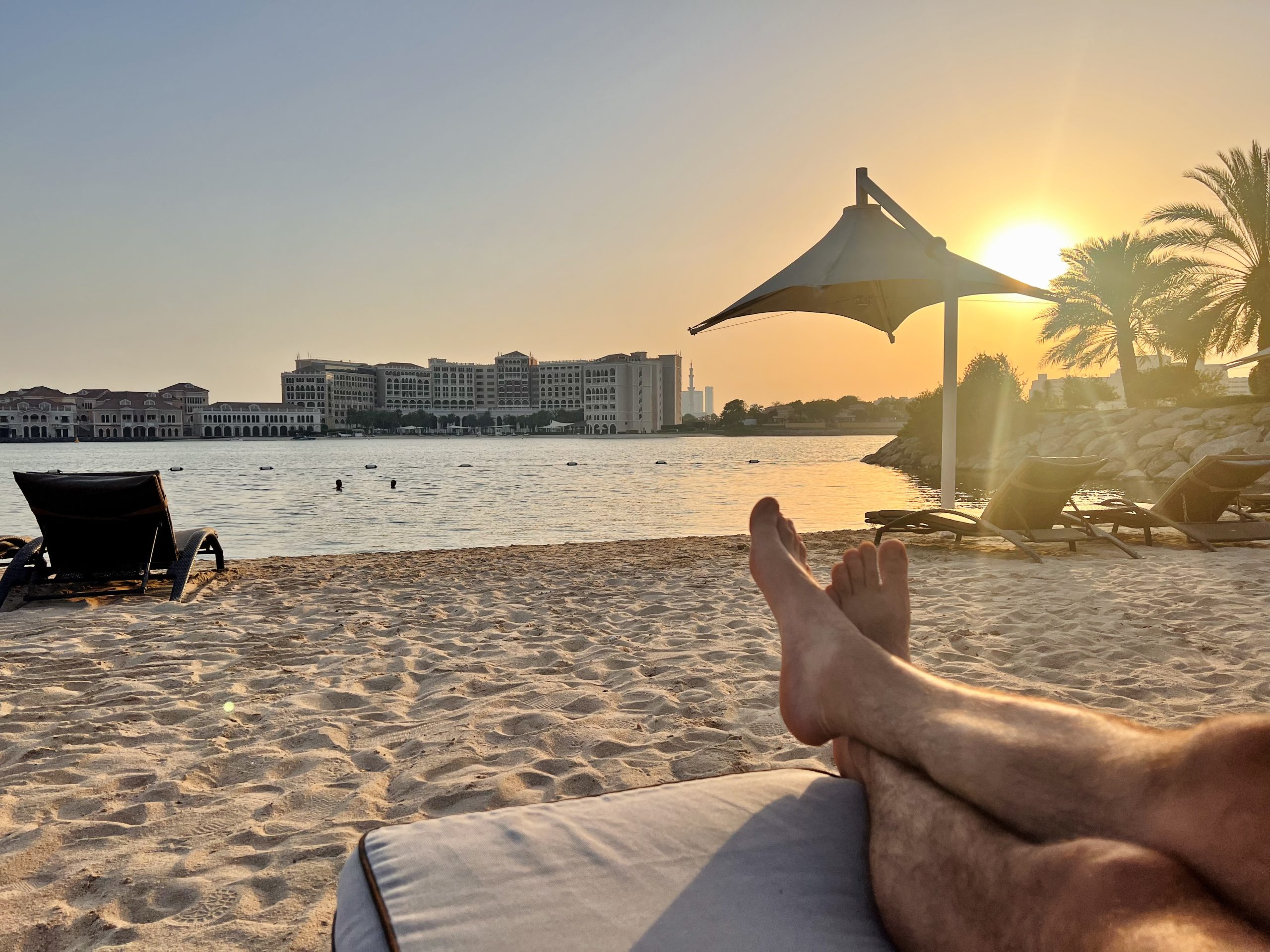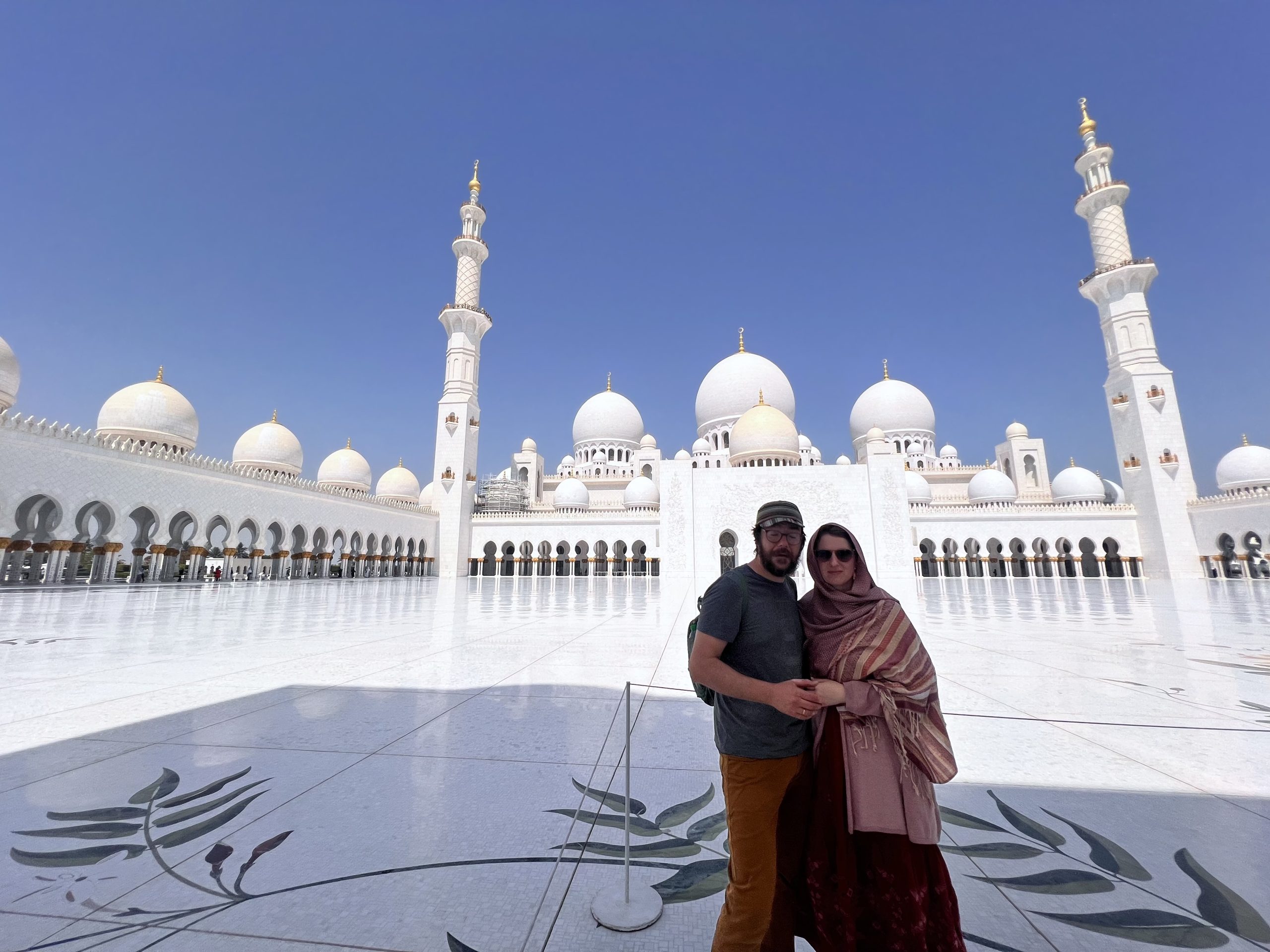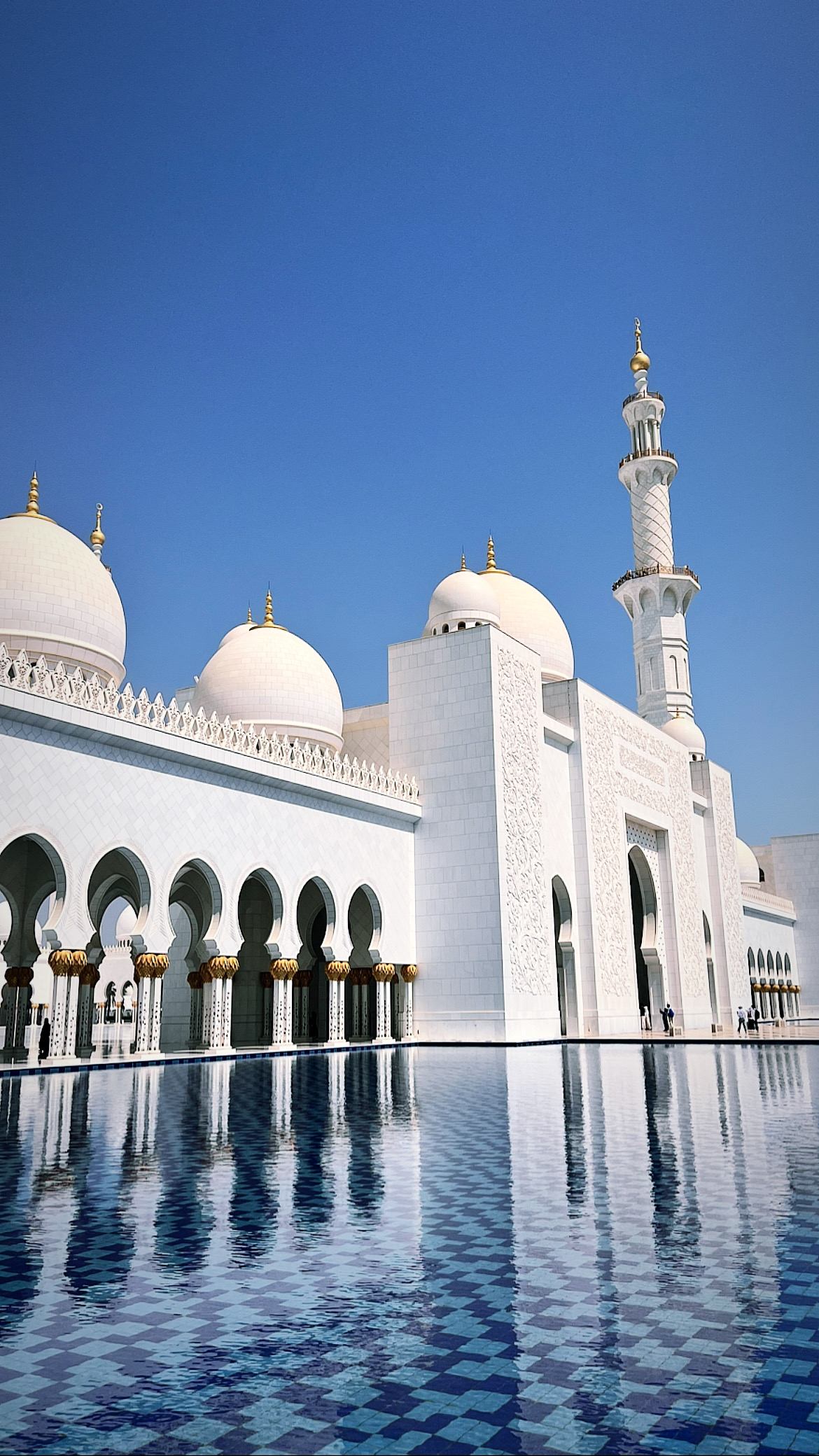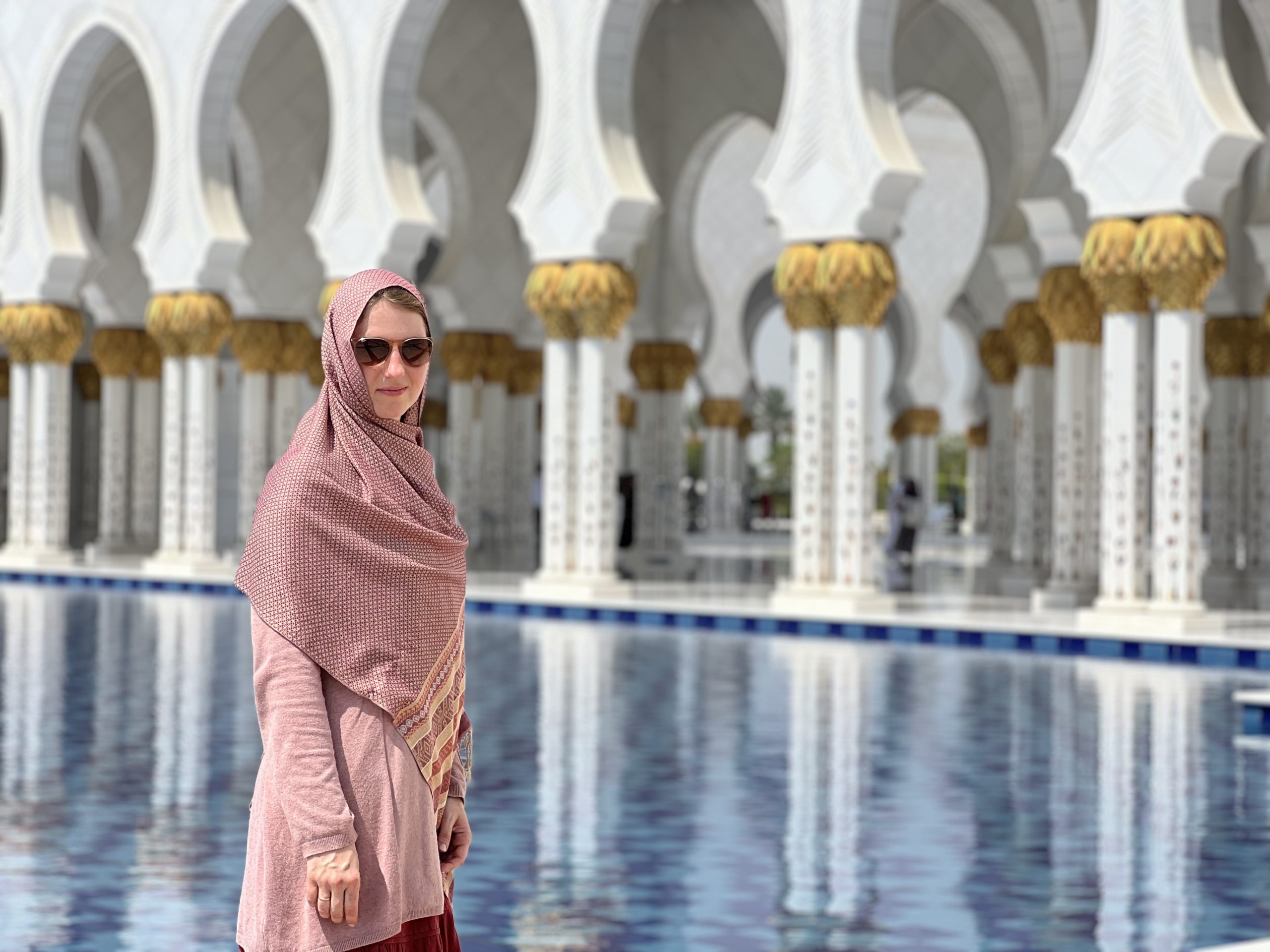 Cik iespējams, pastaigājām pa palmu ēnām, pārbaudījām 35C grādu ūdens temperatūru. Pēc brokastīm nolēmām braukt uz Sheikh Zayed mošeju, kas ir Abu Dabi top apskates objekts. Pilsēta ir ļoti jocīga. Daudzi ir bijuši Dubaijā, bet te varbūt pat ir vēl jocīgāk, jo māju ir mazāk un izteitkāka ir sajūta, ka mājas ir vienkārši teleportētas un novietotas tuksneša vidū. Viss ir perfekts un sterils, cilvēku nekur nav, tāda sirreāla sajūta. Ar Uber tuvojoties slavenajai mošejai, bija sajūta, ka viņa šodien slēgta, jo neredzējām nevienu cilvēku. Teritorija tur ir milzīga, tāpat kā pati mošeja, kuru var redzēt jau no liela attāluma.