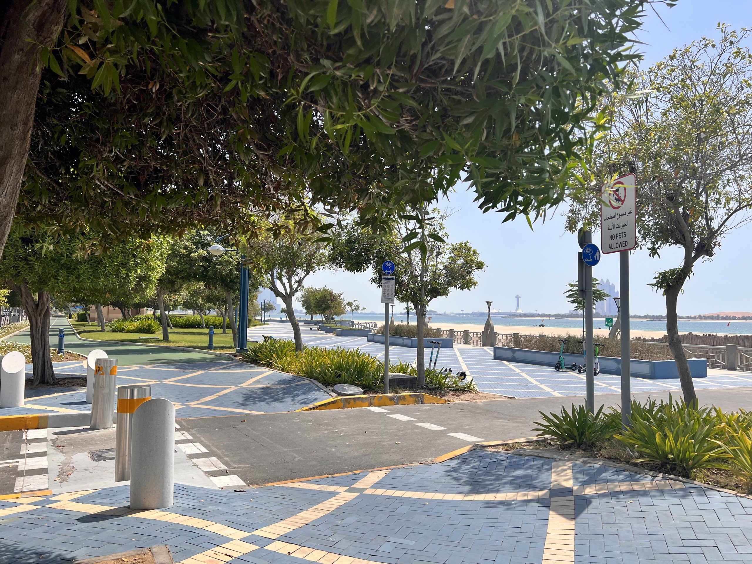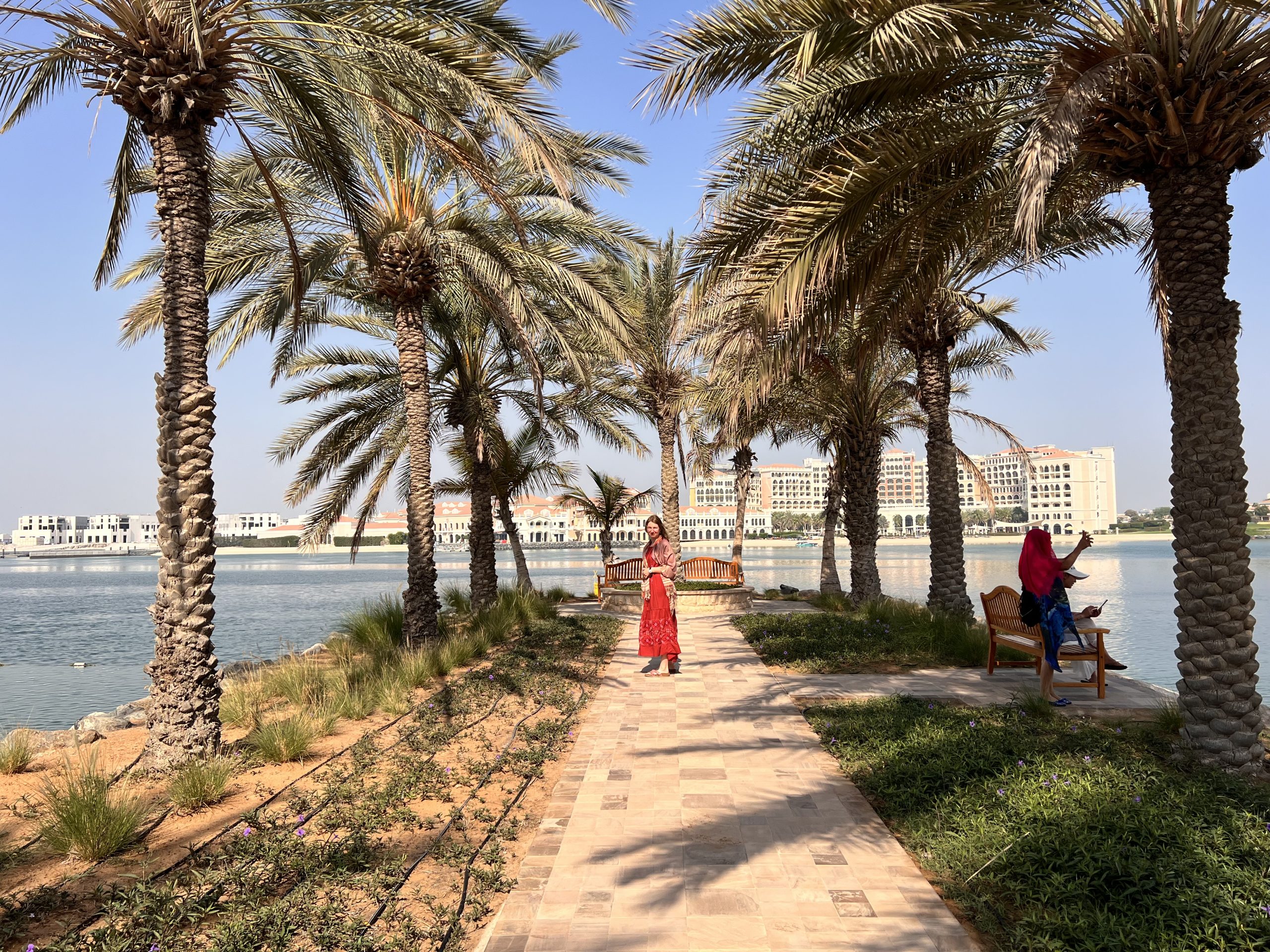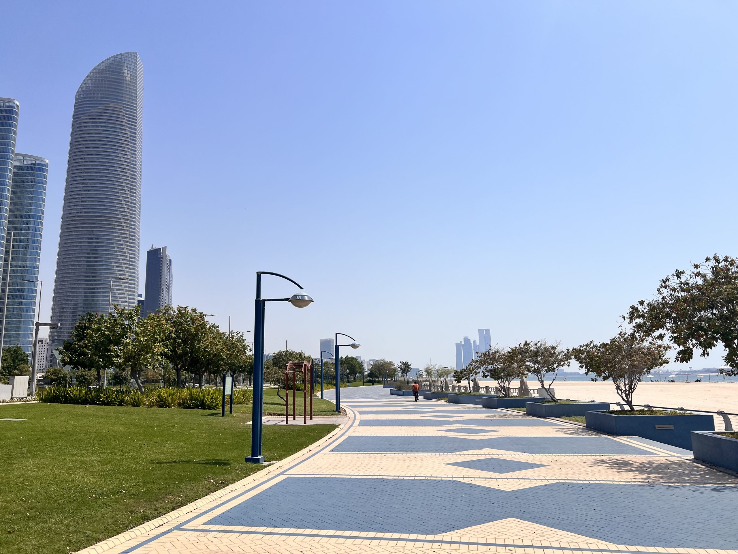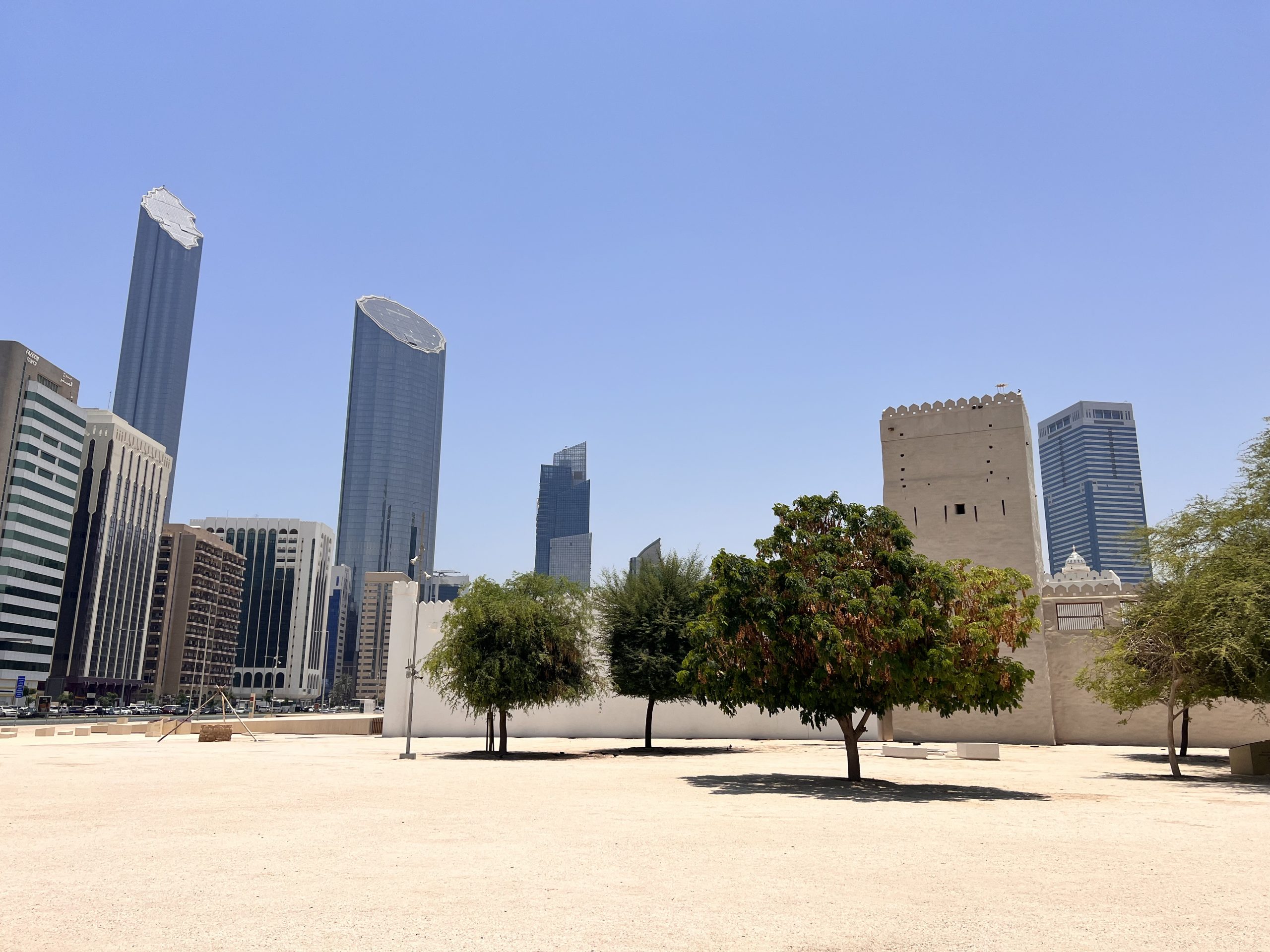 Pēc mošejas apmeklējuma gribējām braukt ar autobusu, tāpēc ieslēdzāmies kondicionētajā pieturas būdiņā, kamēr to gaidījām, bet tad izrādījās, ka autobusos ņem tikai skaidro naudu un brauciens atkrita. Braucām vien ar Uber. Centrā bija vēl pāris vietas, kur gribēju aiziet, bet visi tie plāni sabruka dēļ anormālā karstuma. Ātriem soļiem, vadoties pēc reto koku ēnām, tikām līdz vecajam fortam, atkal noslēpāmies info centra kondicionierī, tad līdzīgā skrējienā tālāk uz veikalu utt. Te neko ar kājām īsti apmeklēt nevaru rekomendēt, īpaši jūnija vidū. Neskatoties uz to, pēc lielveikala un pusdienām bijām arī aizgājuši līdz pludmalei, pastaigājām pa promenādi un tad arī devāmies atpakaļ uz viesnīcu, kur papeldējāmies siltajā ūdenī. Vakarpusē atklājām, ka viesnīcā ir bezmaksas laiva pa tādu kā Venēcijas stila kanālu sistēmu no viesnīcas līdz tuvākajam greznajam “tirgum”, kurš gan bija tāds puspabeigts – liela daļa vietu bija slēgtas un tur īsti nebija ko darīt. Tāda gan sajūta ir visu laiku Abudabi, vai nu cilvēku nav, jo tie slēpjas pazemē, vai cilvēku nav vienkārši tāpat. Viss tāds mākslīgs, tukšs un sterils. Varu saprast, jo kurš gan te varētu gribēt braukt un dzīvot, izņemot piemānītos migrantu strādniekus, kuriem atņemot pases un piespiežot būvēt visas tās lielās mājas.