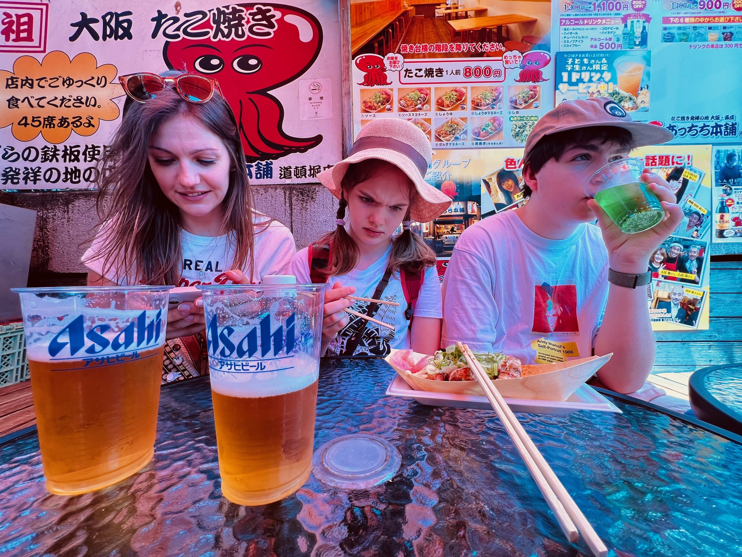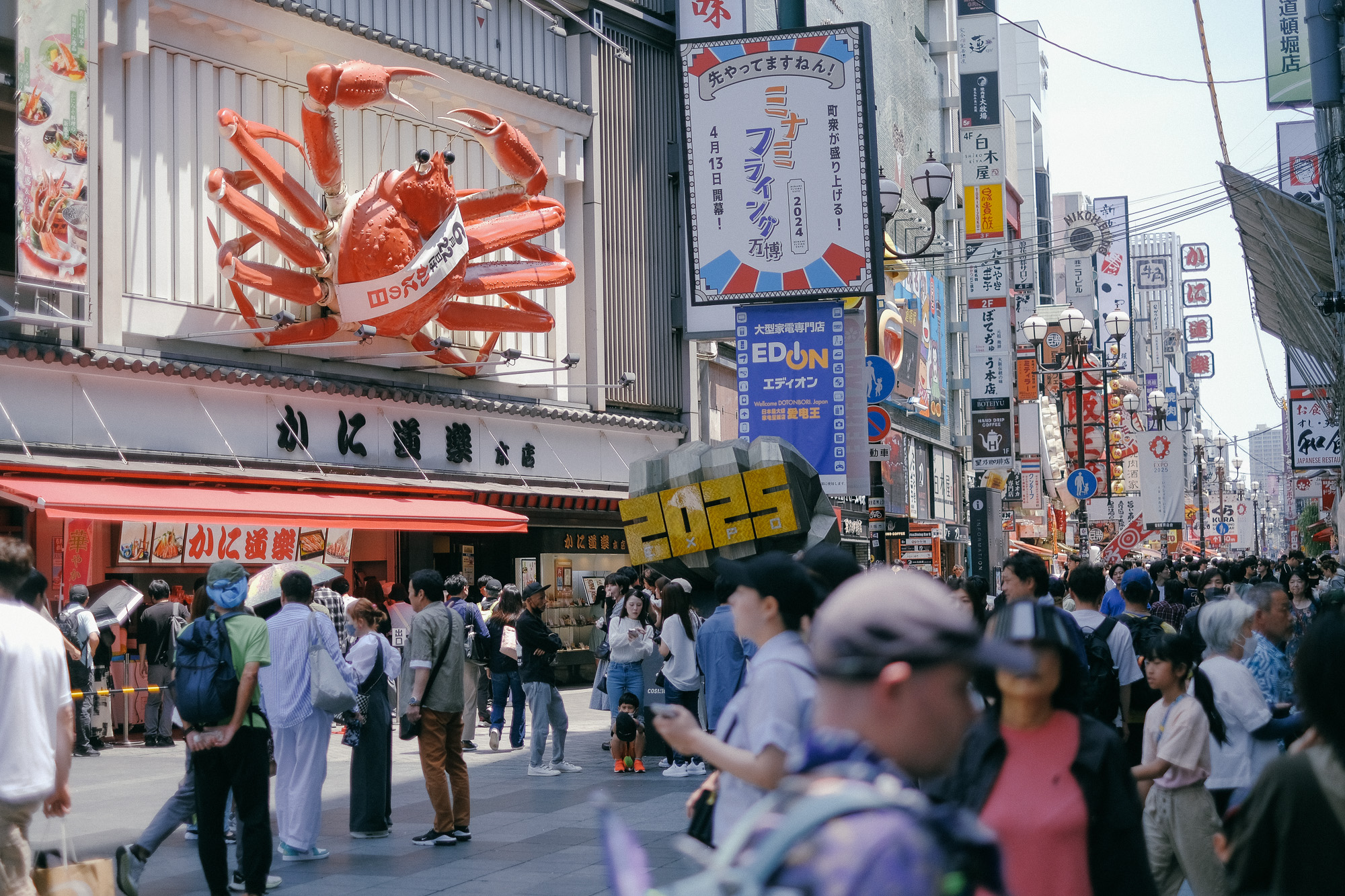 Nākamais pieturas punkts bija otra zināmākā apskates vieta, Dotonbori iela, kurā vienmēr ir vājprātīgi daudz cilvēku un kuras slavenākās iezīmes ir lielie, kustīgie krabji un astoņkāji virs ielu ēstuvēm, kur pārdod šajās izkārtnēs redzamās uzkodas.