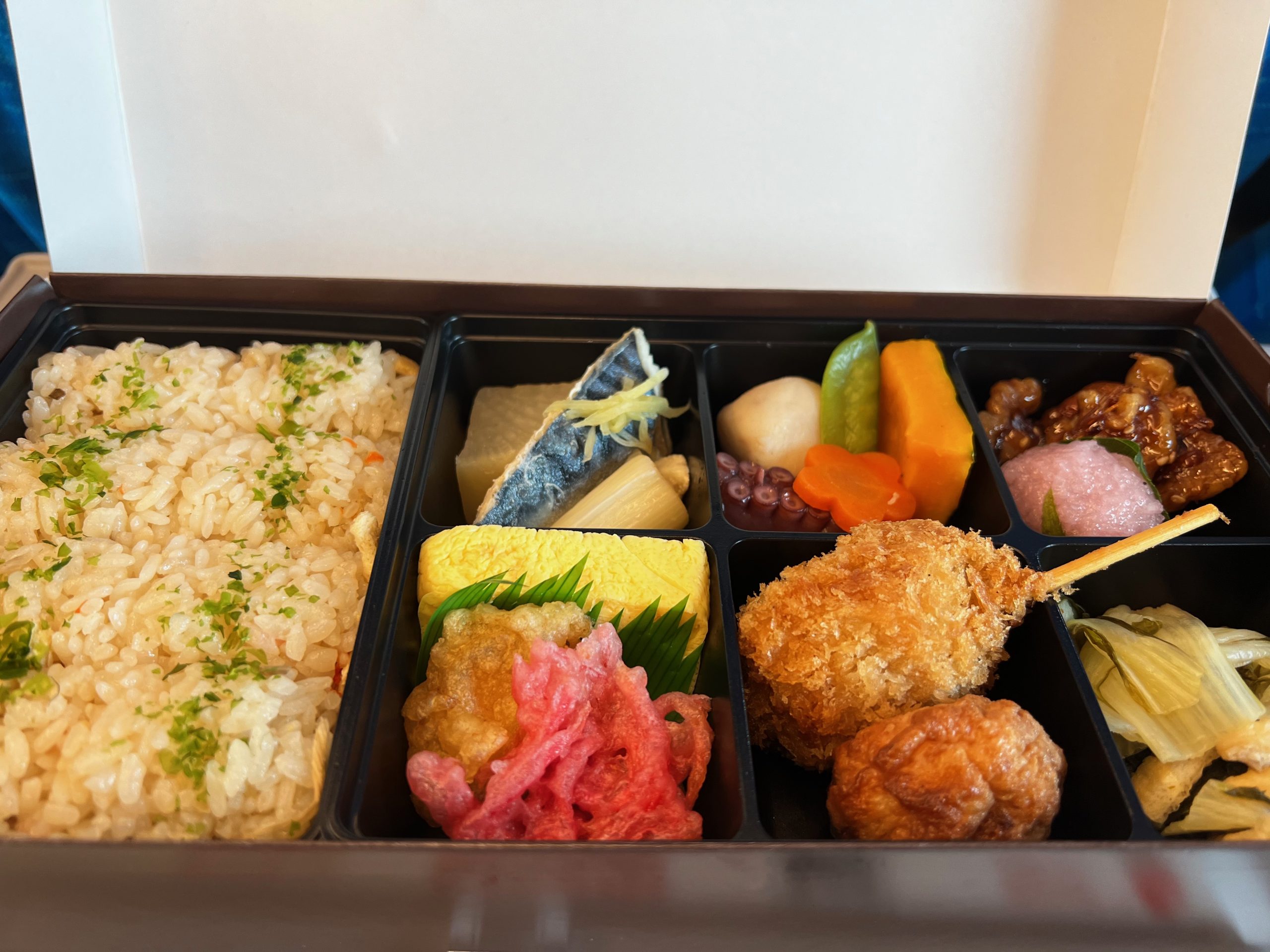 Pirms brauciena nopirkām ēdienu bento kastītēs, ja to ēd vilcienā, to sauc Eki Ben. Tās ir kā skaistas pusdienu kastītes, kur iekšā ir maz, bet dažāda veida ēdiens. Es pat nezinu kā to pareizi aprakstīt, varbūt no bildes labāk saprotams. Kas interesanti, viena no kastītēm bija aprakstīta kā silta. Izrādījās, ka tur bija jāizvelk tāds striķītis, kas sāknēja kaut kādu ķīmisko reakciju un kaste momentā sakarsa tik ļoti, ka pat sāka tvaikot.